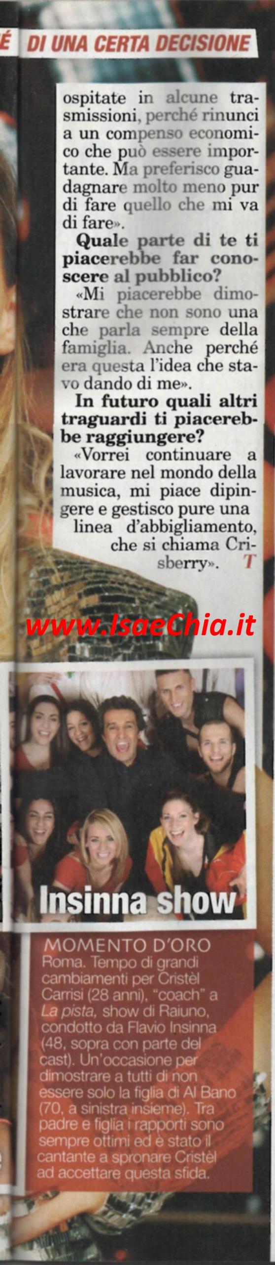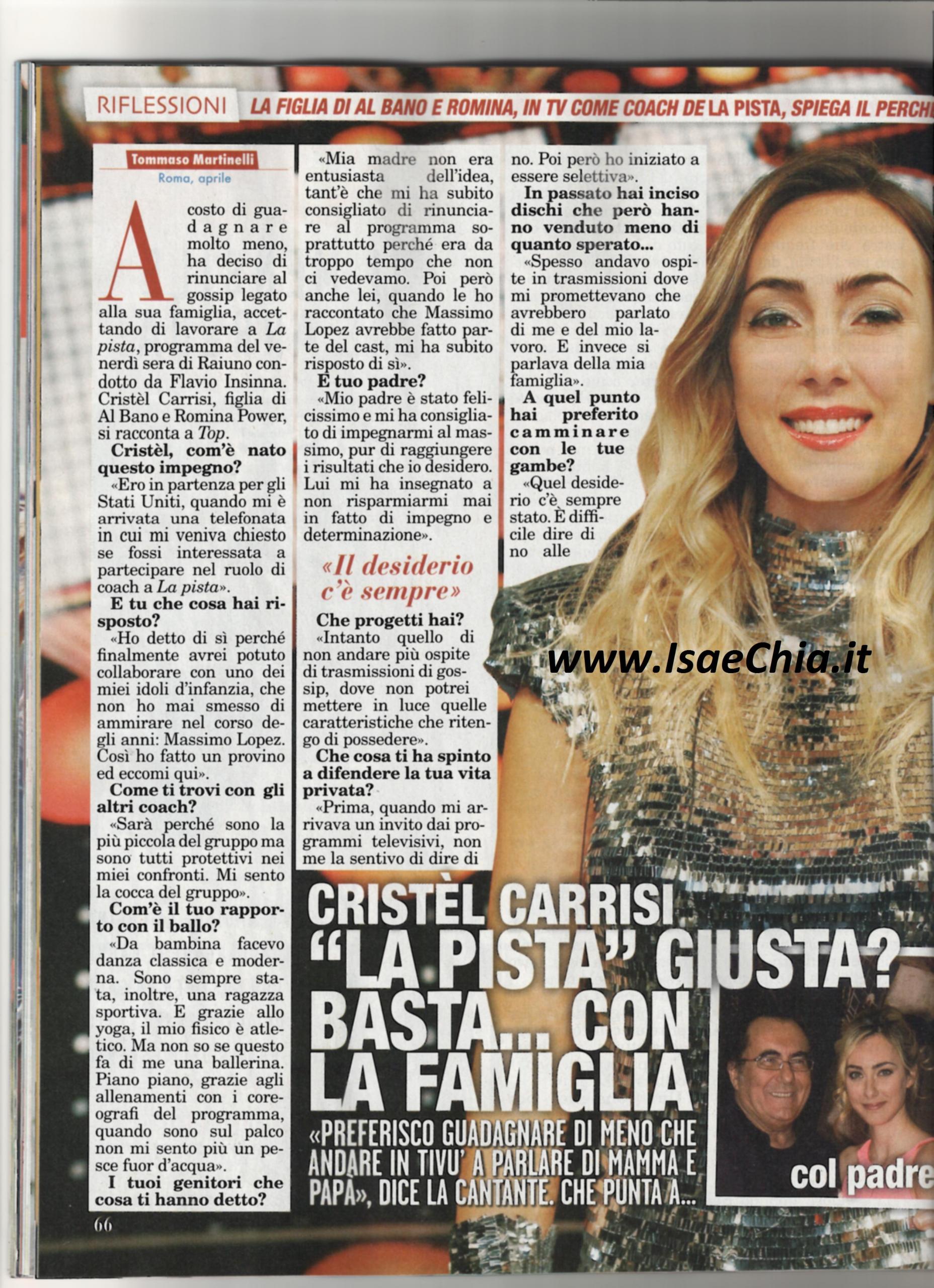 Cristèl Carrisi, figlia del cantante Al Bano, ha scelto di partecipare al programma La pista nel ruolo di coach: “Ero in partenza per gli Stati Uniti, quando mi è arrivata la telefonata per chiedermi se fossi interessata. Ho detto di sì perché avrei potuto finalmente collaborare con uno dei miei idoli d’infanzia: Massimo Lopez. Così ho fatto un provino ed eccomi qua. Gli altri coach? Sarà perché sono la più piccola, ma sono tutti protettivi con me. Da bambina facevo danza classica e moderna e sono sempre stata una ragazza sportiva. Grazie allo yoga il mio fisico è atletico, ma non so se questo fa di me una ballerina. Piano piano, grazie agli allenamenti dei coreografi non mi sento più un pesce fuor d’acqua. Mia madre Romina Power non era entusiasta all’idea, mi ha subito consigliato di rinunciare al programma soprattutto perché era da parecchio tempo che non ci vedevamo. Poi però anche lei, quando ha saputo che c’era Lopez, ha subito detto di sì! Mio padre è stato felicissimo e mi ha consigliato di impegnarmi al massimo per raggiungere i risultati che desidero”. E quando le si chiede che progetti ha, risponde: “Intanto quelli di non andare in trasmissioni di gossip, dove non potrei mettere in luce le caratteristiche che ritengo di possedere. Prima non me la sentivo di dire di no, ora sono diventata selettiva. Mi promettevano che avrei parlato di me e del mio lavoro, invece si parlava della mia famiglia. E’ difficile dire di no perché rinunci ad un compenso economico che può essere importante, ma preferisco guadagnare molto meno e fare quello che mi piace nella vita. Mi piacerebbe dimostrare che non sono una che parla solo della sua famiglia: era questa l’idea che stavo dando di me. Poi vorrei continuare a lavorare nel mondo della musica, mi piace dipingere e gestisco una linea d’abbigliamento”.