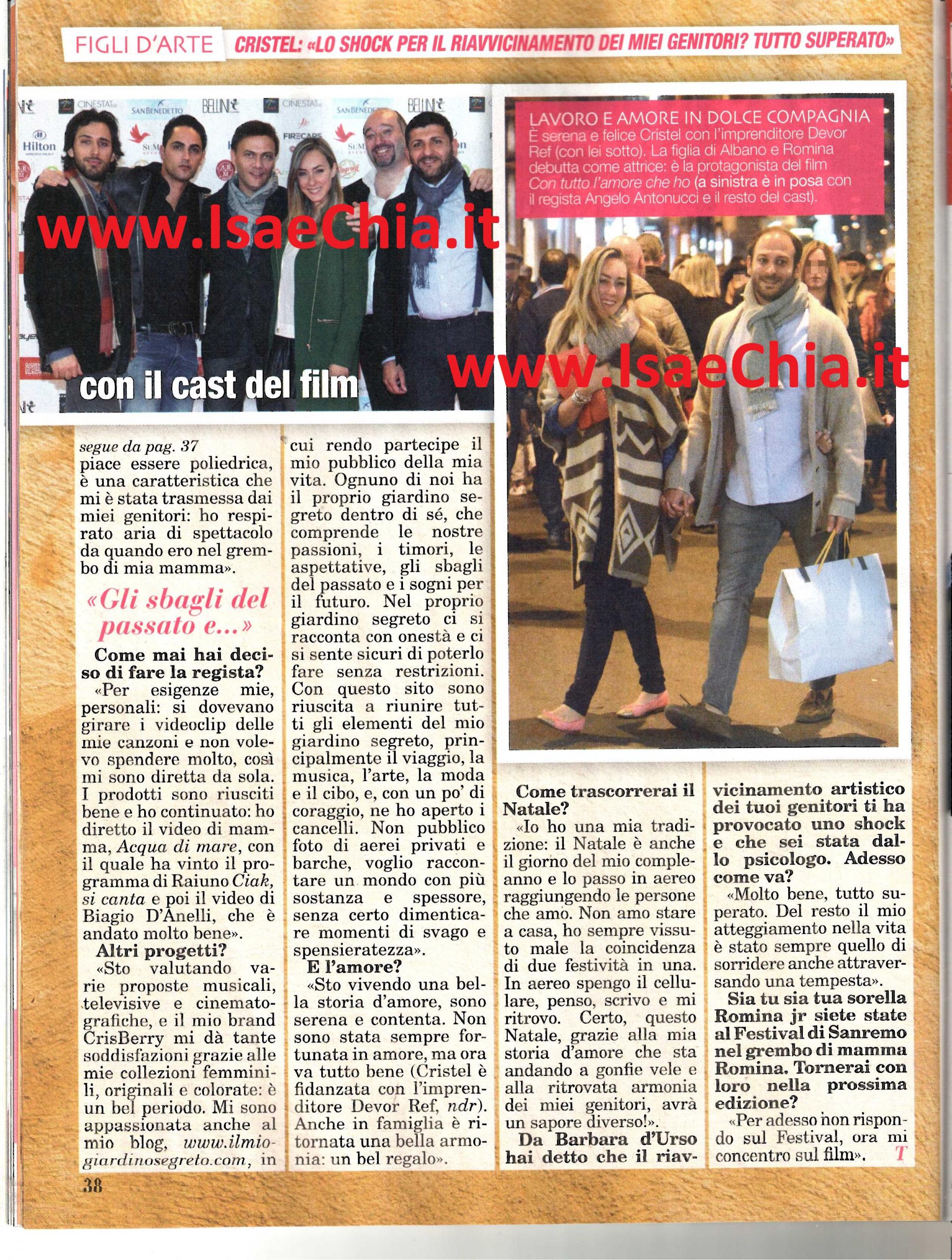 La reunion di Al Bano e Romina Power, dopo anni di rancori seguiti alla loro separazione, ha fatto contenti tanti fan della coppia storica, ma soprattutto ha reso felice Cristel Carrisi, figlia dei due cantanti, che, nel frattempo, debutta come attrice nel film Con tutto l’amore che ho: “Interpreto Lisa, una giovane attrice che si trova a fare i conti con le aggressioni verbali, le minacce e i comportamenti aggressivi del suo ex fidanzato: un caso di stalking raccontato con lucidità, senza sconti e tenendo presenti i fatti di cronaca. Lisa frequenta l’Accademia e sta mettendo in scena l’Otello di Shakespeare, considerato il primo caso di stalking della letteratura. Sul palcoscenico, Lisa troverà un nuovo amore, che rischia di rivelarsi fatale quando l’ex lo scopre. Una storia tremenda e dal finale a sorpresa, che innesca delle riflessioni sul piano sociale e psicologico. Ho accettato subito perché sono vicina alla problematiche femminili in genere. Ogni cosa che faccio deve avere un contenuto, un messaggio. Vorrei aprire gli occhi delle donne sullo stalking e spingerle a ribellarsi contro i comportamenti sbagliati dei loro uomini. Nel film, poi, c’è un dramma nel dramma, perché mia mamma, interpretata da Barbara De Rossi, è un’alcolizzata“. Quando le si fa notare che in quanto cantante, regista e blogger, ha sperimentato varie forme d’arte, Cristel risponde: “Credo che un artista debba spaziare a 360 gradi: la mia mente è un fiume in piena e fin da piccola ho sentito l’esigenza di esprimermi attraverso più forme d’arte. Ho deciso di fare la regista per esigenze mie: volevo dei videoclip per le mie canzoni e non volevo spendere molto, così mi sono diretta da sola. Poi ho diretto il video di mia madre, Acqua di mare e quello dell’ex gieffino Biagio D’Anelli. Sto valutando varie proposte professionali e musicali, il mio brand CrisBerry mi dà soddisfazioni e mi sono appassionata al mio blog, Il mio giardino segreto. Inoltre, sto vivendo una bella storia d’amore (con l’imprenditore Devor Ref); non sono sempre stata fortunata, ma ora sono serena e contenta“. Infine, quando le si chiede se passerà il Natale in famiglia, risponde: “Il Natale è anche il giorno del mio compleanno e lo passo sempre in aereo raggiungendo le persone che amo: non amo stare a casa e la coincidenza delle due feste. In aereo spengo il cellulare, penso, scrivo e mi ritrovo. Certo, questo Natale, anche grazie alla ritrovata armonia tra i miei, avrà un sapore diverso. Lo shock che mi aveva causato all’inizio il loro avvicinamento mi è passato, va tutto bene adesso. Del resto il mio atteggiamento è sempre stato di sorridere, anche nella tempesta”.