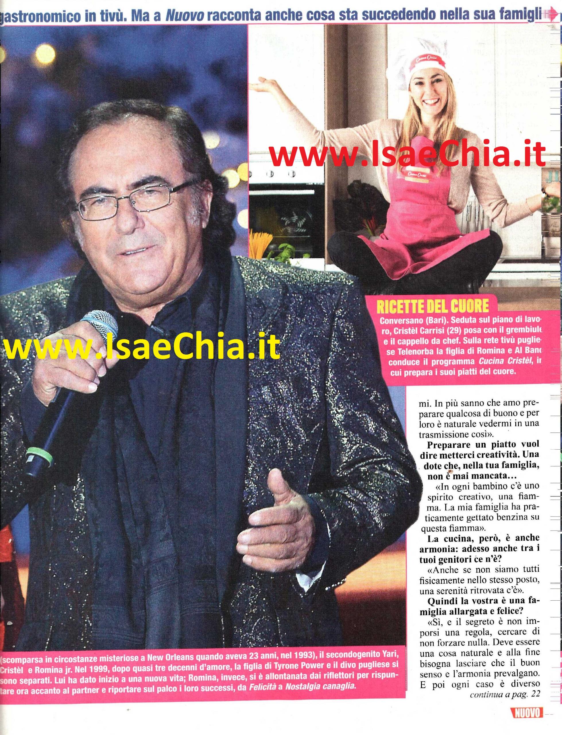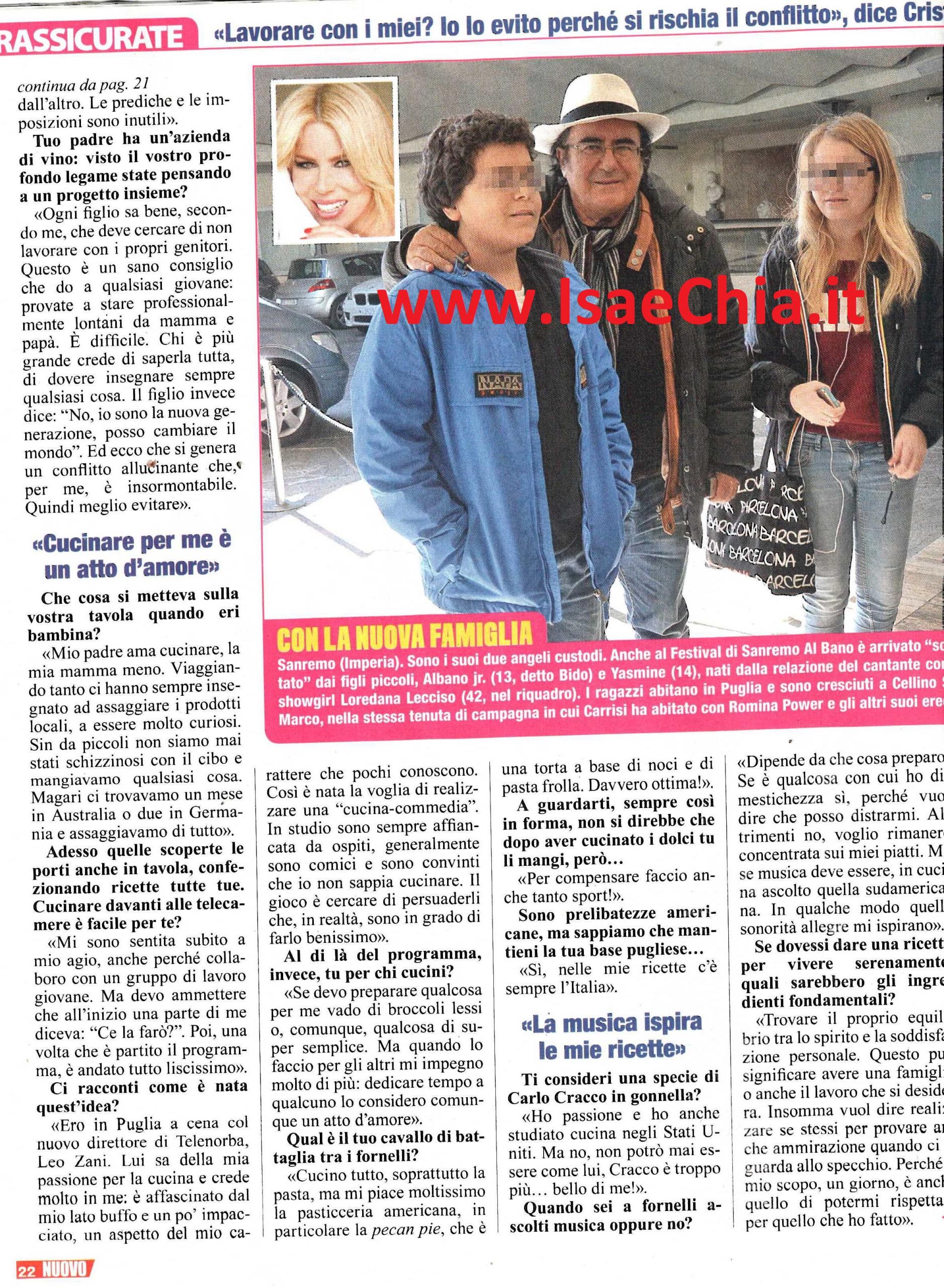 Dopo aver seguito un corso da chef negli Stati Uniti, Cristèl Carrisi, terzogenita di Al Bano e Romina Power, è ora su Telenorba, la rete locale della sua Puglia, con il programma Cucina Cristèl. Tuttavia, lei è una sostenitrice della fantasia in cucina e dice: “Le cose belle e naturali vengono da sé“. Così, quando le si chiede se anche la riappacificazione tra i suoi genitori, che dopo anni dal loro divorzio sono tornati a cantare insieme è una cosa bella avvenuta da sé, lei risponde: “E’ fuori tema. Io e i miei fratelli abbiamo già i nostri casini e non andiamo certo a mettere bocca in quelli degli altri“, eludendo così ogni riferimento ai suoi. Piuttosto, i suoi genitori sono stati importanti nella realizzazione di questo nuovo progetto: “Hanno sempre saputo della mia passione per la cucina e conoscono la mia determinazione. Non so stare con le mani in mano, ho bisogno di un progetto su cui concentrarmi. In più sanno che amo preparare qualcosa di buono e per loro è normale vedermi in una trasmissione così. La creatività non è mai mancata nella nostra famiglia e loro hanno sempre gettato benzina sulla mia fiamma. Anche se non siamo tutti nello stesso posto, c’è una ritrovata serenità tra di noi. Siamo una famiglia felice e il segreto è non imporsi una regola, non cercare di forzare nulla. Deve essere una cosa naturale e lasciare che il buon senso e l’armonia prevalgano. E poi ogni caso è diverso dall’altro e le prediche e le imposizioni sono inutili. Mio padre ama cucinare, mia mamma meno. Viaggiando, ci hanno sempre insegnato ad assaggiare i prodotti locali, ad essere curiosi e non siamo mai stati schizzinosi, assaggiavamo qualsiasi cosa” racconta lei. Così, quando le si chiede com’è nata l’idea di un programma tv, spiega: “Ero in Puglia a cena con il nuovo direttore di Telenorba, Leo Zani. Lui sa della mia passione per la cucina e crede in me: è affascinato dal mio lato buffo e impacciato, così è nata l’idea di realizzare una cucina-commedia. In studio sono sempre affiancata da ospiti, in genere comici o convinti che io non sappia cucinare!“. Infine, quando le si chiede del suo rapporto con la cucina nella vita privata, risponde: “Se devo preparare qualcosa solo per me, vado con i broccoli lessi o comunque qualcosa di semplice, mentre se lo faccio per gli altri mi impegno molto di più: considero dedicare del tempo a qualcuno un atto d’amore. Cucino tutto, soprattutto la pasta, ma mi piace moltissimo la pasticceria americana. Preparo e mangio molti dolci, ma in compenso faccio molto sport! Se cucino qualcosa con cui ho dimestichezza, ascolto la musica, soprattutto le sonorità sudamericane, perché posso distrarmi. Altrimenti no, perché voglio rimanere concentrata sui miei piatti. Gli ingredienti per vivere serenamente? Trovare il proprio equilibrio, la propria soddisfazione personale. Questo può significare avere una famiglia o un lavoro che si desidera. Insomma, realizzare se stessi e provare ammirazione quando ci si guarda allo specchio. Perché il mio scopo, un giorno, è anche potermi rispettare per quello che ho fatto“.