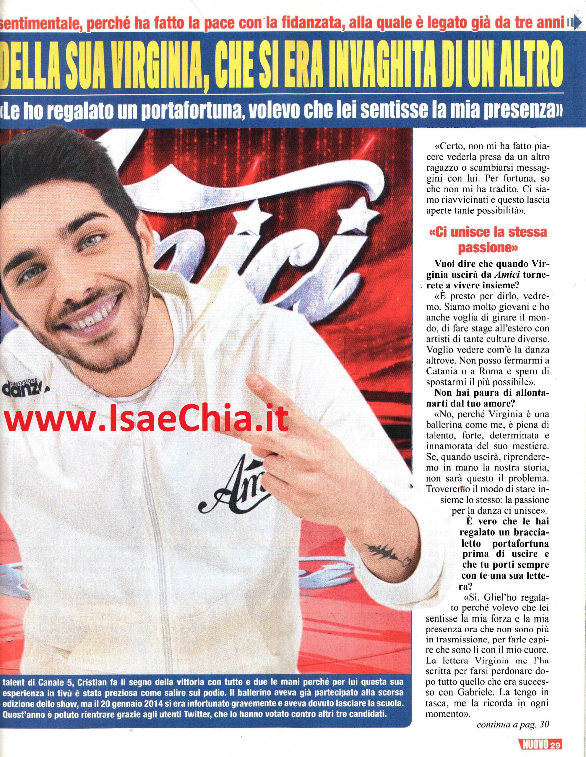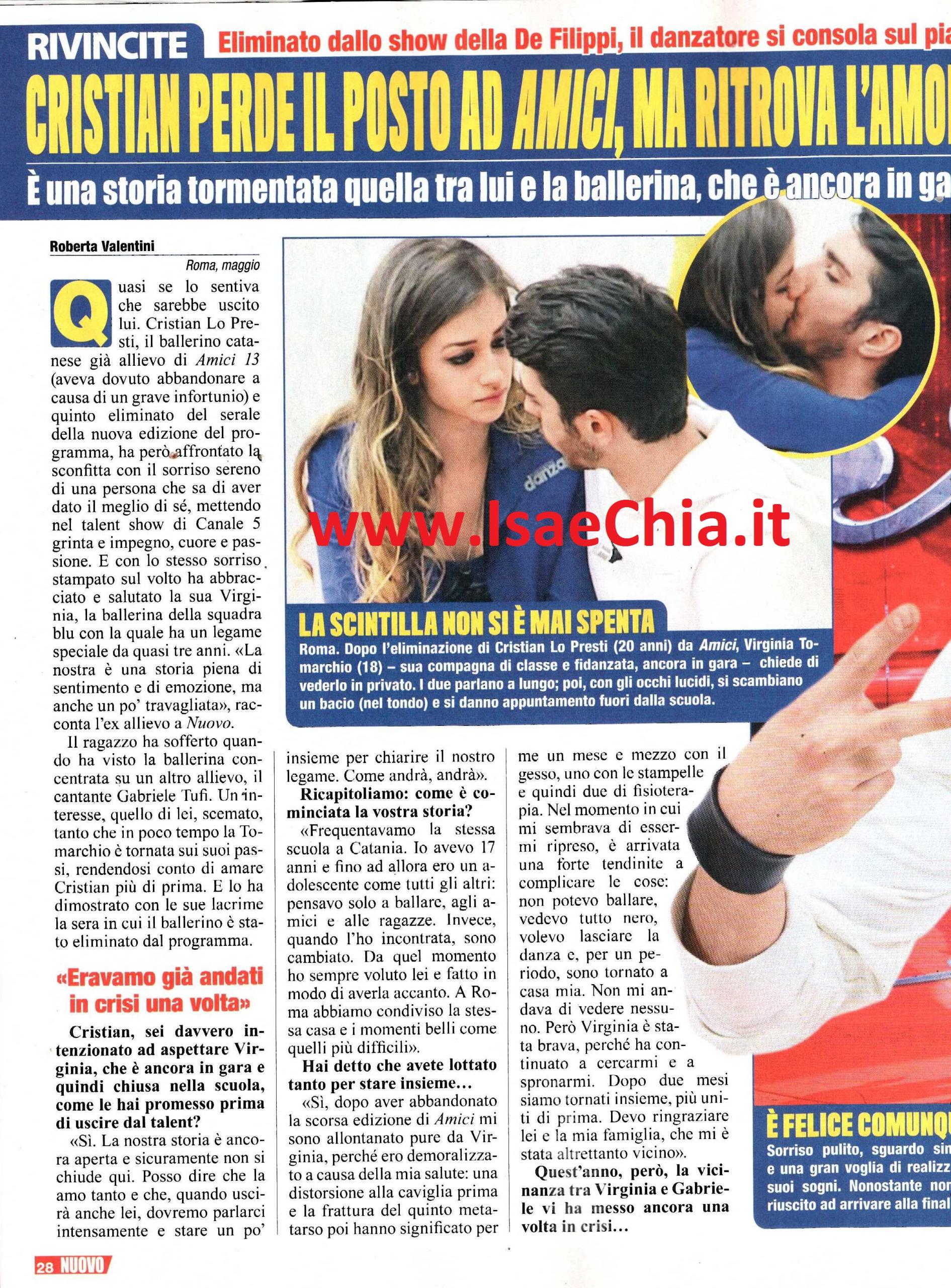 La storia tra Virginia Tomarchio e Cristian Lo Presti ha attirato molto gli spettatori di Amici, soprattutto quando la ballerina si è concentrata sul cantante Gabriele Tufi e poi è tornata sui suoi passi, rendendosi conto di amare Cristian più di prima. Cosa che ha dimostrato con le sue lacrime quando il ballerino è stato eliminato dal programma. Intervistato, il bel ventenne racconta: “La nostra storia è ancora aperta e sicuramente non si chiude qui. Posso dire che la amo tanto e che quando uscirà anche lei, dovremo parlarci intensamente e stare un po’ insieme per chiarire il nostro legame. Come andrà, andrà. Frequentavamo la stessa scuola a Catania. Io avevo 17 anni, pensavo solo a ballare, agli amici e alle ragazze. Quando l’ho incontrata, sono cambiato. Da quel momento ho sempre voluto lei e fatto in modo di averla accanto. A Roma abbiamo condiviso la stessa casa e i momenti più belli, come quelli più difficili. Dopo aver abbandonato la scorsa edizione di Amici a causa di un infortunio, mi sono allontanato pure da Virginia perché ero demoralizzato a causa della mia salute. La distorsione della caviglia e una frattura poi hanno significato un mese e mezzo col gesso e due di fisioterapia. Poi, una forte tendinite. Non potevo ballare, vedevo tutto nero, non volevo vedere nessuno e volevo lasciare la danza.Virginia è stata brava perché ha continuato a cercarmi e spronarmi. Dopo due mesi siamo tornati insieme, più uniti di prima. Nella scuola, però, non mi ha fatto piacere vederla presa da un altro e scambiarsi dei messaggi con lui. Per fortuna, so che non mi ha tradito. Ci siamo riavvicinati e questo lascia aperte tante possibilità. Non so se quando finirà Amici torneremo a vivere insieme: siamo giovani, abbiamo voglia di girare il mondo e fare esperienze diverse. Voglio vedere com’è la danza altrove, non posso fermarmi a Roma e Catania. Non ho paura di allontanarmi da lei: lei è una ballerina come me, è piena di talento, forte, determinata e innamorata del suo mestiere. Se quando uscirà riprenderemo in mano la nostra storia, non sarà un problema: troveremo il modo di stare insieme lo stesso. Prima di uscire le ho regalato un braccialetto per farle sentire la mia presenza ora che non sono più nella trasmissione. Lei invece mi ha scritto una lettera per farsi perdonare di ciò che è successo con Gabriele e io la tengo in tasca, me la ricorda in ogni momento“. Quando gli si chiede come ha vissuto l’eliminazione, Cristian risponde: “Non so perché, ma ne avevo il presentimento. Non perché pensassi di valere meno degli altri, anzi, in quella settimana ho dato il massimo. Sono sereno, anche se mi dispiace aver dovuto salutare tutti. Ora non mi adagio sugli allori, riprendo da dove ho lasciato e ricomincio a studiare e lavorare, ma dico grazie ad Amici e alla possibilità che mi ha dato di conoscere tanti artisti speciali“. E, a proposito, il ballerino ne approfitta per ringraziare: “Giuliano Peparini mi è sempre stato accanto, cercando di fare uscire il meglio da me. Mi ha fatto capire ancora di più quanto la danza sia sacrificio e passione, determinazione e perfezione. Emma Marrone è stata spettacolare e non rimpiango di averla scelta come coach. Ha fatto emergere il lato di me che era nascosto, mi ha fatto diventare più sicuro di me, mi ha spronato e mi ha fatto tirare fuori gli attributi, proprio quello che cercavo. Maria De Filippi mi ha dato tanti consigli, è un po’ come una mamma, ma anche una professionista che è presente in ogni circostanza e tira su il morale a tutti. Adesso spero di diventare un artista in grado di emozionare sempre chi mi guarda. Spero di potermi esibire in un musical, magari in una delle opere di Peparini, che per me sono le migliori!“