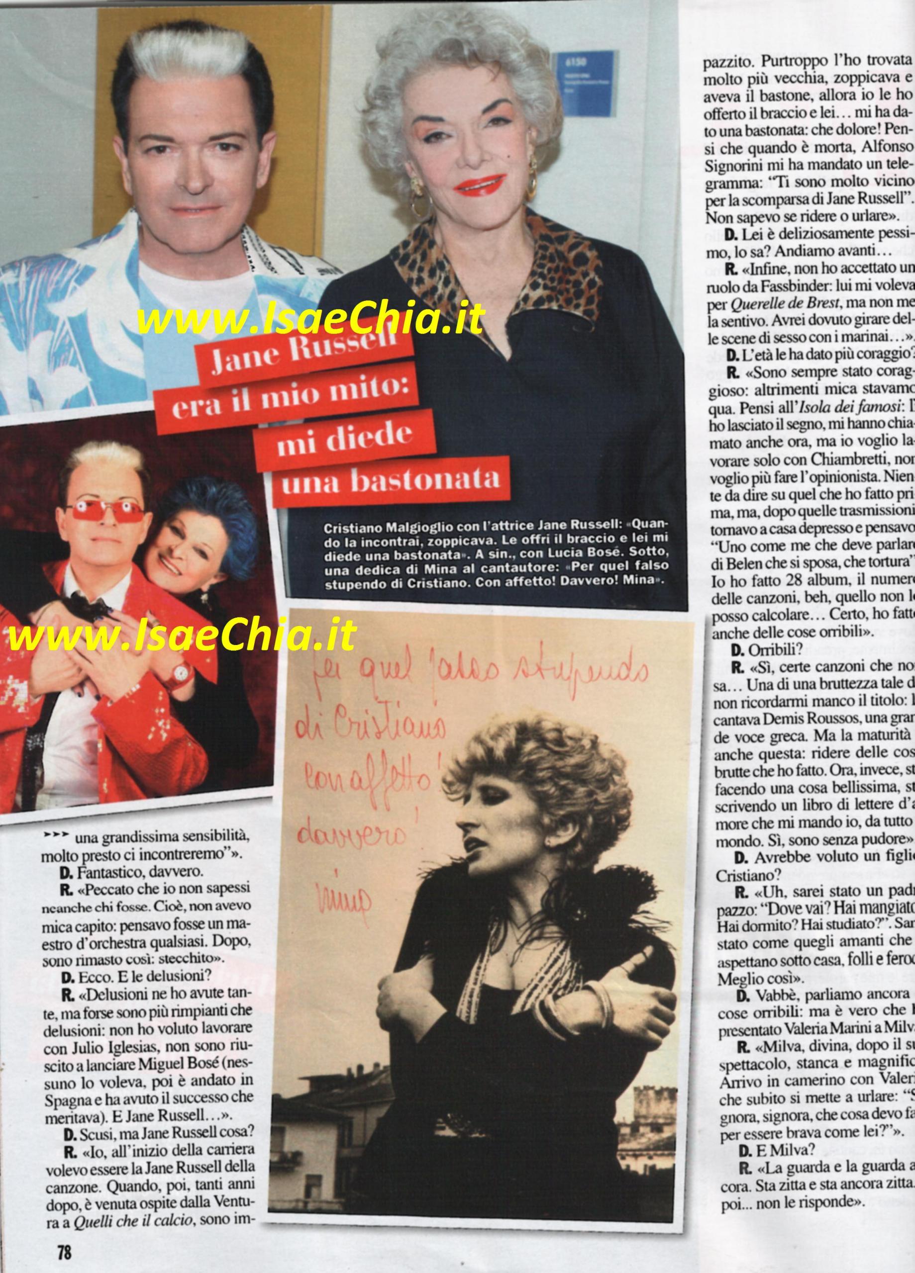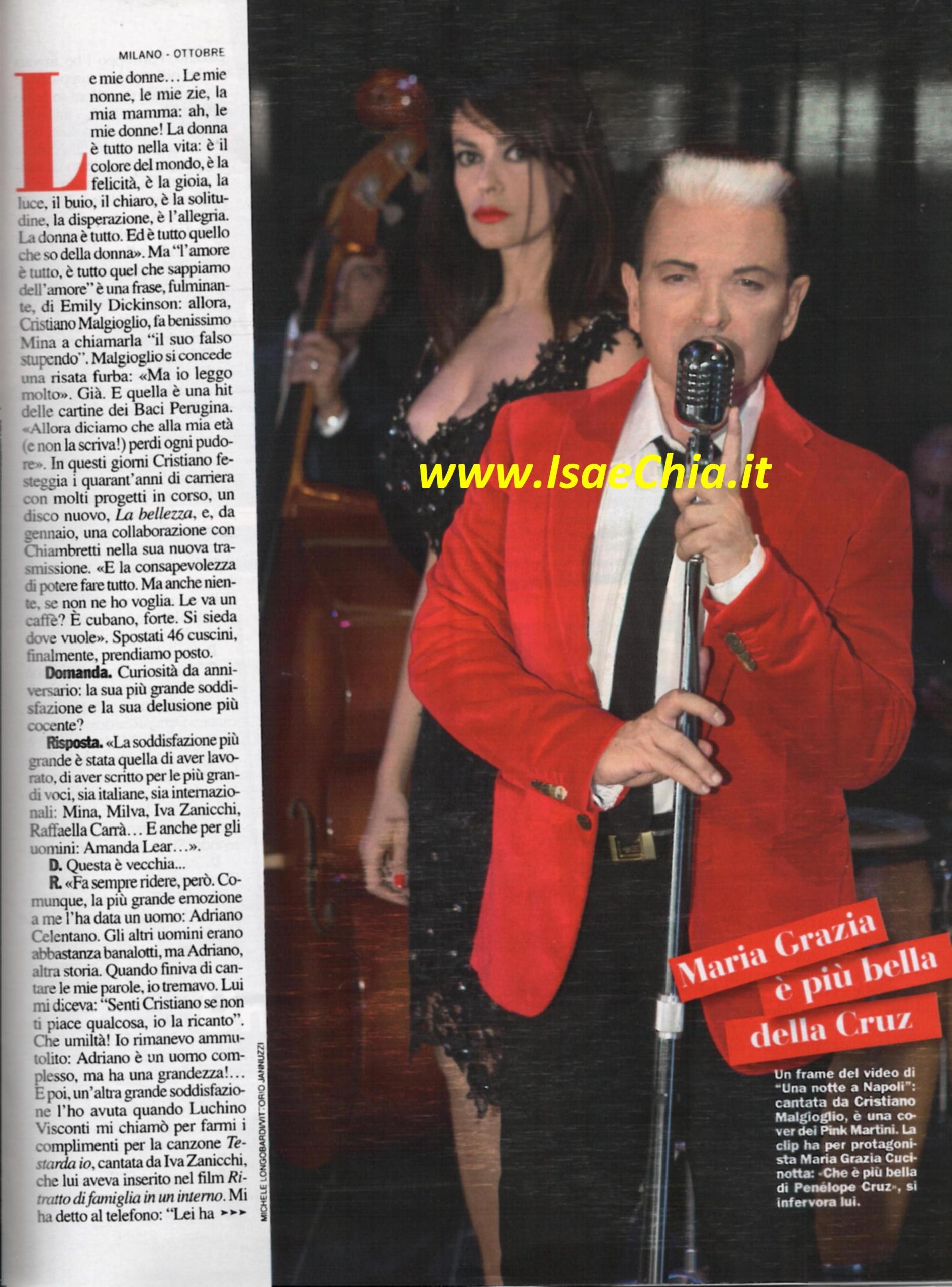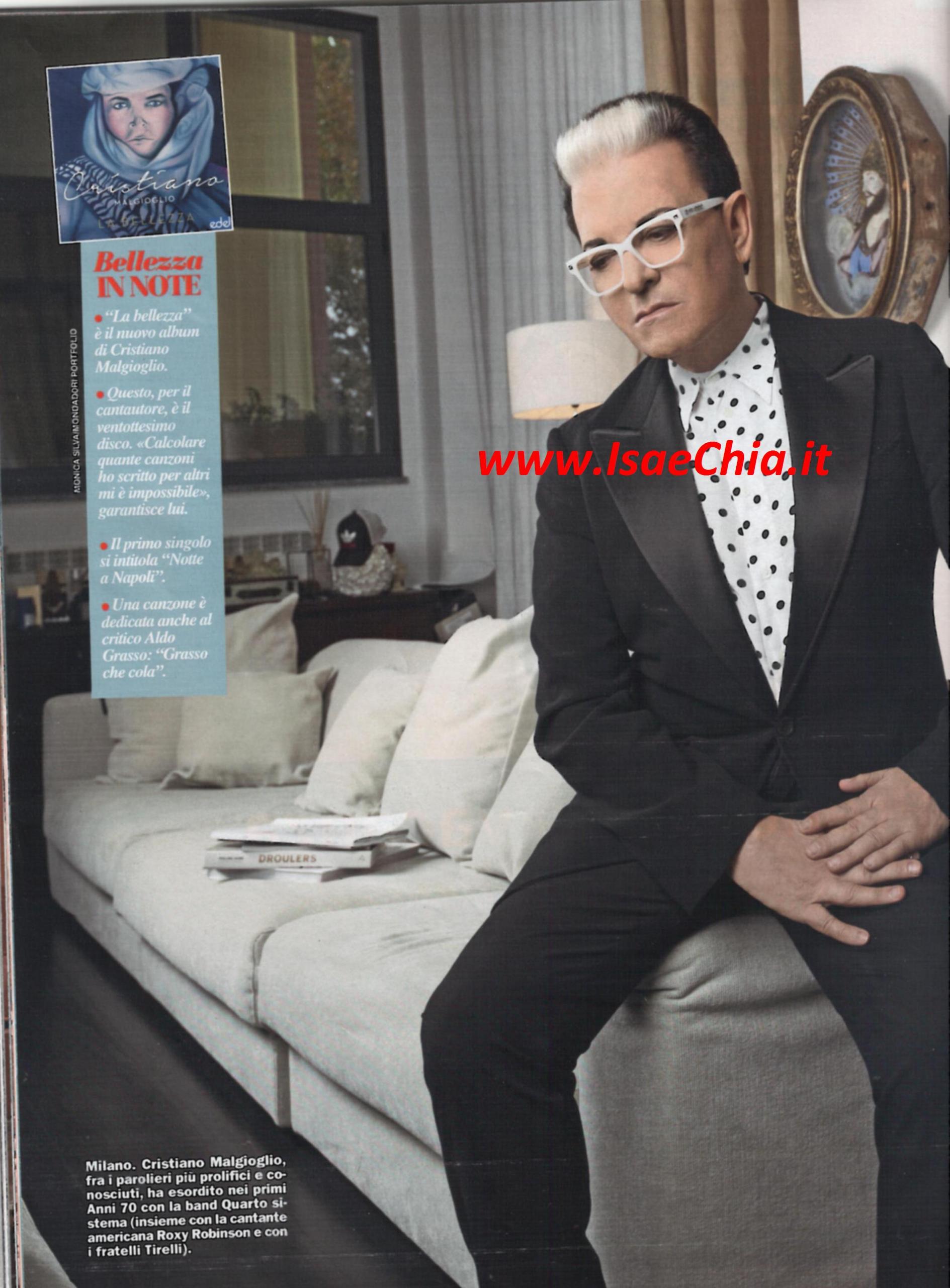 Quest’anno il cantautore Cristiano Malgioglio festeggia i suoi primi quarant’anni di carriera e lo fa con un nuovo album, La bellezza, e un bilancio: “La soddisfazione più grande è stata aver lavorato e aver scritto per le più grandi voci italiane e internazionali: Mina, Milva, Iva Zanicchi, Raffaella Carrà…E anche per gli uomini: Amanda Lear…! Lo so, è una battuta vecchia, ma fa sempre ridere! Comunque, l’emozione più grande me l’ha data un uomo: Adriano Celentano. Quando finiva di cantare le mie parole, io tremavo. Lui mi diceva: “Se non ti piace qualcosa, io la ricanto”. che umiltà! Io rimanevo ammutolito. Poi, un’altra grande soddisfazione l’ho avuta quando il regista Luchino Visconti mi ha chiamato per farmi i complimenti per Testarda io, che aveva inserito nel film Ritratto di famiglia in un interno.Mi ha detto: “Lei ha una grandissima sensibilità, molto presto ci incontreremo”. Peccato che io non sapessi neanche chi fosse! Pensavo fosse n maestro d’orchestra qualsiasi! Dopo sono rimasto stecchito! Delusioni ne ho avute tante, ma più rimpianti: non ho voluto lavorare con Julio Iglesias, non sono riuscito a lanciare Miguel Bosé: nessuno lo voleva, poi è andato in Spagna e ha avuto il successo che meritava…E Jane Russell: all’inizio della carriera io volevo essere la Jane Russell della canzone. Quando poi l’ho incontrata, a Quelli che il calcio, sono impazzito: era vecchia, zoppicava, io le ho offerto il braccio e lei mi ha dato una bastonata! E poi non ho accettato un ruolo da Fassbinder…E dire che avrei dovuto girare delle scene di sesso con i marinai! Sono sempre stato coraggioso: pensi all’Isola dei famosi! Lì ho lasciato il segno e mi hanno chiamato anche ora, ma io voglio lavorare solo con Piero Chiambretti, non voglio più fare l’opinionista. Tornavo a casa depresso e pensavo: “Uno come me che parla di Belén Rodriguez che si sposa! Io ho fatto 28 album!” . Certo, ho fatto anche canzoni orribili, come una di cui non ricordo neanche il titolo, cantata da una voce greca: Demis Roussos“. Quando gli si chiede se è vero che ha presentato Valeria Marini a Milva, racconta: “Milva, divina dopo il suo spettacolo, era in camerino. Io arrivo con la Marini, che le grida: “Cosa devo fare per essere brava come lei?” e Milva la guarda, sta zitta e ancora zitta. E poi…Non le risponde”. Infine, gli si chiede se avrebbe voluto un figlio: “Sarei stato un padre pazzo: dove vai, hai mangiato? Come quegli amanti che ti aspettano a casa folli e feroci. Meglio così”.