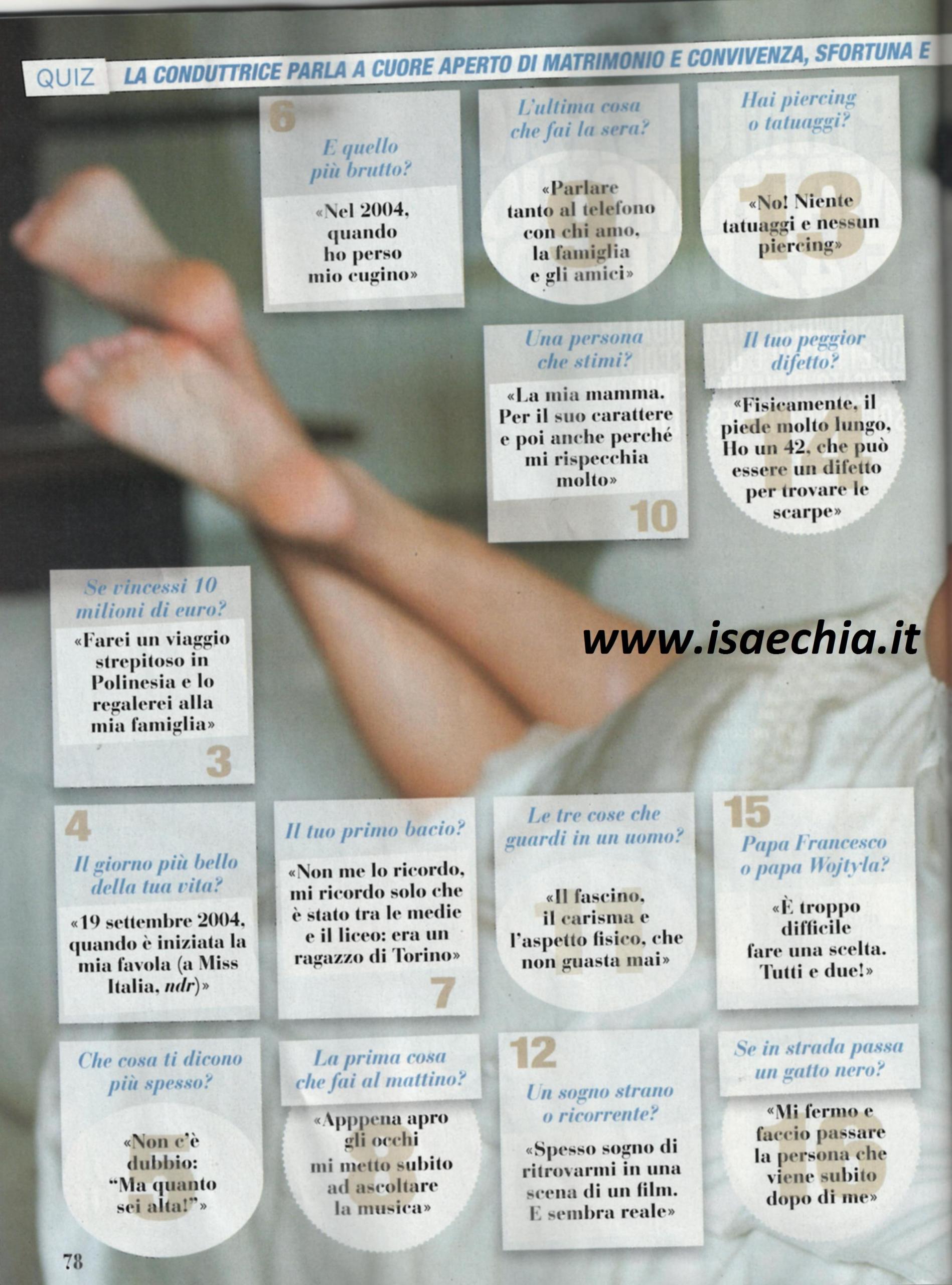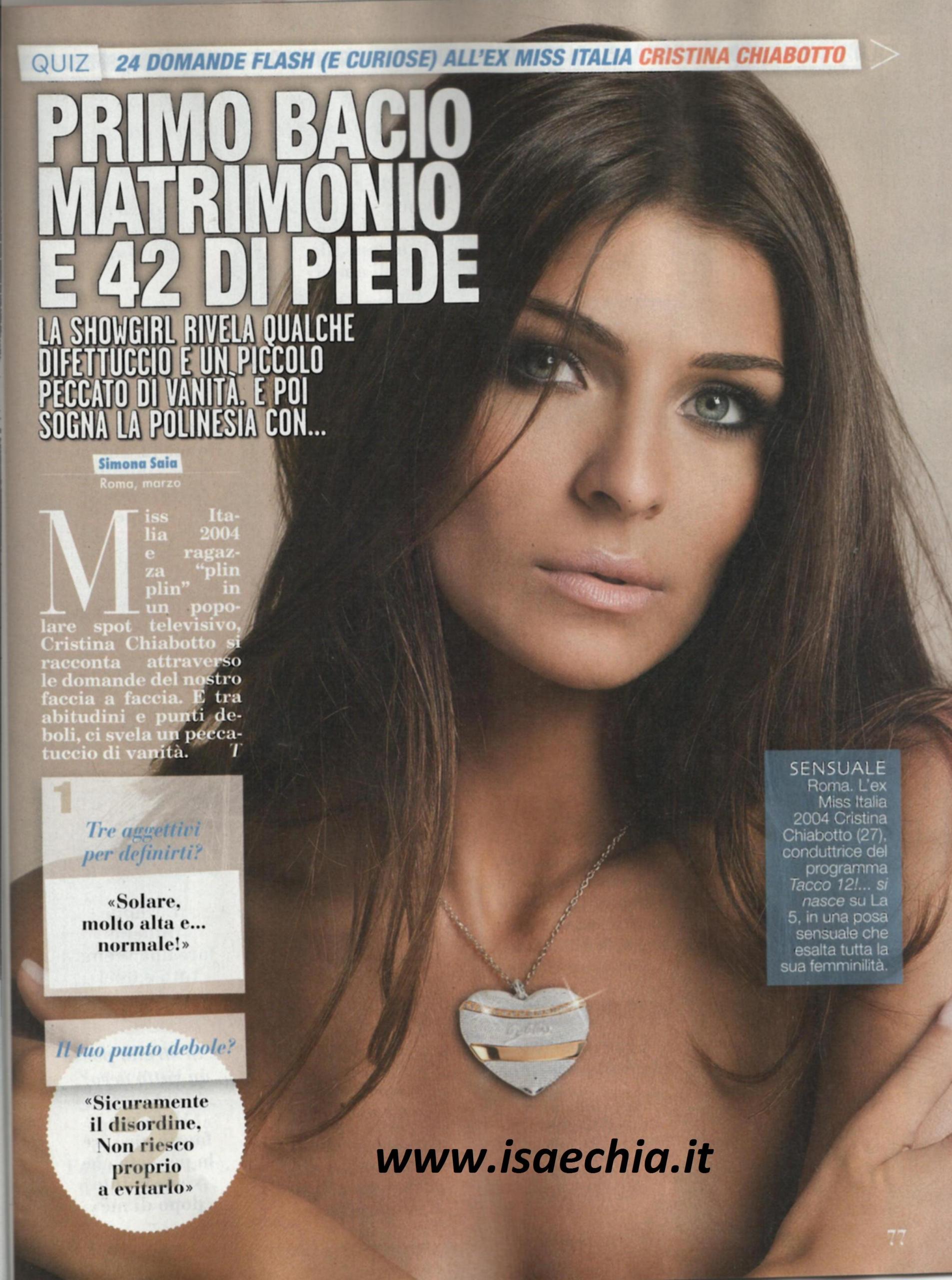 L’ex Miss Italia e vincitrice di Ballando con le stelle Cristina Chiabotto risponde a 25 domande “flash”. Dopo essersi definita solare, alta e “normale” e aver svelato di non riuscire ad evitare il disordine, svela il giorno più bello della sua vita: “Il 19 settembre 2004, quando è iniziata la mia favola con Miss Italia!”. E poi ancora: “Il primo bacio non lo ricordo, ricordo solo che è stato tra le medie e le superiori ed era un ragazzo di Torino. In un uomo guardo carisma e fascino, poi l’aspetto fisico. Mi affascina il paranormale e mi faccio stupire. Sono scaramantica e se passa un gatto nero attraversare la strada, lascio passare un’altra auto! La vacanza dei miei sogni sarebbe su un’isola deserta, col mio fidanzato Fabio Fulco. Matrimonio o convivenza? Dico che li scelgo tutti e due”. Quando le si chiede se si rifarebbe dal chirurgo, risponde: “Ho rifatto il seno e non l’ho mai negato. Per ora va bene così”. Infine, dichiara: “Nella vita i soldi e essere alla moda sono due cose che contano, ma più di tutto contano l’amore e i sentimenti in genere. Ciò che mi spaventa? Le malattie incontrollabili su cui l’uomo non ha potere”.