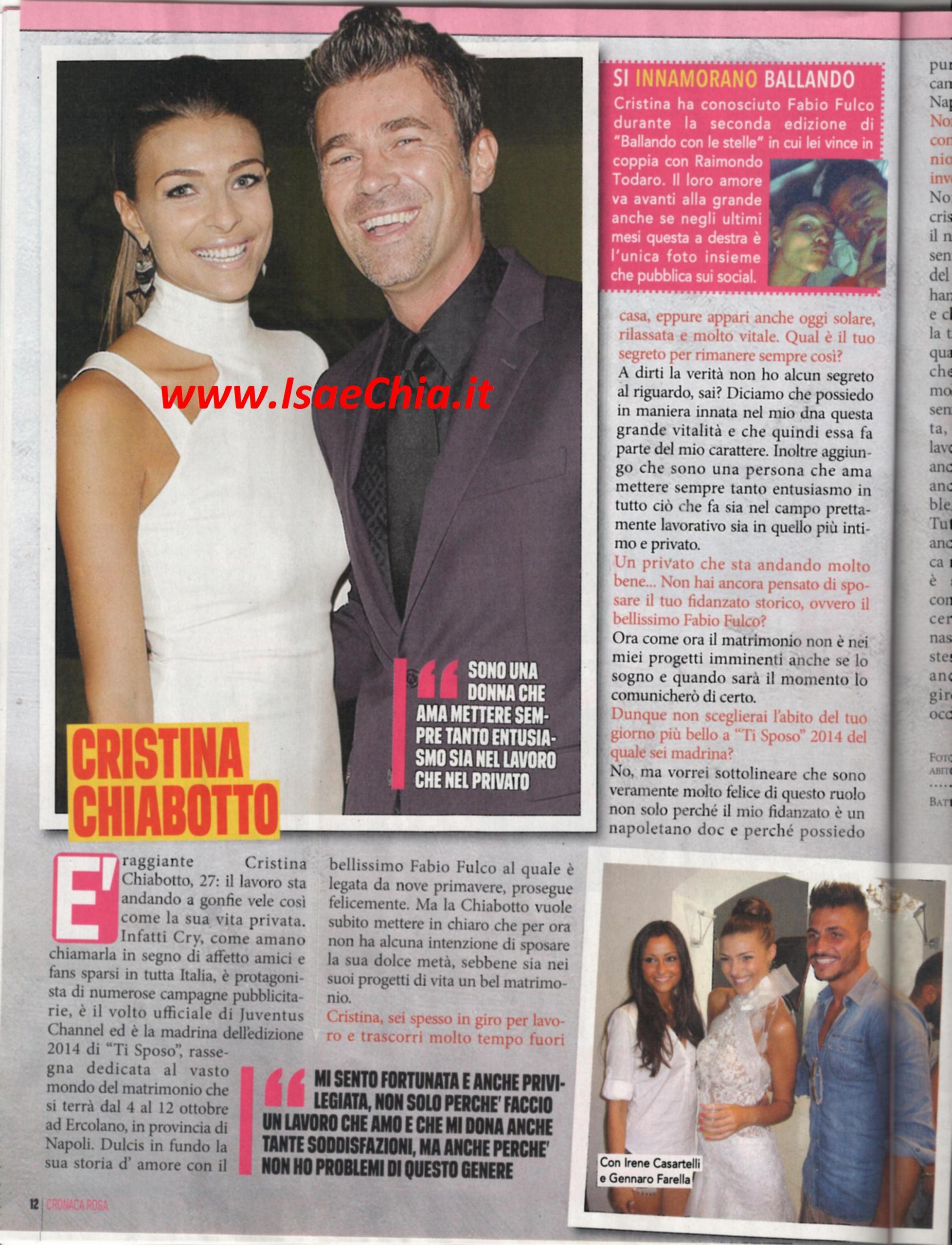 La bellissima ex Miss Italia Cristina Chiabotto sarà madrina dell’evento Ti sposo di Ercolano (NA) ad ottobre. Quando le si fa notare che è sempre in giro ed è sempre vitale e solare e le si chiede il suo segreto, risponde: “Non so quale sia il mio segreto, è innato. Possiedo questa vitalità nel mio dna e fa parte del mio carattere; mi piace mettere entusiasmo in ciò che faccio, in ciò che è lavorativo e nell’intimo”. E, a proposito della sua vita privata, quando le si chiede quando sposerà il suo fidanzato, l’attore Fabio Fulco, conosciuto nove anni fa a Ballando con le stelle, risponde: “Ora come ora il matrimonio non è tra i miei progetti imminenti, anche se sogno di coronare questo sogno e quando sarà il momento lo comunicherò di certo. Dunque non sceglierò l’abito durante l’evento Ti sposo, ma sono molto felice di questo ruolo, non solo perché il mio fidanzato è napoletano doc. Molti giovani non sono favorevoli al matrimonio, perché in questo tempo di crisi hanno un grande sentimento di sfiducia nei confronti del futuro e se hanno paura di ciò che stanno vivendo, come possono avere la tranquillità necessaria per costruire un futuro con la persona che amano? Inoltre sposarsi costa molto. Io da questo punto di vista sono fortunata e privilegiata, perché faccio un lavoro che amo e che mi dà soddisfazioni e non ho problemi. Ma anche se una tematica non ti appartiene, non si può andare in giro con gli occhi bendati!”