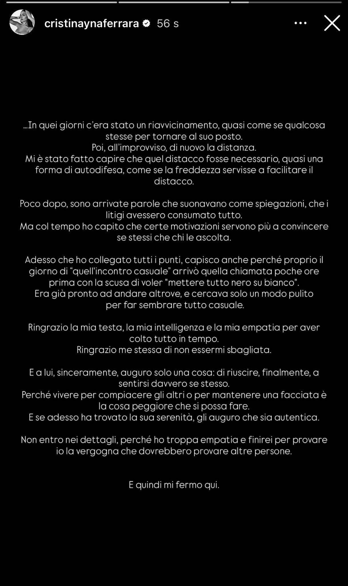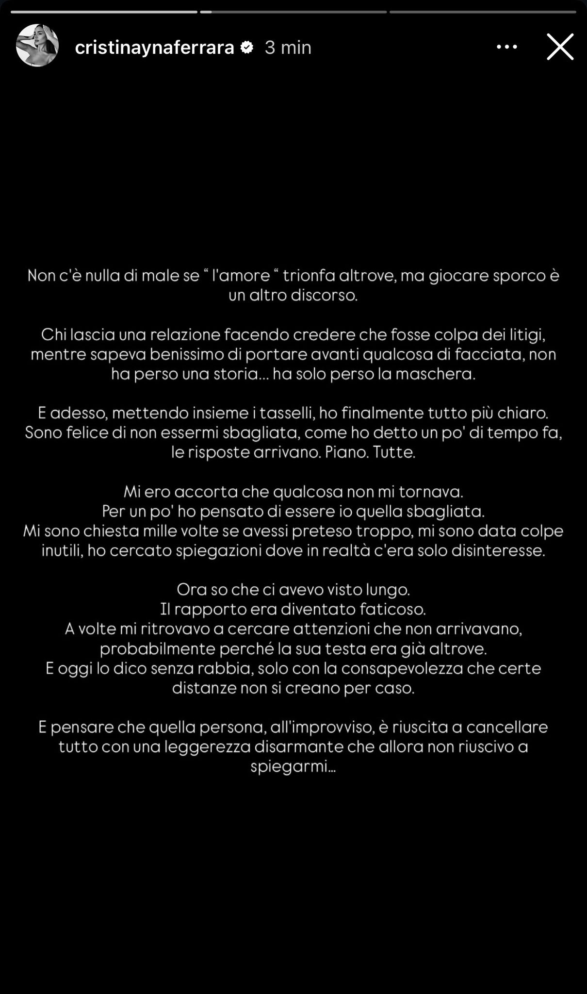 Questi alcuni dei passaggi del lunghissimo sfogo social di Cristina (che potete leggere per intero scorrendo gli screen):