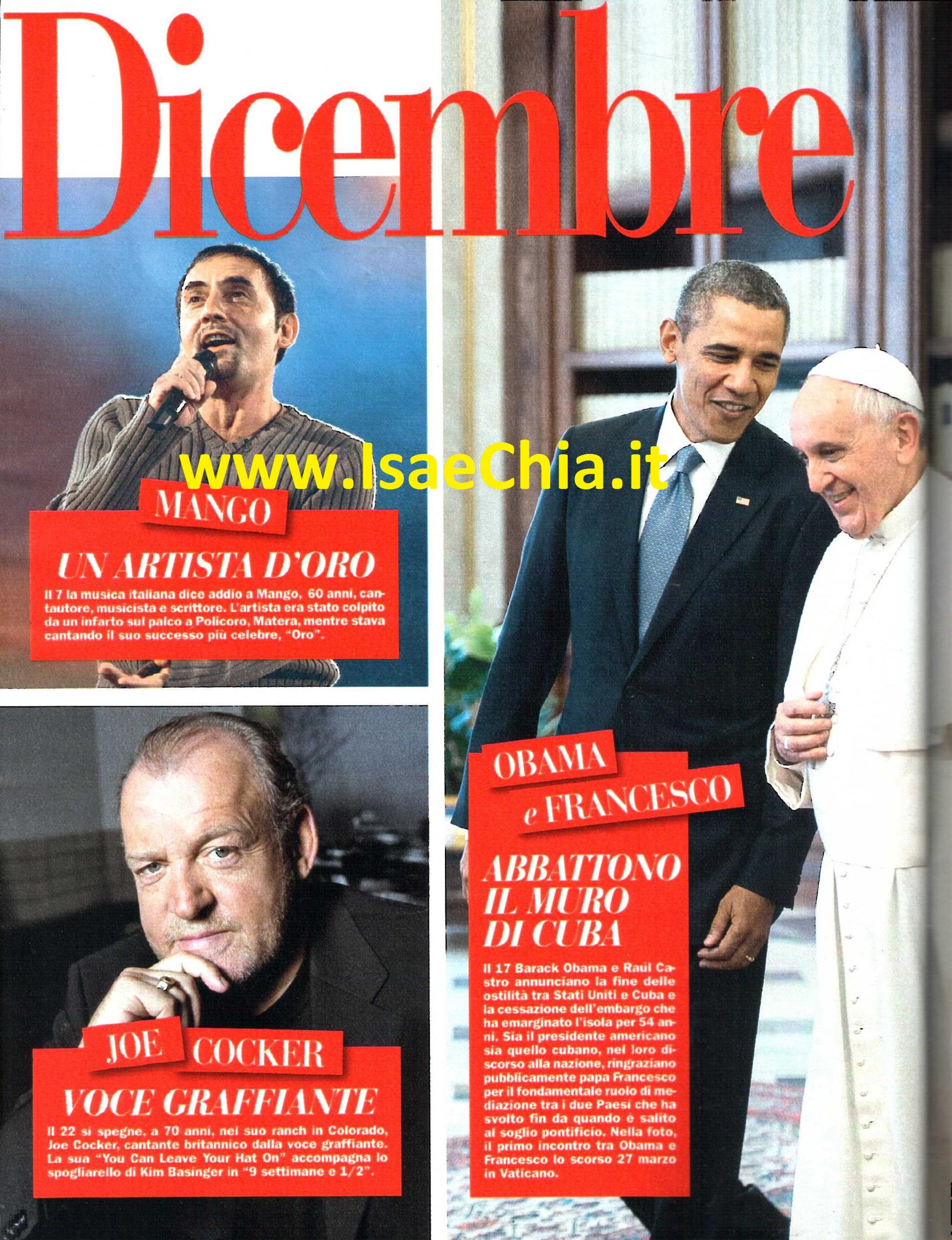 Il 2014, però, si è concluso con alcune tristi notizie. Nel mese di dicembre, infatti, sono mancati due personaggi italiani molto amati: il cantante Mango, colpito da un infarto a 60 anni durante un concerto, e l’attrice Virna Lisi, prima diva del cinema, poi del piccolo schermo, che aveva appena compiuto 78 anni.