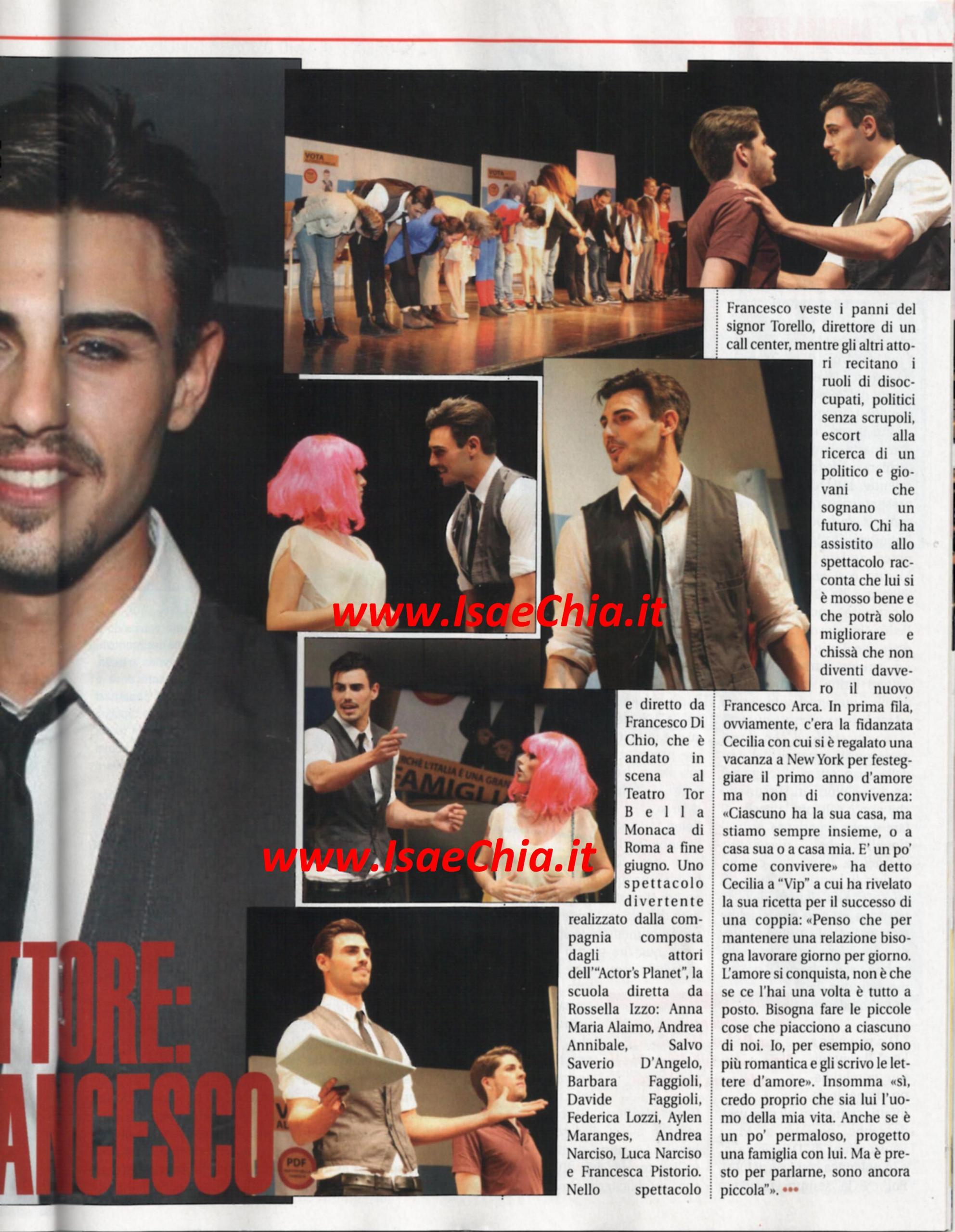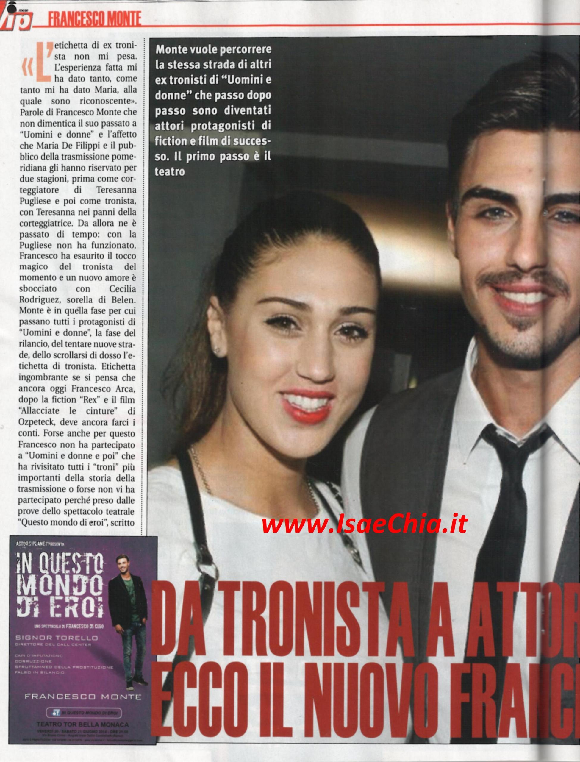 L’ex tronista Francesco Monte sta tentando la carriera di attore, ma ciononostante non rinnega la sua esperienza a Uomini e donne: “L’etichetta di tronista non mi pesa, Maria De Filippi mi ha dato tanto e le sono riconoscente” ha dichiarato lui. Eppure, dietro le quinte di Uomini e donne e poi, c’era la sua ex Teresanna Pugliese, ma di lui nemmeno l’ombra. Forse perché era impegnato con le prove dello spettacolo teatrale Questo mondo di eroi, scritto e diretto da Francesco Di Chio e andato in scena a fine giugno al teatro Tor Bella Monaca di Roma. Si tratta di uno spettacolo divertente, a cui hanno preso parte gli attori della Actors’ Planet, la scuola di recitazione diretta da Rossella Izzo. Nello spettacolo Francesco veste i panni del signor Torello, direttore di un call center, mentre gli altri interpretano disoccupati, politici senza scrupoli, escort alla ricerca di un politico e giovani alla ricerca di un futuro. Chi ha assistito allo spettacolo ha potuto vedere Monte destreggiarsi sul palco e secondo alcuni, potrebbe essere lui il nuovo Francesco Arca. Quest’ultimo, infatti, ha recitato nella serie Il commissario Rex e in un film di Ferzan Ozpetek, ma sa quando è difficile scollarsi l’etichetta di “tronista”. In prima fila, ovviamente, c’era la fidanzata, Cecilia Rodriguez, con la quale Monte si è regalato una vacanza a New York per il primo anno di fidanzamento…Ma non di convivenza: “Ciascuno ha la sua casa, ma stiamo sempre insieme, un po’ a casa mia e un po’ a casa sua. Penso che per mantenere una relazione bisogni lavorare giorno per giorno, non è che hai trovato l’amore poi è tutto a posto. Bisogna fare quelle piccole cose che piacciono a ognuno di noi. Io credo che lui sia l’uomo della mia vita. Progetto una vita con lui, ma è presto per parlarne: sono ancora piccola” ha dichiarato la sorella di Belén.