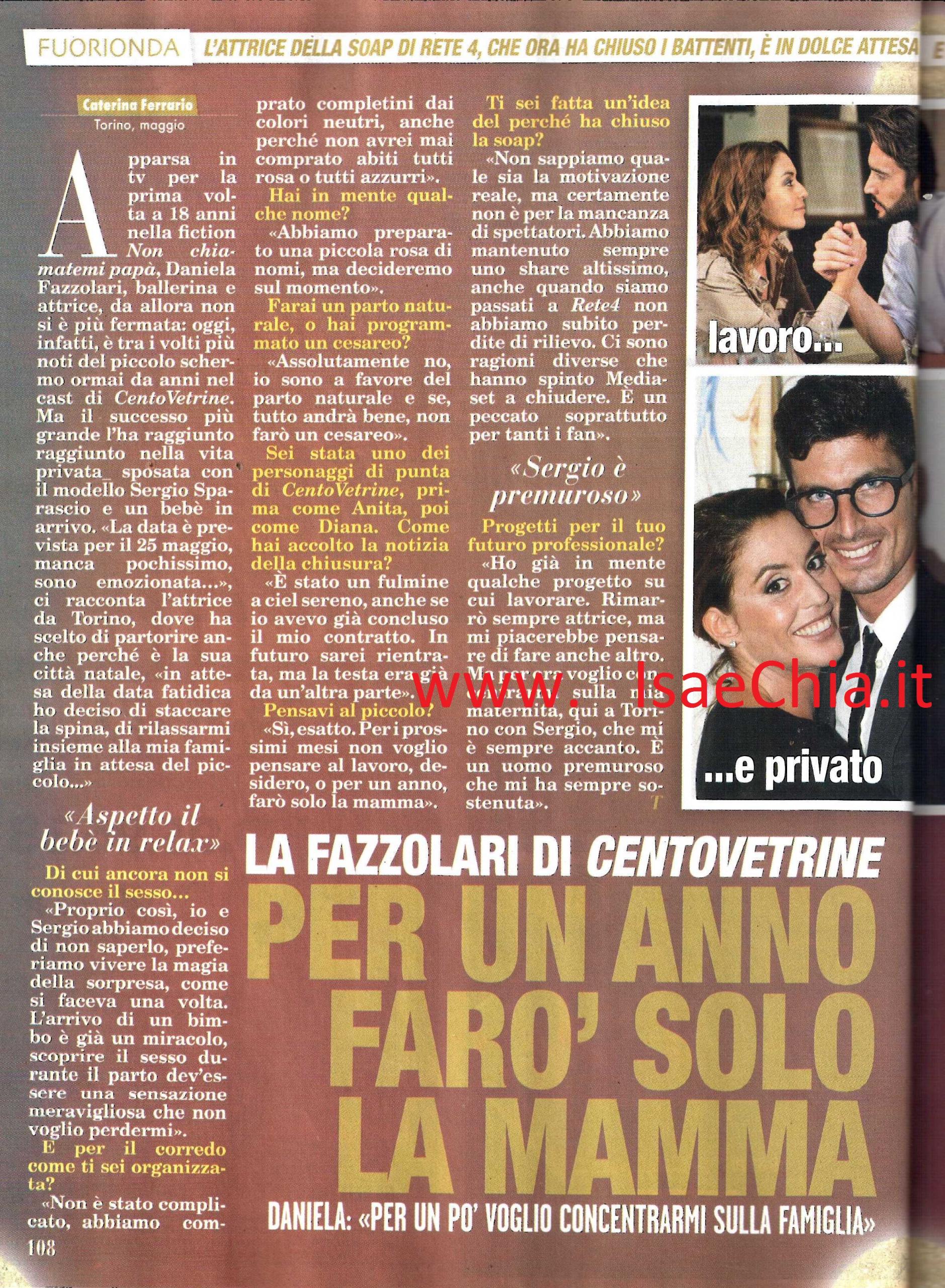 Ha espresso più volte il suo dispiacere per la chiusura della soap che da anni la vedeva protagonista, CentoVetrine, ma adesso Daniela Fazzolari si prepara ad un’altra fase della sua vita: quella da mamma. “La data prevista per la nascita è il 25 maggio, manca pochissimo! In attesa del fatidico giorno, ho deciso di staccare la spina, di rilassarmi insieme alla mia famiglia in attesa del piccolo. Io e mio marito Sergio Sparascio non ne conosciamo ancora il sesso: abbiamo deciso di non saperlo e vivere la sorpresa. L’arrivo di un bambino è già un miracolo, scoprire il sesso durante il parto deve essere un’emozione meravigliosa! Per il corredo non è stato complicato: abbiamo comprato cose dai colori neutri, anche perché non avrei mai comprato abiti tutti rosa o tutti azzurri. Sono a favore del parto naturale e se tutto andrà bene, non farò un cesareo“. Quando le si chiede poi della chiusura di CentoVetrine, l’attrice risponde: “E’ stato un fulmine a ciel sereno, anche se io avevo già concluso il mio contratto. In futuro sarei rientrata, ma la mia testa era da un’altra parte: per i prossimi mesi non voglio pensare al lavoro, desidero, per un anno, fare solo la mamma. Non sappiamo quale sia la motivazione della chiusura, ma certo non è per la mancanza di spettatori: abbiamo mantenuto sempre uno share altissimo, anche su Rete 4. Ci sono ragioni diverse che hanno spinto Mediaset a chiudere. E’ un peccato soprattutto per tanti fan. Ora ho già in mente qualche progetto su cui lavorare: rimarrò sempre attrice, ma mi piacerebbe pensare di fare anche qualcos’altro Per ora voglio concentrarmi sulla maternità, qui a Torino con Sergio: è un uomo premuroso che mi ha sempre sostenuto“.