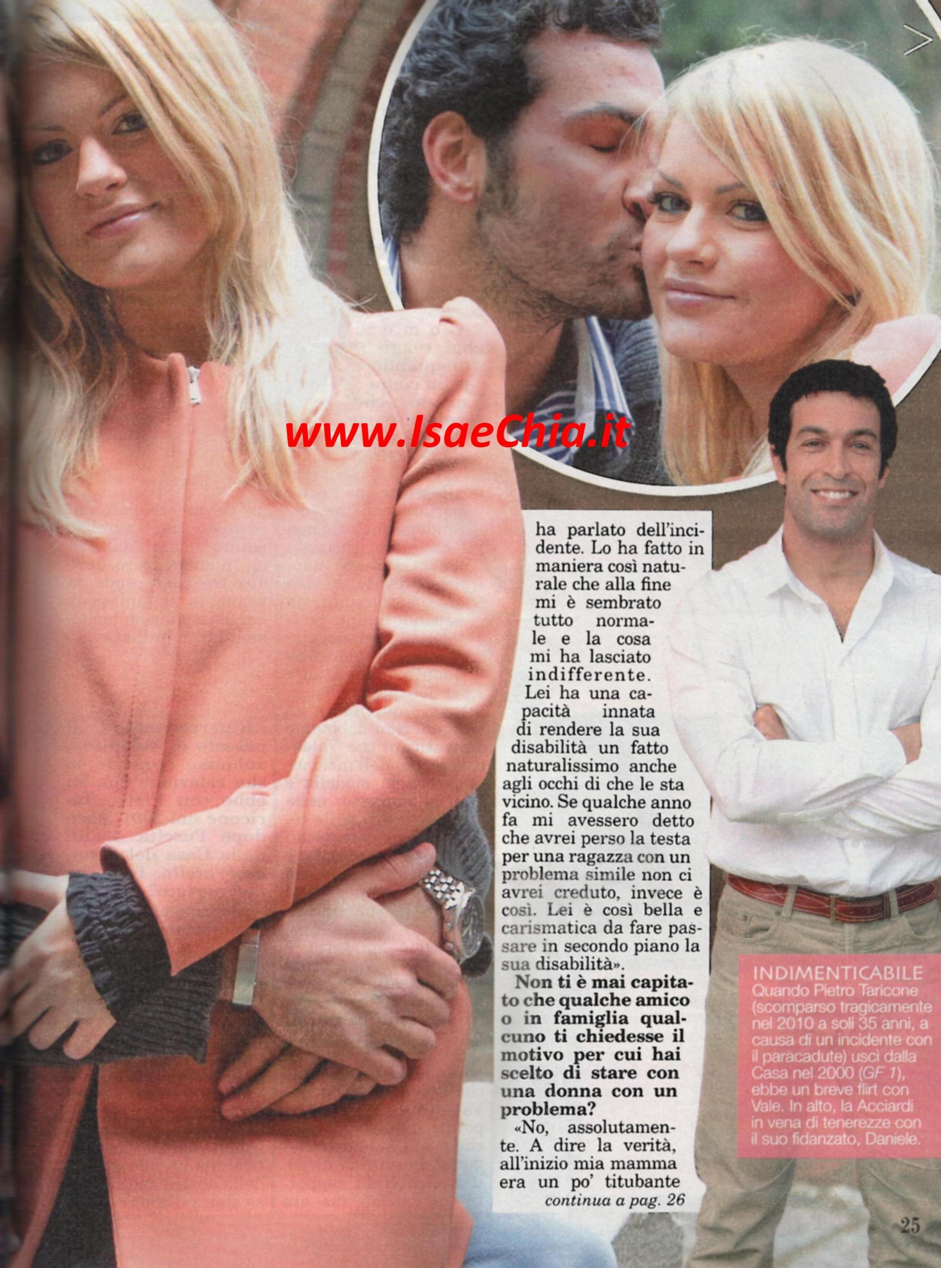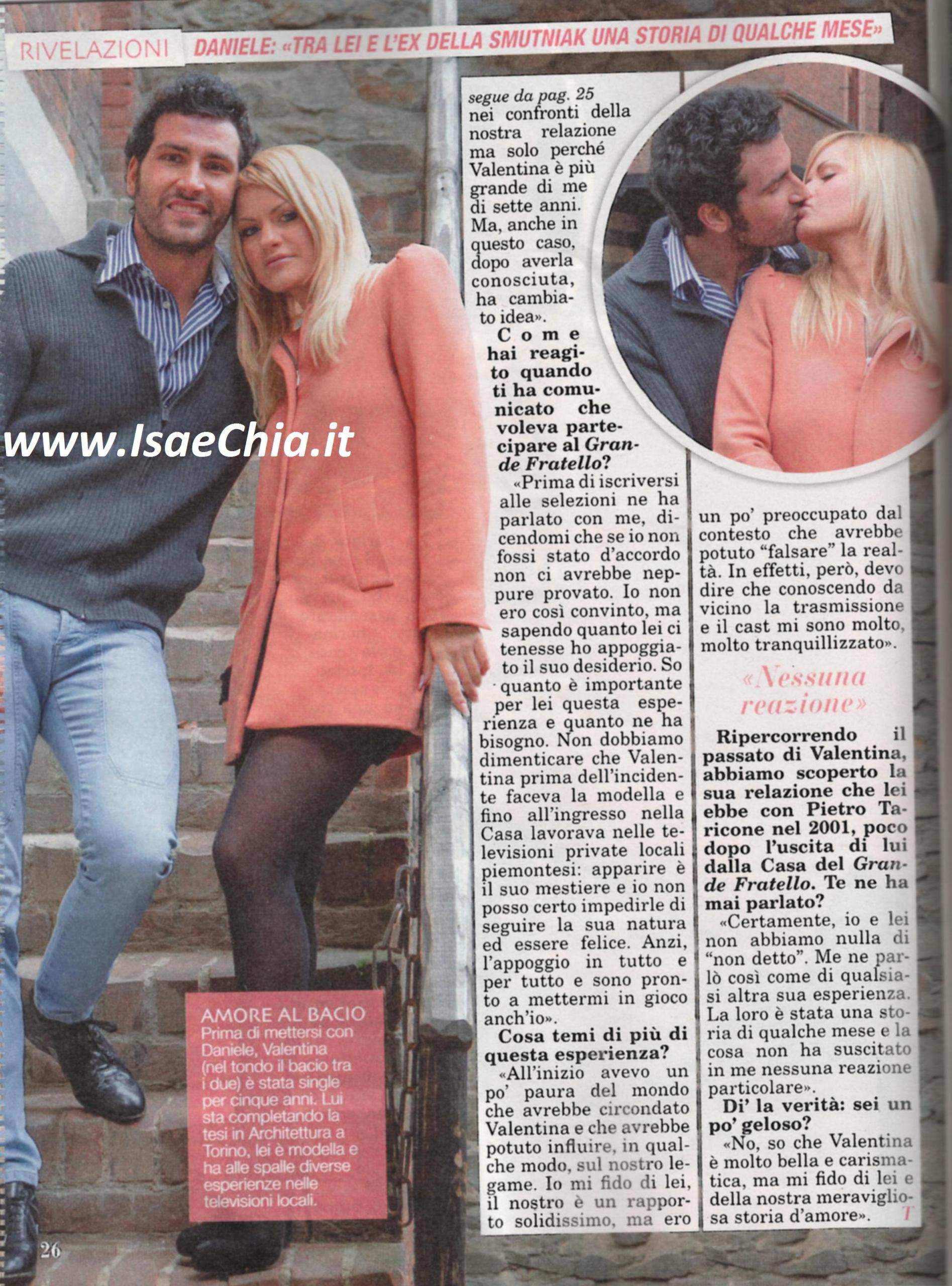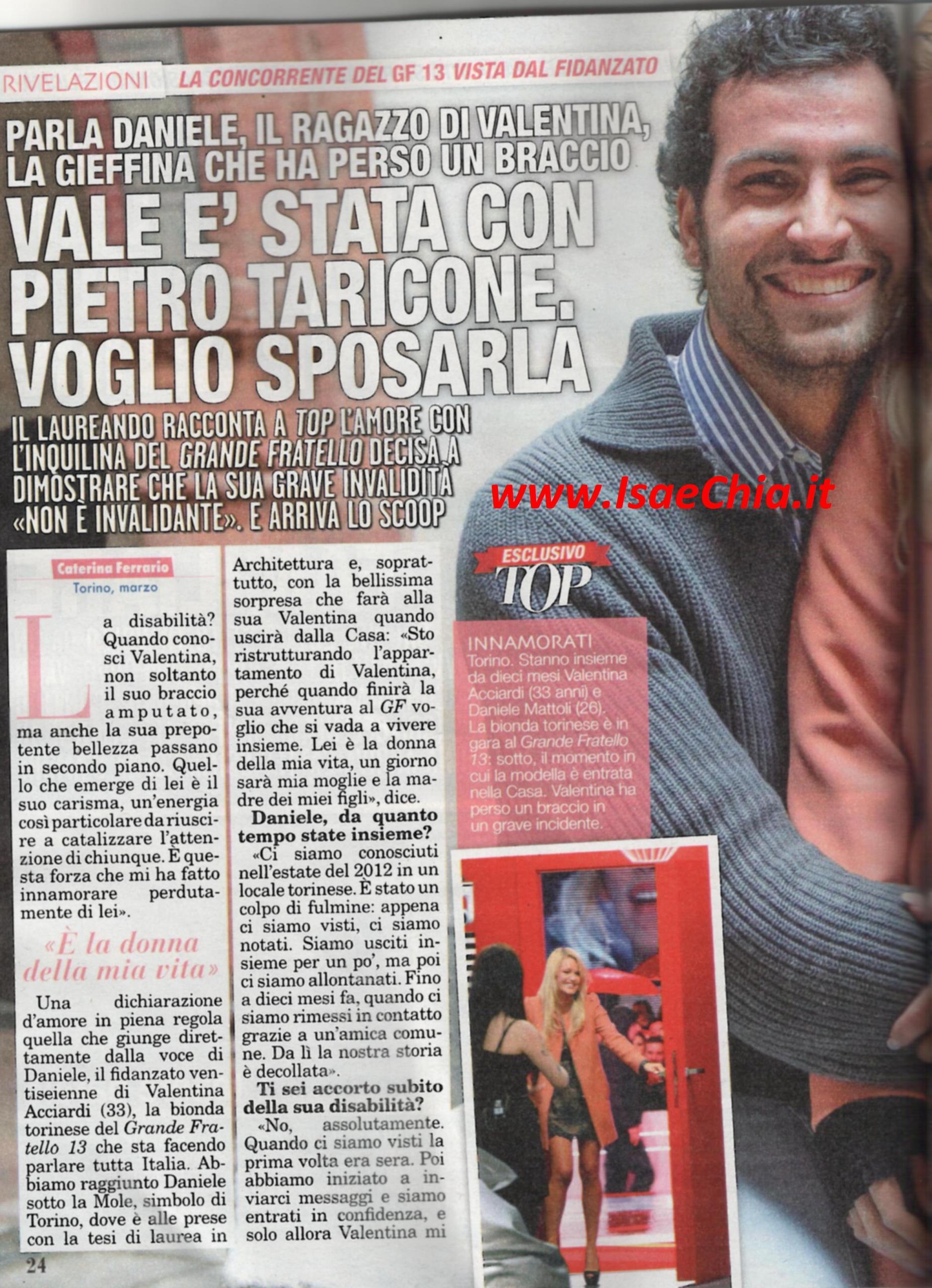 Daniele Mattoli, fidanzato di Valentina Acciardi, ha in serbo una sorpresa per lei: “Mentre lavoro alla mia tesi di laurea in Architettura, le ho ristrutturato casa, perché quando sarà finita la sua esperienza al Grande fratello, voglio andare a vivere con lei. Lei è la donna della mia vita, un giorno sarà mia moglie e la madre dei miei figli. Ci eravamo conosciuti nel 2012 e ci siamo piaciuti, ma poi ci siamo allontanati. Dieci mesi fa, grazie ad un’amica comune, ci siamo ritrovati. Quando ci siamo visti la prima volta era sera e non mi ero accorto della sua disabilità. Poi siamo entrati in confidenza e lei mi ha parlato dell’incidente. Lo ha fatto in modo così naturale che la cosa mi è sembrata normale. Se mi avessero detto che avrei perso la testa per una ragazza così, non ci avrei creduto, ma lei ha la capacità di rendere la sua disabilità un fatto normalissimo, è così bella e carismatica che la fa passare in secondo piano. Mia madre all’inizio era un po’ titubante sulla relazione, ma solo perché Vale ha sette anni più di me. Prima di partecipare alle selezioni per il Grande fratello, si è consultata con me. Io non ero convinto, ma ho visto che per lei era importante. Prima dell’incidente faceva la modella e lavorava nelle reti private piemontesi: apparire è il suo mestiere. Temevo che il mondo che avrebbe circondato Valentina potesse influire sulla nostra storia. Ma mi fido di lei, il nostro rapporto è solidissimo, ma ero preoccupato che potesse falsare la realtà. Conoscendo da vicino il cast e la trasmissione, però, mi sono tranquillizzato”. Infine, quando gli si chiede della storia che Valentina ha avuto in passato con Pietro Taricone, concorrente della prima edizione, prematuramente scomparso in un tragico incidente, risponde: “Certo, lo sapevo: non abbiamo nulla di non detto. Me ne parlò come di qualsiasi sua altra esperienza. La loro è stata una storia di qualche mese e non ha suscitato in me nessuna particolare reazione”.