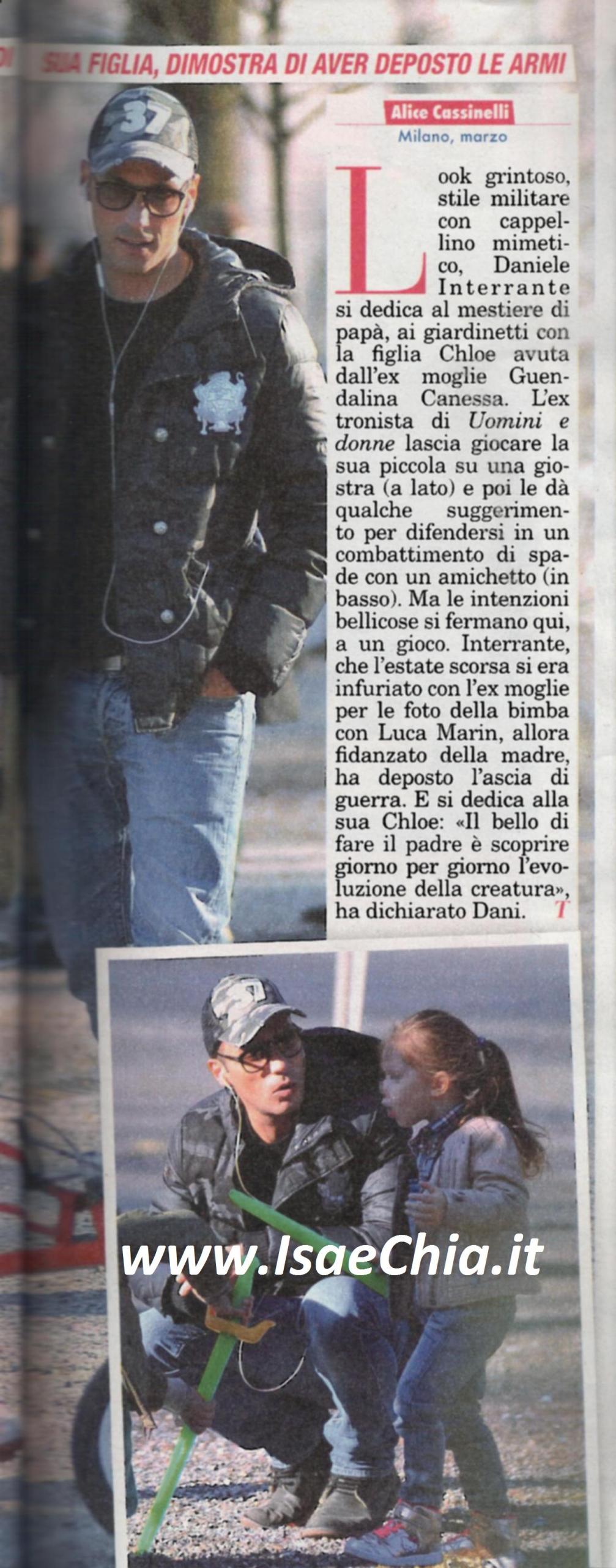 Look grintoso, con cappellino in stile militare per l’ex tronista Daniele Interrante, che ai giardinetti si dedica al ruolo di papà con la sua piccola Chloe, avuta dall’ex moglie Guendalina Canessa. Daniele la lascia prima giocare sulla giostra, ma poi, spade alla mano, dà consigli alla figlia su come difendersi in un combattimento con un amico. Per fortuna, le azioni di guerra si fermano qui, a un gioco. Interrante, che l’estate scorsa si era infuriato per le foto di Chloe con Luca Marin, nuovo (ex) fidanzato di Guendalina, adesso ha deposto l’ascia di guerra e pensa solo al suo ruolo di padre: “Il bello di fare il padre è scoprire giorno per giorno l’evoluzione della tua creatura” ha dichiarato.