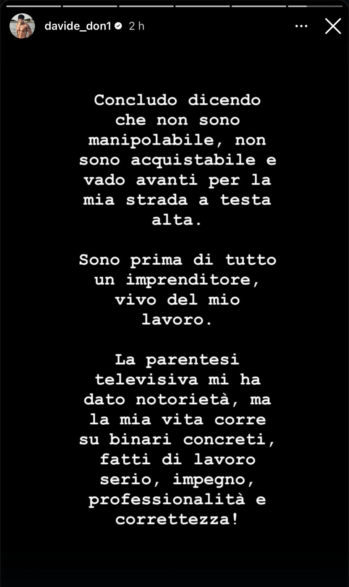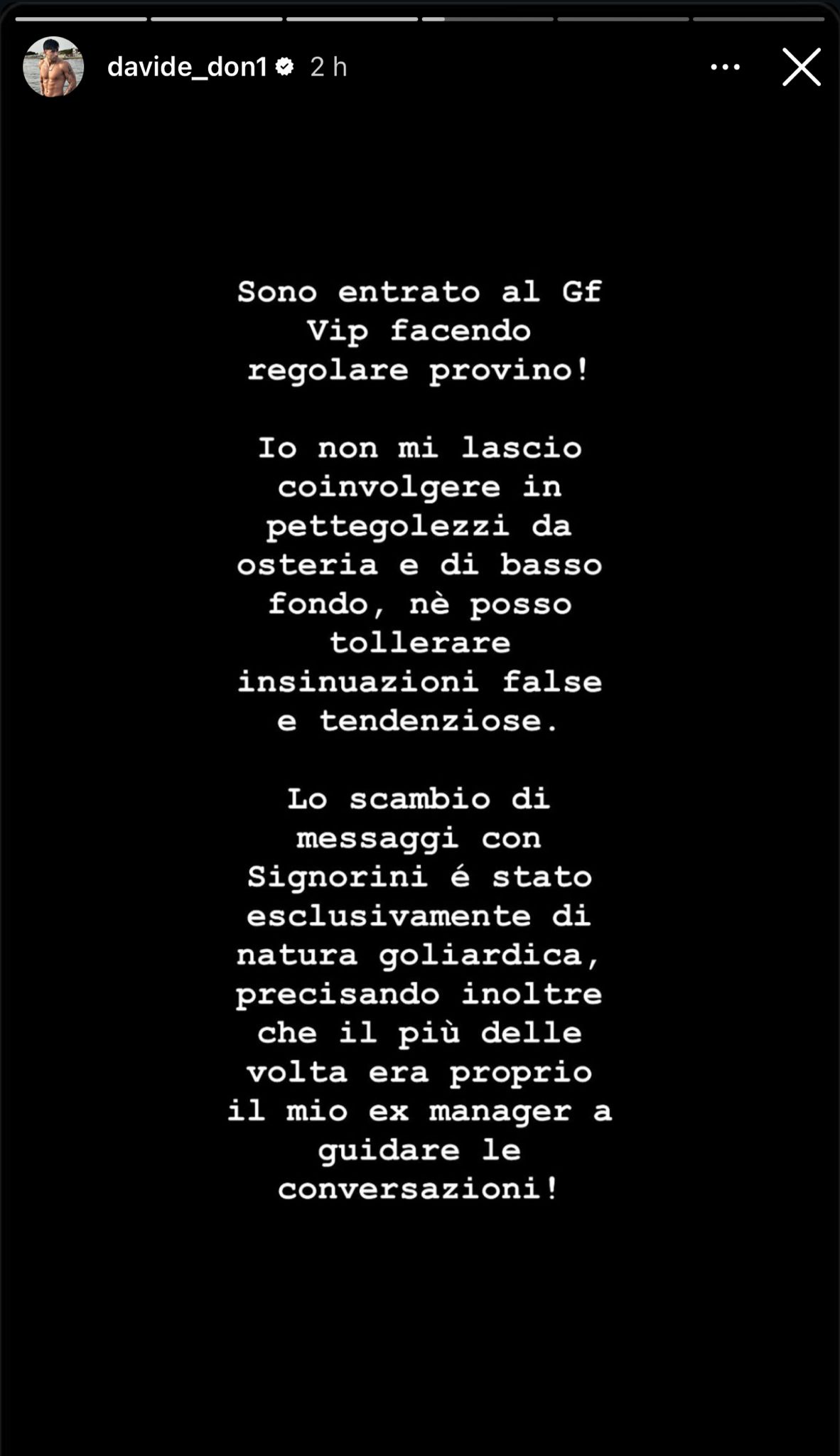 Ieri sera, Davide ha pubblicato delle storie sul suo profilo Instagram in cui ha voluto dissociarsi da Corona, ha voluto sottolineare di essere entrato al Gf Vip attraverso un regolare provino, di aver intrapreso chat esclusivamente goliardiche con Signorini, chat che peraltro, a suo dire, erano principalmente gestite dal suo ex agente: