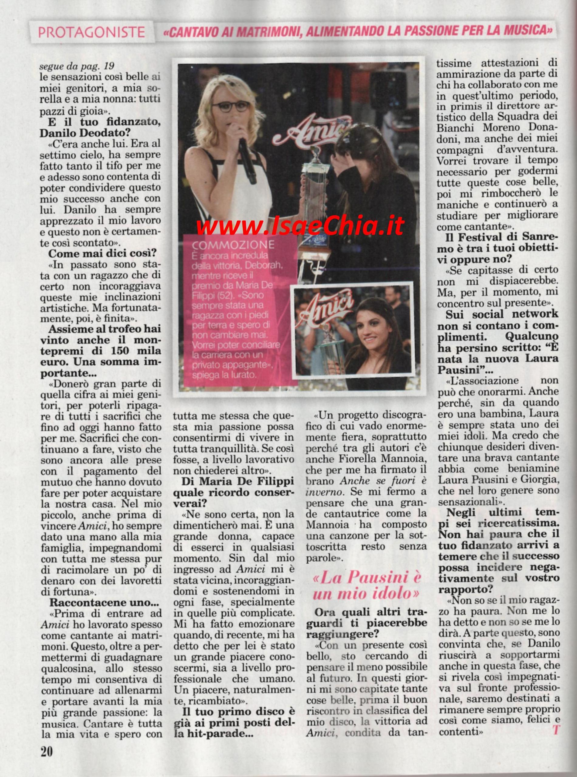 E’ stata Deborah Iurato a trionfare su tutti ad Amici. Adesso la cantante di Ragusa racconta: “Ci speravo, ma non me lo aspettavo in maniera più assoluta. Sono ancora incredula, devo ancora realizzare di essere la vincitrice del mio talent preferito! La mia famiglia era presente al momento della vittoria: è scoppiata in un pianto di gioia e ci siamo stretti in un unico abbraccio. Con loro c’era anche il mio fidanzato Danilo Deodato. Era al settimo cielo: ha sempre fatto il tifo per me, ha sempre apprezzato il mio lavoro e sono felice di poter condividere questo mio successo con lui. Non è una cosa da dare per scontata: in passato ho avuto un fidanzato che non incoraggiava le mie inclinazioni artistiche, ma per fortuna poi è finita!”. Quando le si chiede cosa farà coi 150.000 euro vinti, risponde: “Donerò gran parte della cifra ai miei genitori per poterli ripagare di tutti i sacrifici fatti per me, sacrifici che continuano a fare per pagare il mutuo di casa. Prima di Amici lavoravo spesso come cantante ai matrimoni e questo mi permetteva di guadagnare qualcosa per contribuire alle spese e al contempo di allenarmi e portare avanti la mia più grande passione. Maria De Filippi è una grande donna, c’è stata in ogni momento, specialmente quelli più complicati, non la dimenticherò mai. Mi ha fatto emozionare dicendomi che per lei è stato un piacere conoscermi anche a livello umano. Un piacere, naturalmente, ricambiato”. Infine, parlando di risultati presenti e progetti futuri, Deborah commenta: “Sono enormemente fiera del mio disco, già ai primi posti della hit-parade. Se mi fermo a pensare che una grande cantautrice come Fiorella Mannoia ha scritto per me Anche se fuori è inverno, resto senza parole. Il festival di Sanremo? Se capitasse, di certo non mi dispiacerebbe, ma al momento mi godo il presente. Quando sui social mi associano a Laura Pausini, sono onoratissima: sin da quando ero bambina, lei era uno dei miei idoli. Non so se devo temere che il successo possa incidere negativamente sul mio rapporto con Danilo e non so se lui ne ha paura. Io sono convinta che se lui riuscirà a sopportarmi in questa fase così impegnativa sul fronte professionale, saremo destinati a rimanere così come siamo: felici e contenti”.