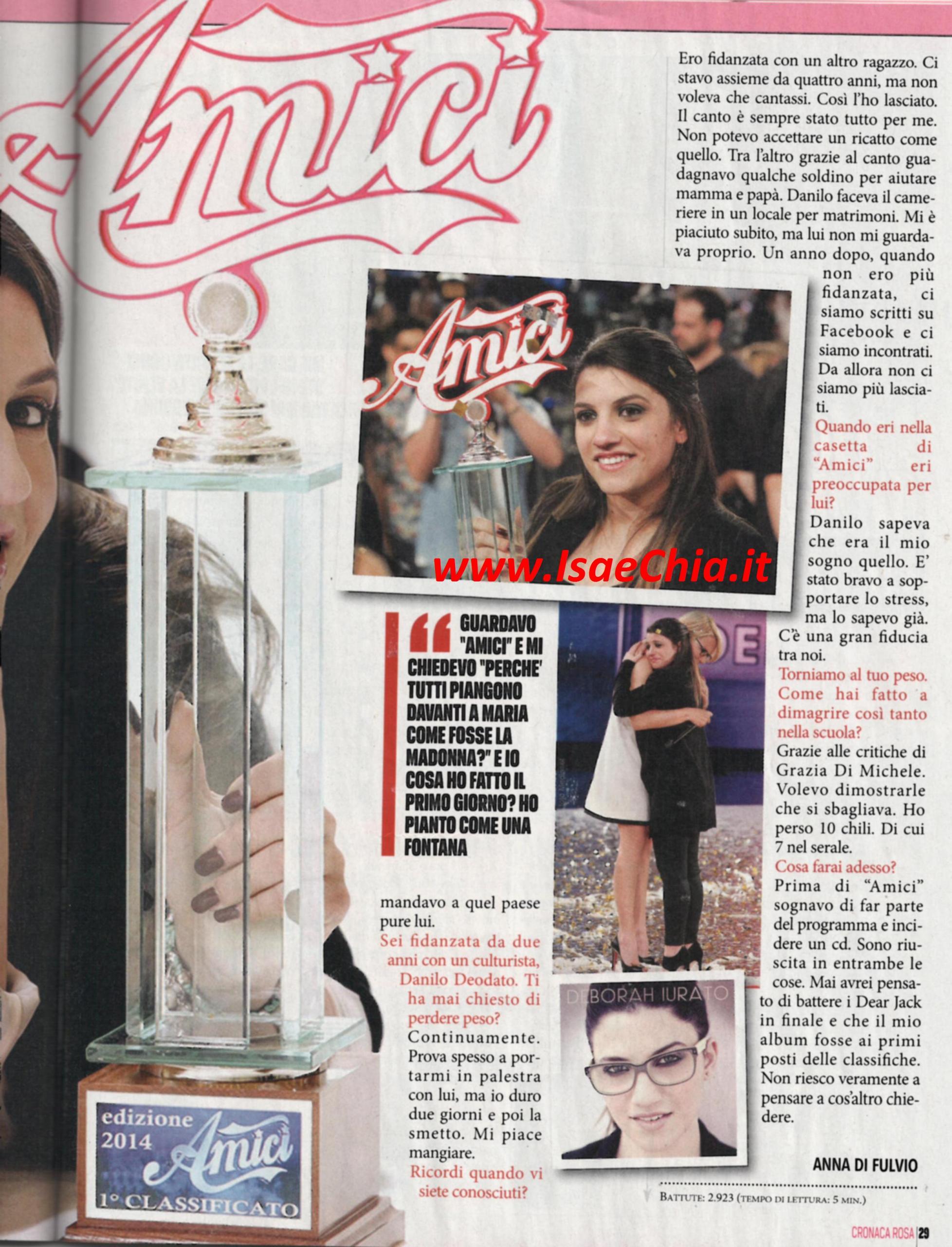 Ad un mese dalla vittoria ad Amici, la cantante Deborah Iurato racconta: “Ho partecipato perché ho sempre guardato il programma, da quando si chiamava Saranno famosi, e pensavo fosse più vero degli altri talent. Ammiravo Giulia Ottonello, Annalisa Scarrone e Alessandra Amoroso, ma mi chiedevo perché tutti piangessero davanti a Maria De Filippi. Poi sono arrivata lì e ho pianto anch’io come una fontana! Al primo provino avevo 18 anni; non mi hanno mai detto perché mi scartavano, ma credo di essere maturata molto negli anni. Sono stata criticata da Grazia Di Michele per il mio aspetto fisico ed è stato terribile. Piangevo e pensavo alla mia famiglia; chiamavo papà e mi diceva che forse era vero che dovevo dimagrire…E mandavo a quel paese anche lui! Sono fidanzata da due anni con un culturista, si chiama Danilo Diodato. Lui mi ha chiesto continuamente di perdere peso e di andare con lui in palestra, ma io duro due giorni e poi smetto. Mi piace mangiare. Prima ero fidanzata con un altro ragazzo, ma lui non voleva che cantassi, così l’ho lasciato: il canto è tutto per me. Danilo faceva il cameriere in un locale per matrimoni dove io cantavo, ma non mi guardava proprio. Un anno dopo ci siamo sentiti su Facebook e da allora non ci siamo più lasciati. Lui sapeva che il mio sogno era partecipare ad Amici ed è stato bravo a sopportare lo stress. Comunque, dopo le critiche della Di Michele mi sono messa a dieta e ho perso 10 chili, di cui 7 nel serale. Ora ho realizzato il mio sogno di incidere un cd, che è arrivato ai primi posti in classifica e mai avrei pensato di battere i Dear Jack in finale. Non riesco veramente a pensare cos’altro chiedere”.