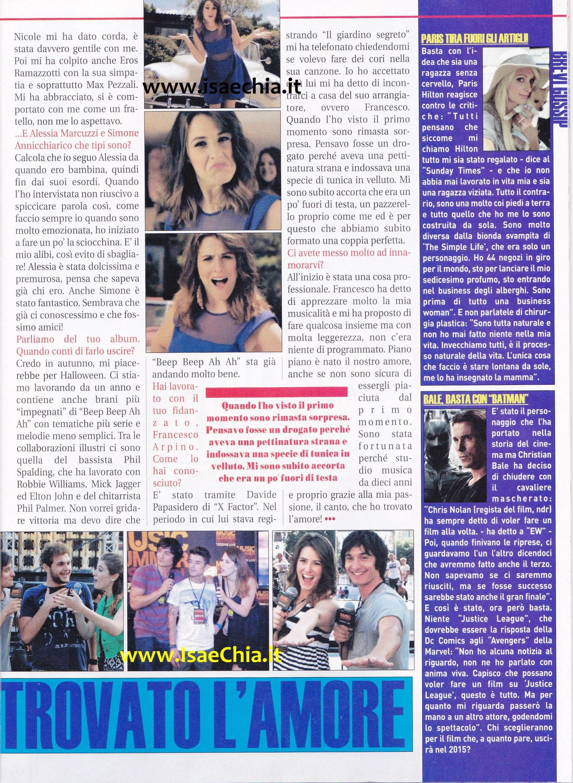 La concorrente di Amici 10 Diana Del Bufalo non smette di stupire: ha pubblicato lo scanzonato singolo Beep beep ah ah ed ha lavorato come intervistatrice per il Music Summer Festival: “E’ stata una bellissima esperienza; il festival era curato dagli stessi di Amici e per me è stato come tornare dalla famiglia di Maria De Filippi. Tra i vari personaggi, quello che mi ha colpito di più è stata Nicole Scherzinger, il mio idolo da sempre: io cantavo e ballavo le canzoni delle Pussycat Dolls con le mie amiche! Quando me la sono trovata di fronte, le ho detto: “Nicole, I love you, vuoi sposarmi?”. Lei mi ha dato corda ed è stata gentile con me. Mi ha colpito la simpatia di Eros Ramazzotti e Max Pezzali mi ha abbracciata come se fosse mio fratello. Alessia Marcuzzi la seguo da quando ero bambina e quando l’ho intervistata non riuscivo a spiccicare parola, quindi ho cominciato a fare la sciocchina. Lei è stata premurosa e dolcissima. Il mio album, invece, esce in autunno. Contiene anche canzoni più impegnate e vanto la collaborazione di Phil Spalding, che ha lavorato con Robbie Williams e Phil Palmer. Ho lavorato col mio fidanzato Francesco Arpino; ci siamo conosciuti tramite Davide Papasidero di X Factor, che mi chiese di partecipare a dei cori per la sua canzone. Lì ho conosciuto Francesco, che era il suo arrangiatore: credevo fosse un drogato perché aveva una pettinatura strana e una tunica di velluto. Lui all’inizio mi ha apprezzata professionalmente, ma poi pian piano è nato il nostro amore. Sono stata fortunata perché studio musica da dieci anni e proprio grazie al canto ho trovato l’amore!”