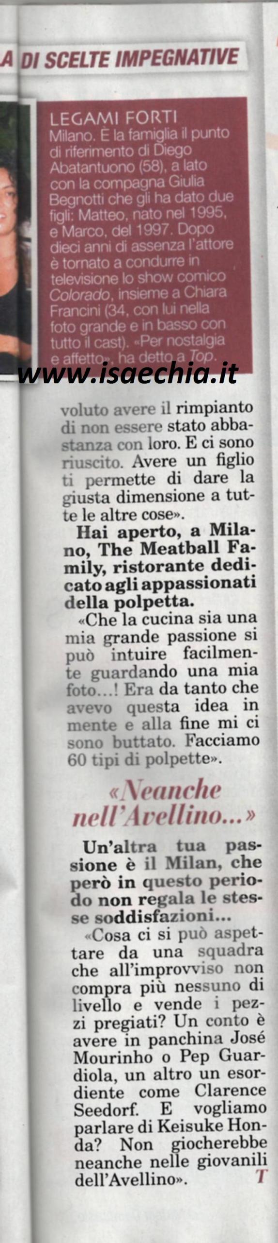 Diego Abatantuono è tra gli autori di Colorado, il programma lanciato più di dieci anni fa che col tempo ha acquisito un successo sempre maggiore, e ora è tornato nelle vesti di conduttore: “Ho deciso di tornare alla conduzione soprattutto per la nostalgia e l’affetto che provo per il programma, che ho creato nel 2003. Ai tempi lasciai perché non era il mio lavoro primario. Sono stato presente finché non è andato in orbita, poi l’ho lasciato volare da solo. Il cabaret è un mondo di valori difficili da trovare in altre forme di spettacolo. Non è un caso se i miei migliori amici sono quelli di 40 anni fa, ai tempi del Derby Club. Ma scelsi di dedicarmi al cinema più che al teatro per non stare troppo tempo lontano dai miei figli. Non volevo avere il rimpianto di non essere stato abbastanza con loro”. Infine, parla di sue due passioni: “Ho aperto The Meatball Family, un ristorante dedicato alla polpetta: che la cucina sia una mia passione si capisce guardandomi! L’altra mia passione è il Milan. Ma cosa ci si può aspettare da una squadra che vende i pezzi pregiati e improvvisamente non compra più nessuno di livello?” commenta lui amareggiato per gli scarsi risultati della sua squadra del cuore.