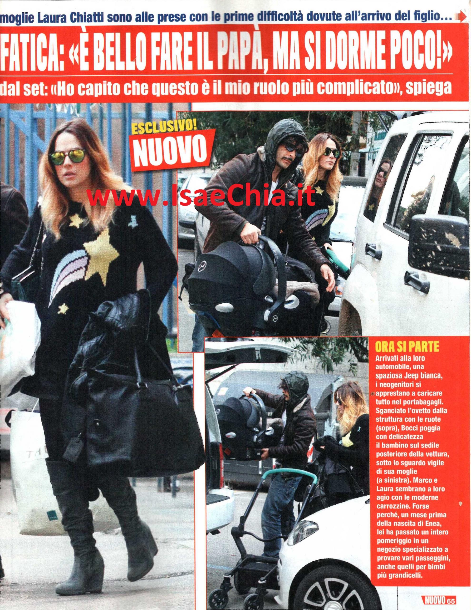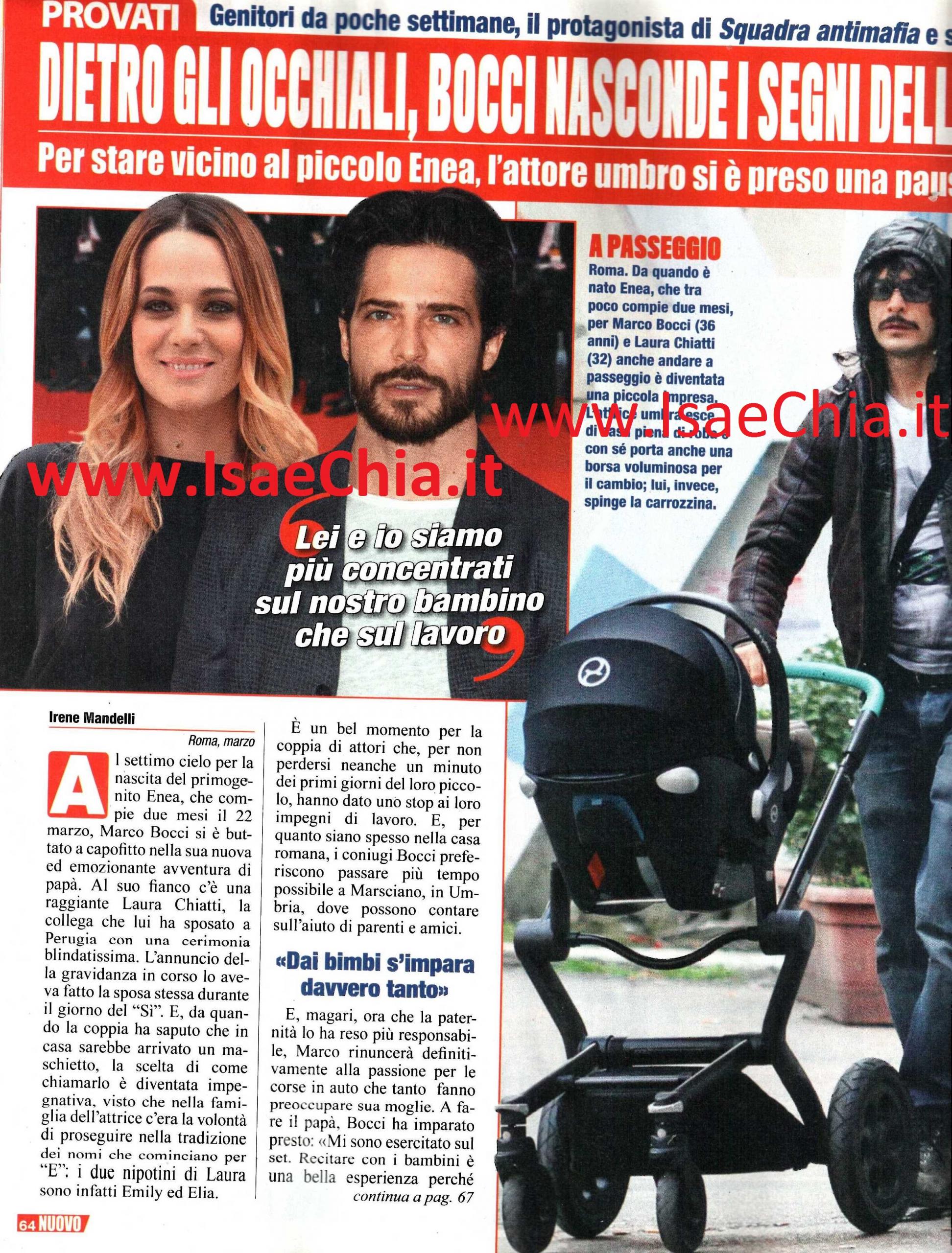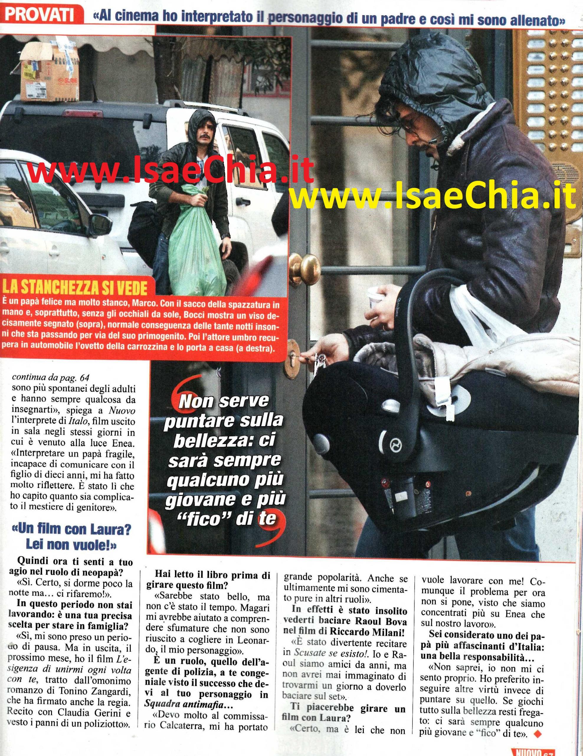 Al settimo cielo per la nascita del figlio Enea, che ha appena compiuto due mesi, l’attore Marco Bocci si è buttato a capofitto nella sua nuova avventura da papà. Al suo fianco, anche in queste foto, c’è Laura Chiatti, l’attrice che è diventata sua moglie la scorsa estate con una cerimonia blindatissima. Per quanto i due siano spesso nella loro casa di Roma, i coniugi preferiscono passare quanto più tempo possibile a Marsciano, il paesino umbro dove possono contare sull’aiuto di parenti e amici. E magari, ora che è diventato più responsabile, il protagonista di Squadra Antimafia rinuncerà anche alla sua passione per le corse in auto, che fanno tanto preoccupare la moglie. “A fare il papà mi sono esercitato sul set. Recitare con i bambini è una bella esperienza, perché sono più spontanei degli adulti e hanno sempre qualcosa da insegnarti. Interpretare un papà fragile, che non riesce a comunicare col figlio di 10 anni, mi ha fatto riflettere. E’ stato lì che ho capito quanto sia complicato il mestiere del genitore” dice lui. E quando gli si chiede se allora adesso si sente a suo agio nel ruolo di papà, risponde ironico: “Certo! Si dorme poco la notte…Ma ci rifaremo!“. E non è un caso che in questo periodo si sia preso una pausa dal set: “Sì, mi sono preso un periodo di pausa, ma è in uscita L’esigenza di unirmi ogni volta con te, tratto dall’omonimo libro, in cui recito con Claudia Gerini e vesto i panni di un poliziotto. Non ho avuto il tempo di leggere prima il libro, ma magari mi avrebbe aiutato a cogliere altre sfumature del personaggio di Leonardo. Devo molto al commissario Calcaterra, che interpreto in Squadra Antimafia, ma ultimamente mi sono cimentato anche in altri ruoli, diversi dal poliziotto: è stato davvero divertente recitare in Scusate se esisto. Io e Raoul Bova siamo amici da anni e mai avrei immaginato di trovarmi un giorno a doverlo baciare sul set!“. Infine, quando gli si chiede se gli piacerebbe recitare con sua moglie Laura, con la quale compone una delle coppie più affascinanti d’Italia, risponde: “Certo, ma è lei che non vuole lavorare con me! Comunque per ora il problema non si pone, dato che siamo concentrati più su Enea che sul lavoro. Affascinante? Non saprei, non mi ci sento. Ho preferito puntare più su altre virtù: se giochi tutto su quello, resti fregato. Ci sarà sempre qualcuno più giovane e ‘figo’ di te!“.