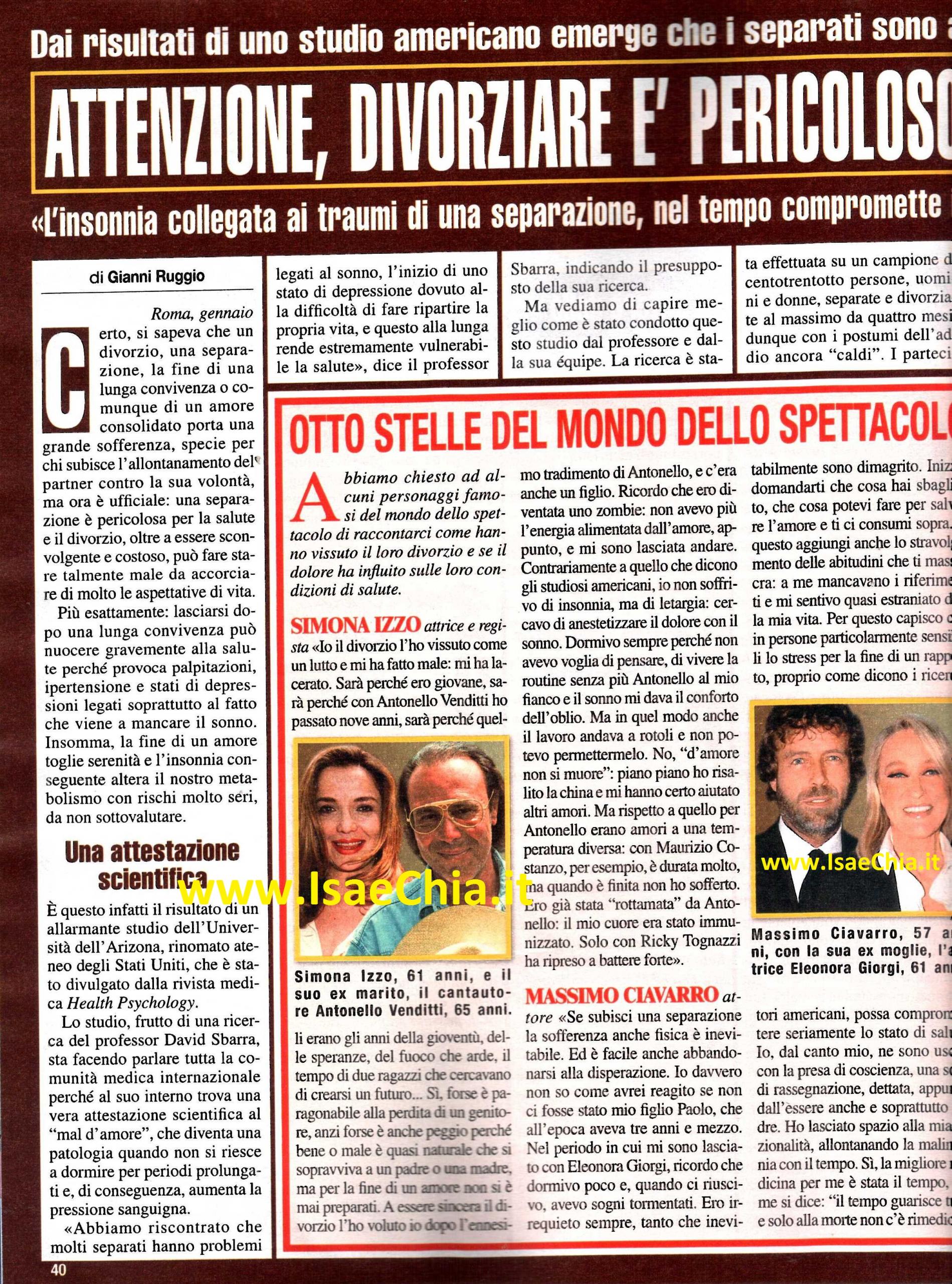 Il settimanale Di più ha chiesto ad alcuni vip nostrani la loro esperienza personale sul divorzio, per vedere se il dolore ha influito sul loro stato di salute. L’attrice Simona Izzo ha ricordato: “Ho vissuto il divorzio dal cantante Antonello Venditti come un dramma, forse perché ero molto giovane. Forse è la perdita di un genitore: si è abituati all’idea di sopravvivere al padre o alla madre, ma non all’idea della fine di un amore. Il divorzio è arrivato dopo l’ennesimo tradimento di Antonello e c’era anche un figlio. Ero diventata uno zombie e mi sono lasciata andare. Al contrario di quanto dicono gli studiosi americani, non ho sofferto di insonna, ma di letargia: cercavo di anestetizzare il dolore nel sonno: non avevo voglia di vivere senza la mia routine con lui e mi rifugiavo nell’oblio“. L’attore Massimo Ciavarro, protagonista l’anno scorso di Pechino Express insieme al figlio Paolo, racconta: “Se subisci una separazione, la sofferenza anche fisica è inevitabile. Nel periodo in cui mi sono lasciato con Eleonora Giorgi, dormivo poco e quando ci riuscivo, avevo sonni tormentati. Ero sempre irrequieto e sono dimagrito. Inizi a domandarti cos’hai sbagliato e ti consumi. Inoltre, massacra la perdita della routine e di punti di riferimento. Io ne sono uscito con una presa di coscienza, una rassegnazione dettata soprattutto dal fatto di essere anche padre. La migliore medicina è stata il tempo!“. Tra poche settimane sarà ospite al Festival di Sanremo con la sua ex moglie Romina Power, ma quando si sono lasciati, vent’anni fa, per Al Bano è stato un duro colpo: “La separazione è un lutto, ancora di più se ci sono dei figli in mezzo. Allora non è stata una gran gioia, così come per Romina. Ho perso peso,ma da un lato è stato positivo perché ero “pienotto”, Non ero sereno e la cosa brutta è che sapevo perché . Conoscevo la causa ma non mi sono affidato a medici e farmaci, bensì alla saggezza di mio padre, che diceva ‘La vita è una lotta’. Allora mi stordii di lavoro, ma non di quello da cantante, bensì di quello fisico: stavo nella mia campagna a Cellino San Marco, aiutavo muratori e braccianti. La cura alla separazione, per me, è stato il lavoro!“.