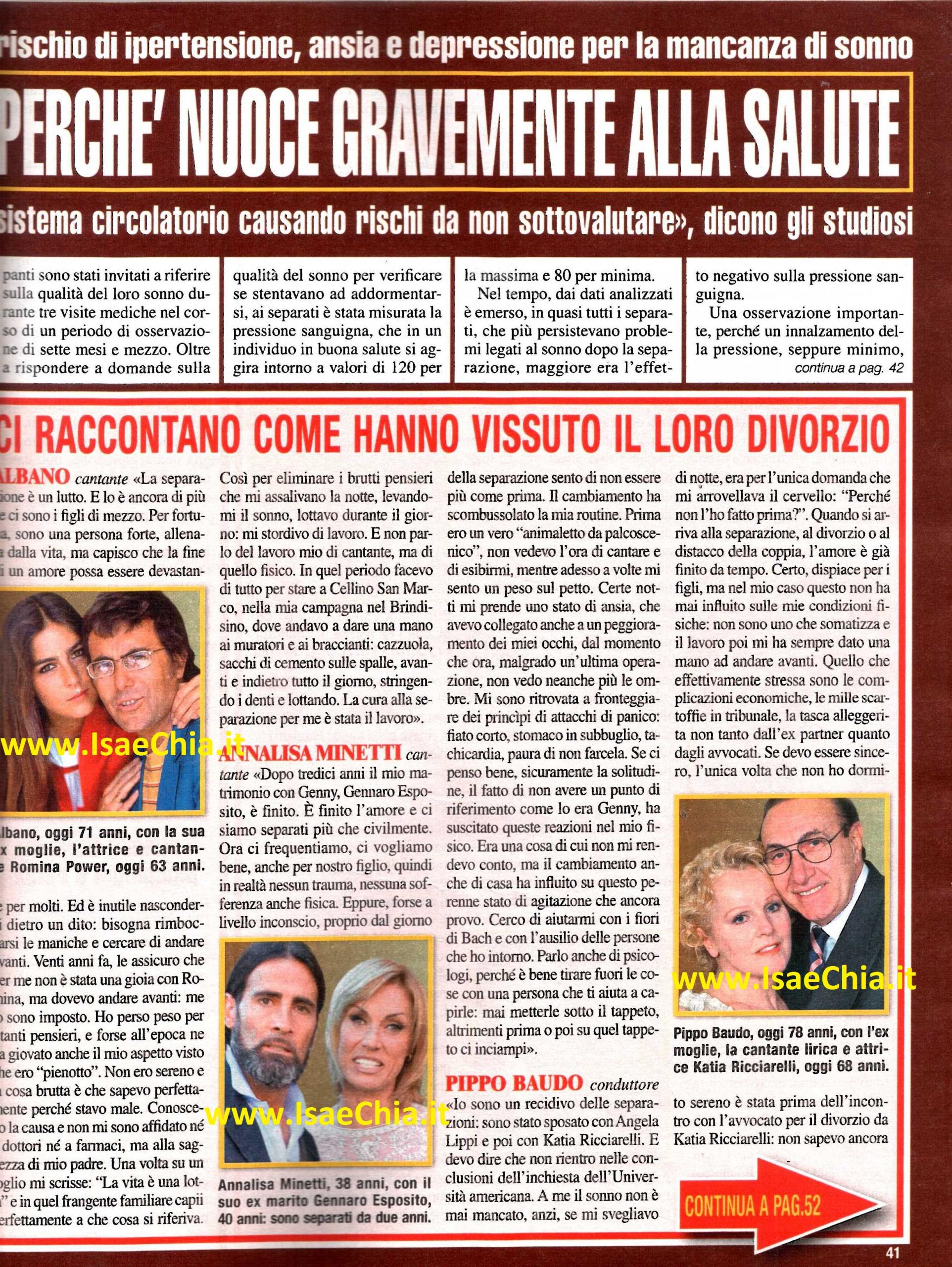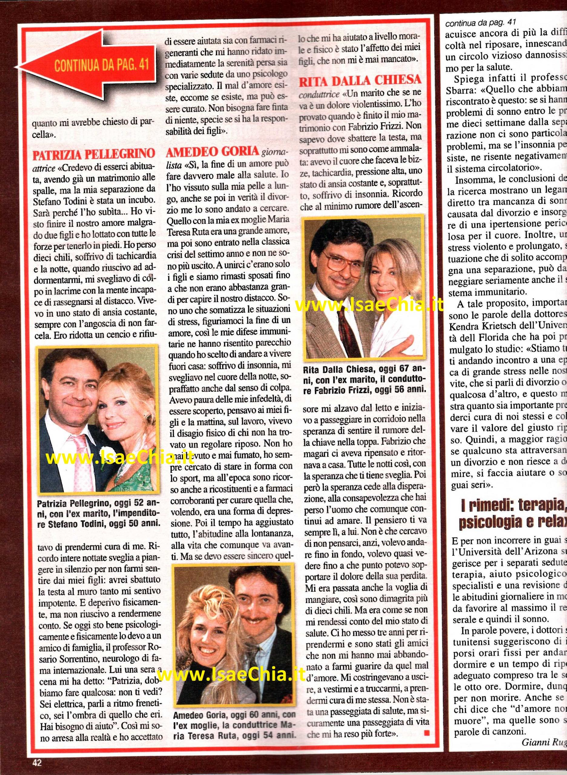 La cantante Annalisa Minetti, separata da due anni dal marito Genny, racconta: “Non ero più un animale da palcoscenico. Pensavo fosse dovuto al peggioramento dei miei occhi, perché, malgrado un’operazione, ora non vedo più neanche le ombre. Mi sono ritrovata a fronteggiare attacchi di panico, fiato corto, tachicardia. Se ci penso bene, la solitudine, il fatto di non avere più mio marito al mio fianco, ha contribuito e non me ne rendevo conto. Ne parlo anche con gli psicologi, perché è bene tirar fuori le cose con una persona che ti aiuta a capire“. Il conduttore Pippo Baudo ironizza: “Io sono un recidivo del divorzio: l’ho fatto prima con Angela Lippi, poi con Katia Ricciarelli. Il sonno non mi è mai mancato, anzi, se mi svegliavo nella notte, pensavo ‘Ma perché non l’ho fatto prima?’: quando si arriva al divorzio, l’amore è già finito da tempo. Quello che stressa sono le questioni economiche, le scartoffie, le tasche alleggerite dall’ex partner e dagli avvocati. L’unica volta che non ho dormito è stata prima dell’incontro con gli avvocati della Ricciarelli!“. Anche l’ex naufraga Patrizia Pellegrino ha due matrimoni alle spalle, ma lei racconta: “Pensavo di essere già preparata perché avevo già un matrimonio alle spalle, ma la mia separazione da Stefano Todin è stata un incubo. Forse perché l’ho subita e ho fatto di tutto per mantenere il nostro matrimonio in piedi. Ho perso 10 chili, soffrivo di tachicardia la notte, mi svegliavo di colpo in lacrime perché non mi rassegnavo al distacco. Mi ero ridotta a un cencio, finché un neurologo amico di famiglia mi ha detto: ‘Sei l’ombra di quello che eri’ e ho accettato di farmi aiutare con dei farmaci rigeneranti”. Amedeo Goria, ex marito della conduttrice ed ex naufraga Maria Teresa Ruta ricorda: “Eravamo entrati nella crisi del settimo anno e non ne siamo più usciti. Soffrivo d’insonnia, mi svegliavo nel cuore della notte, avevo paura delle mie infedeltà e di essere scoperto, sopraffatto dal senso di colpa. Sono ricorso a ricostituenti e farmaci per quella che era una forma di depressione. Quello che mi è aiutato è stato l’affetto dei miei figli, che non mi è mai mancato“. Infine, la conduttrice Rita Dalla Chiesa parla della fine del matrimonio con Fabrizio Frizzi: “Un marito che se ne va è un dolore potentissimo. Non sapevo dove sbattere la testa e mi sono ammalata. Avevo il cuore che faceva le bizze, tachicardia, pressione alta, insonnia. Al minimo rumore dell’ascensore mi alzavo dal letto sperando di sentire le chiavi nella toppa. Tutte le notti così, con la speranza che ti tiene sveglia. Poi però la speranza lascia posto alla rassegnazione. Mi era passata la voglia di mangiare, avevo perso 10 chili, ma non mi rendevo conto del mio stato di salute. Ci ho messo tre anni per riprendermi e l’ho fatto grazie ai miei amici, che mi costringevano a vestirmi, truccarmi ed uscire“.