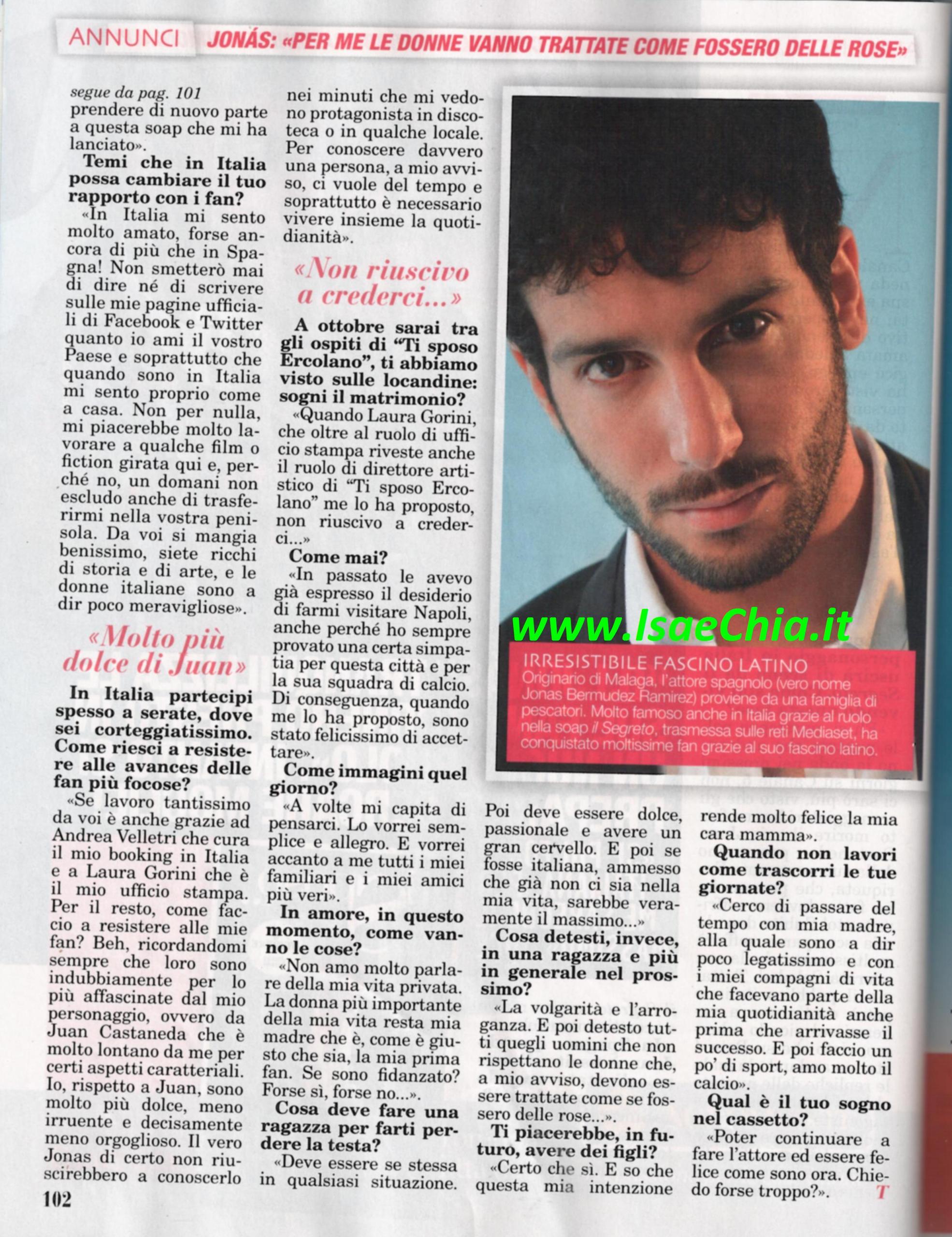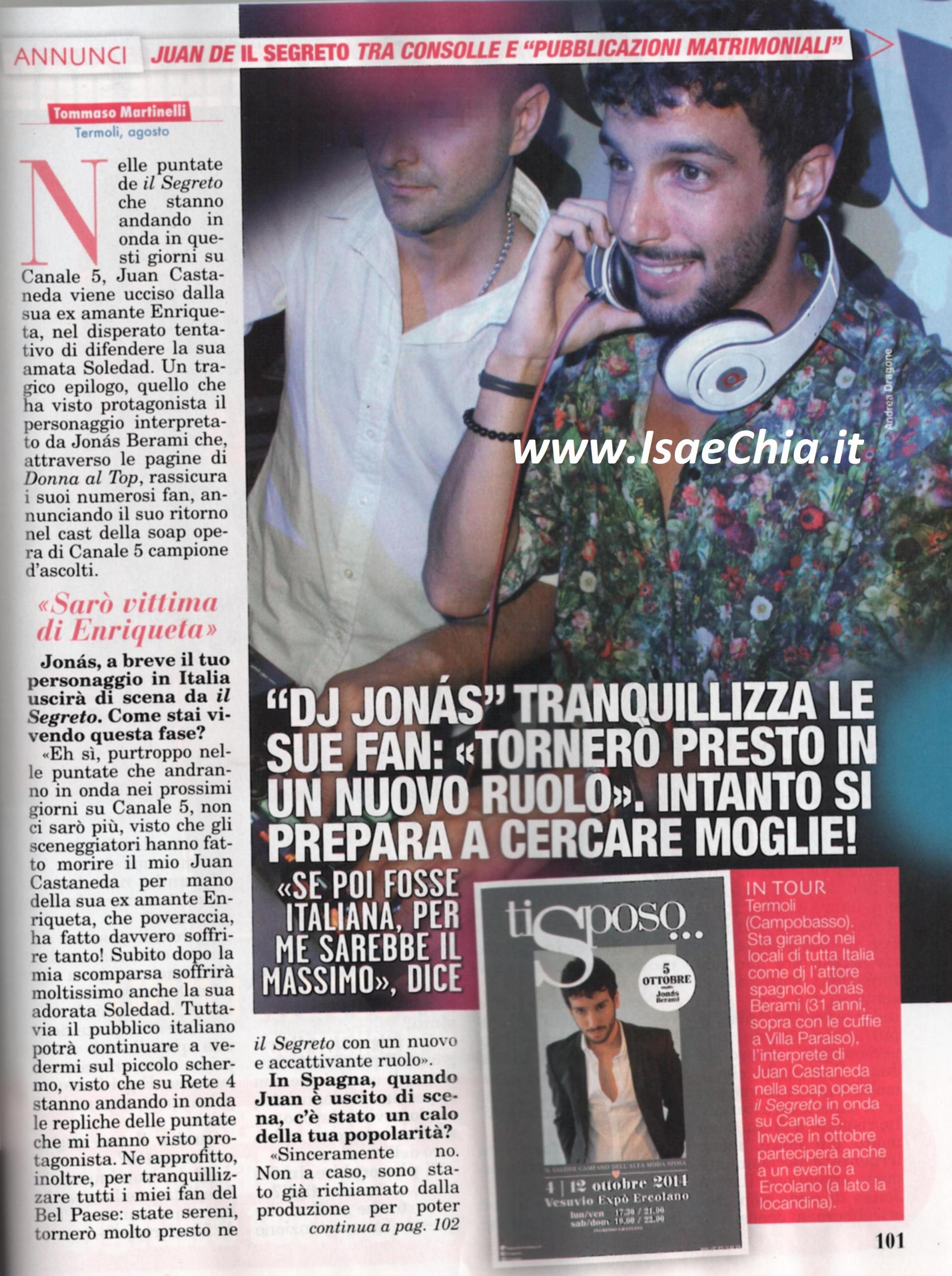 Nelle puntate de Il segreto che stanno andando in onda su Canale 5, Juan Castaneda viene ucciso dalla sua ex amante Enriqueta, e per Jonàs Berami, l’attore che interpreta Juan, ci sarà quindi un tragico epilogo: “Sì, purtroppo nelle prossime puntate che andranno in onda, non ci sarò più: gli autori mi hanno fatto morire per mano di Enriqueta, che ha sofferto molto per colpa mia. Subito dopo la mia scomparsa soffrirà molto anche la mia adorata Soledad. Tuttavia, il pubblico potrà continuare a vedermi nelle puntate della scorsa stagione, ancora in onda su Rete 4. Inoltre, ne approfitto per tranquillizzare tutti i miei fan italiani: tornerò molto presto ne Il segreto in un nuovo, accattivante ruolo. In Spagna non c’è stato un calo della mia popolarità: infatti mi hanno richiamato a prendere parte a questa fiction che mi ha lanciato. In Italia mi amano forse anche più che in Spagna e non smetterò mai di scrivere sulle mie pagine Facebook e Twitter quanto qui mi senta a casa: non escludo un giorno di venire a vivere nella vostra Penisola. Si mangia bene, siete ricchi di arte e cultura e le donne sono meravigliose! Come resisto alle mie fan? So che loro sono affascinate dal mio personaggio e non da me: non mi si può conoscere in pochi minuti, in qualche locale, è necessario vivere la quotidianità”. Inoltre, ad ottobre Jonas sarà ospite dell’evento Ti sposo di Ercolano (NA): “Quando il mio ufficio stampa Laura Gorini, che è anche direttore artistico dell’evento, me l’ha proposto, non potevo crederci! In passato avevo espresso desiderio di visitare Napoli, anche perché ho una simpatia sia per la città che per la sua squadra di calcio”. Infine, chiedendogli della sua vita privata, risponde: “Non amo molto parlarne. La donna più importante della mia vita resta mia mamma, che è la mia prima fan. Se sono fidanzato? Forse sì, forse no. La ragazza per me deve essere se stessa sempre, deve essere dolce, passionale, con cervello. E se fosse italiana, sarebbe il massimo! Detesto volgarità e arroganza, come detesto gli uomini violenti con le donne. Mi piacerebbe molto avere figli, è mia intenzione rendere felice mia mamma!”
