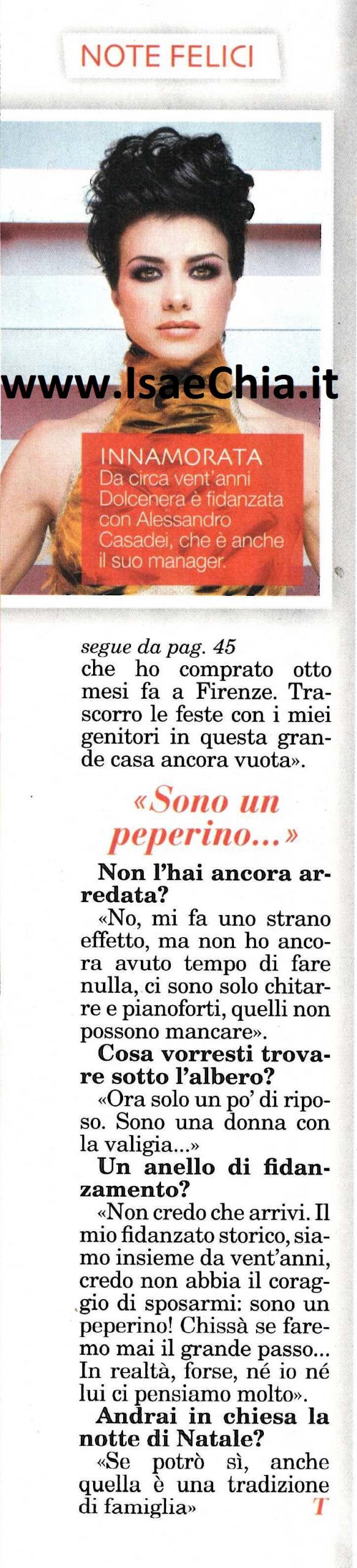 La sera del 24 dicembre la cantante Dolcenera sarà su Raidue e in contemporanea su RTL 102.5 per il Concerto di Natale. Dietro le quinte dell’evento, registrato lo scorso 13 dicembre, la cantante rivela: “E’ il mio terzo Concerto di Natale e devo dire che si tratta di un appuntamento importante e sentito per me, al quale partecipo sempre volentieri. Mi esibirò con Patti Smith e con Alessandra Amoroso in Silent night e canterò il mio ultimo singolo, Accendi lo spirito. Per me il Natale è la festa più importante, alla quale sono legati tanti ricordi bellissimi dell’infanzia: le feste trascorse nella mia città, Galatina, sono tra i momenti indimenticabili della mia vita. Tutta la famiglia si riuniva a casa dei nonni, eravamo una quarantina di parenti, mangiavamo, giocavamo…“. Quando le si chiede invece come passerà questo Natale, Manuela (questo è il suo nome di battesimo), risponde: “Sarà un Natale particolare, che festeggerò nella mia prima vera casa, comprata otto mesi fa a Firenze. Trascorro il Natale con i miei genitori in questa grande casa vuota. Mi fa uno strano effetto, ma non ho ancora avuto il tempo di arredarla. Ci sono solo chitarre e pianoforti: quelli non possono mancare!“. Infine, quando le si chiede se si aspetta come regalo di Natale un bell’anello di fidanzamento dal suo fidanzato, risponde: “Vorrei solo un po’ di riposo: sono una donna con una valigia. L’anello non credo che arrivi. Sto con il mio fidanzato storico da vent’anni, ma non credo che abbia il coraggio di chiedermi di sposarlo: sono un peperino! Chissà se faremo mai il grande passo…In realtà né io né lui ci pensiamo tanto!“