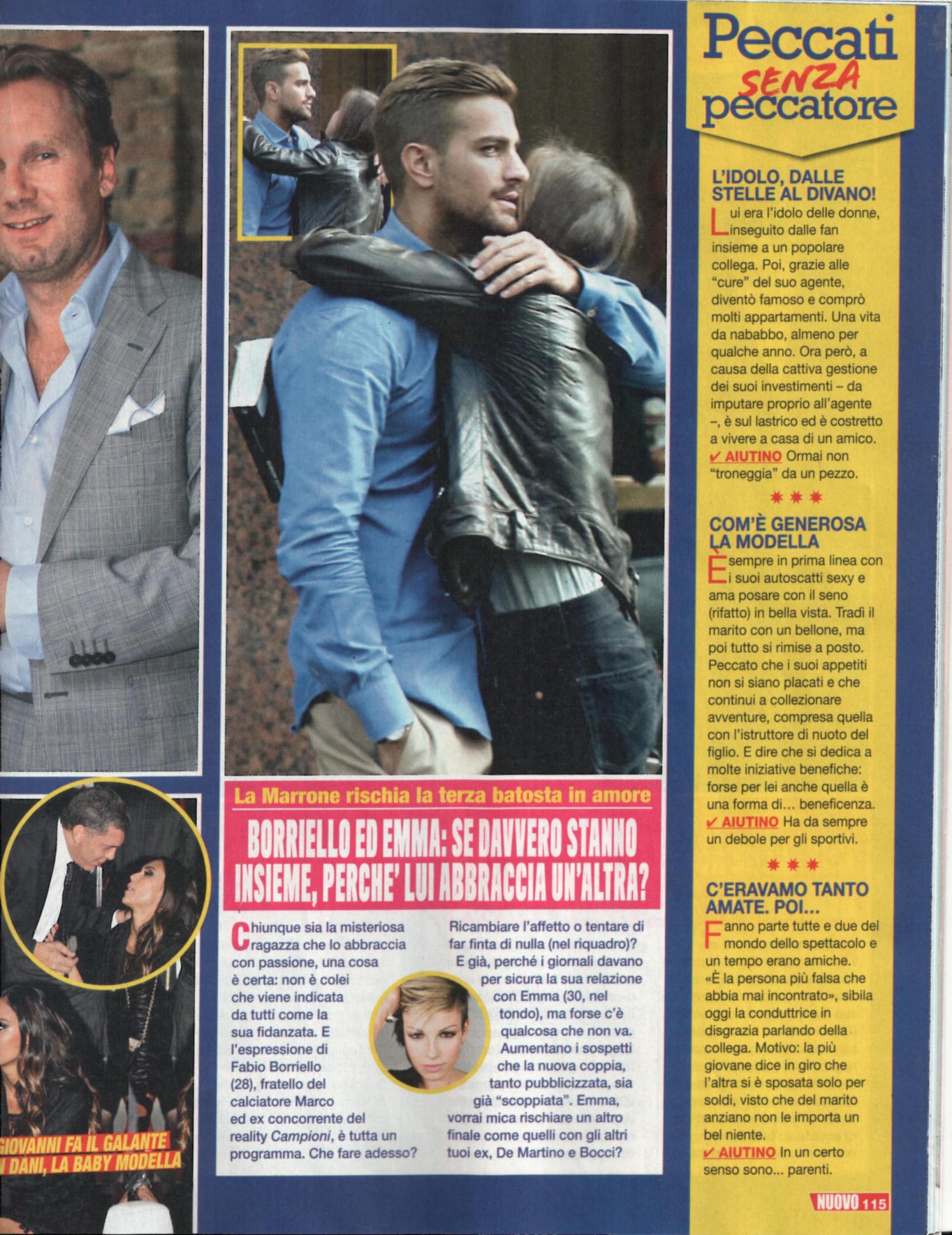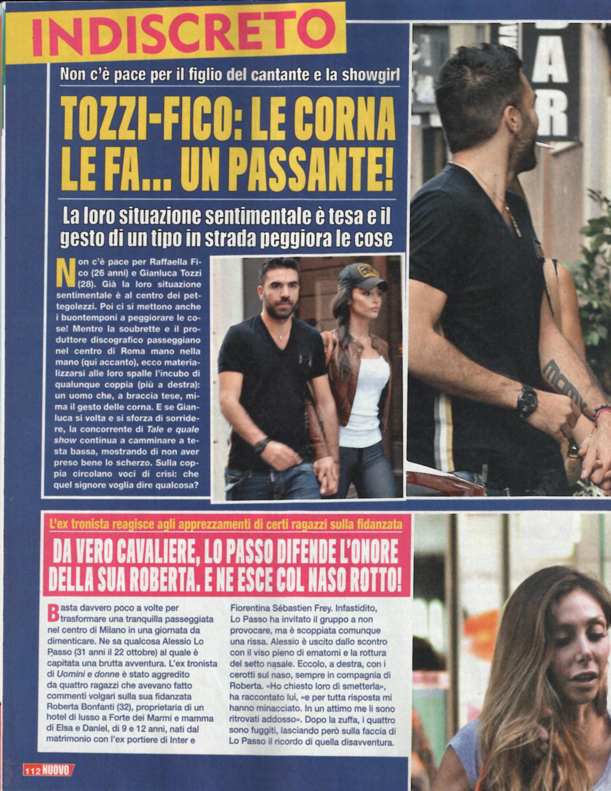 E parlano di matrimonio anche l’ex gieffina Raffaella Fico e il fidanzato Umberto Tozzi. La concorrente del Tale e quale show e il figlio d’arte sono stati protagonisti di un curioso episodio mentre erano in giro per Roma: all’improvviso un uomo si è materializzato alle loro spalle e, a braccia tese, ha fatto il gesto delle corna. Gianluca si è girato e l’ha presa sul ridere, ma la Fico non ha preso bene lo scherzo e ha continuato a camminare a testa bassa.