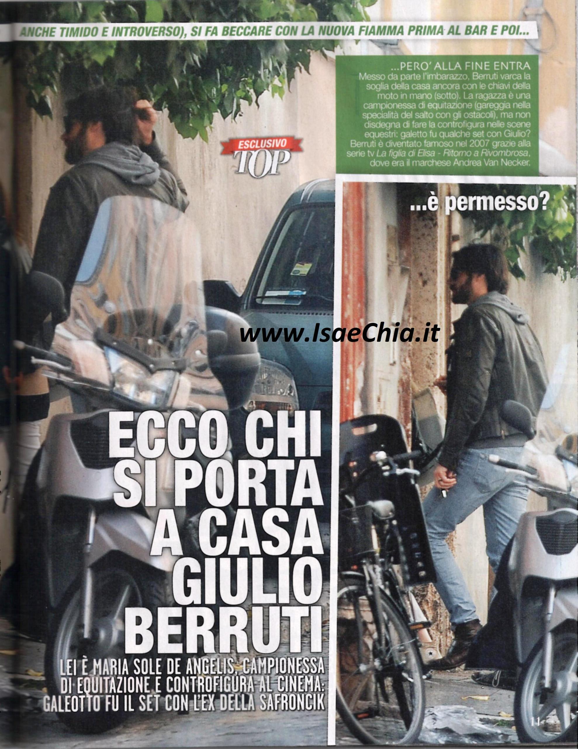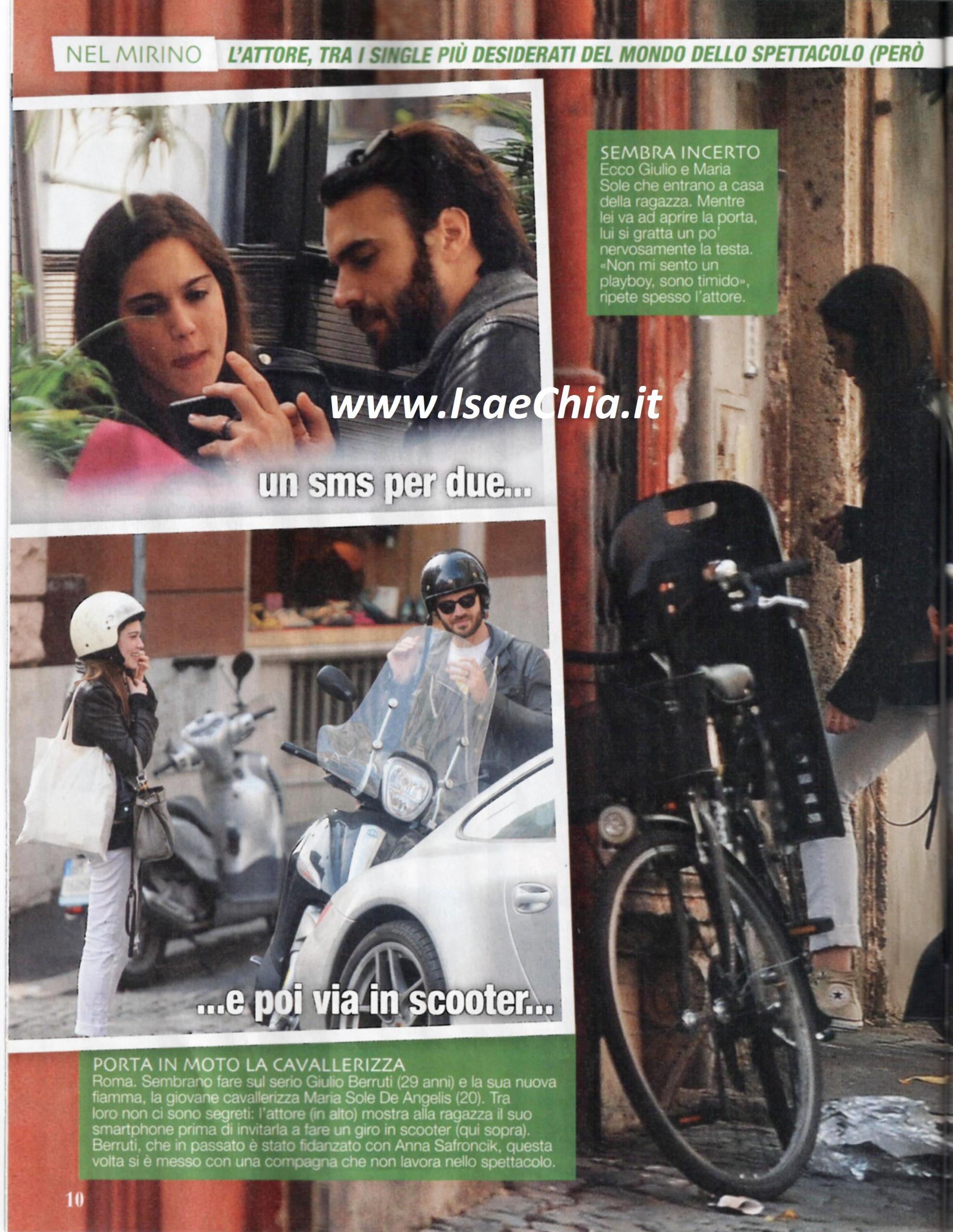 “Non mi sento un playboy, sono timido” ha dichiarato più volte l’attore Giulio Berruti, finora considerato uno degli “scapoli” più ambiti d’Italia. Ma pare che anche lui abbia trovato la donna giusta: lei si chiama Maria Sole De Angelis, ha 20 anni ed è una campionessa di equitazione. Eccoli insieme a Roma durante un’uscita: lui le mostra lo smartphone e lei legge qualcosa. Ciò dimostra che tra i due le cose sono serie e non ci sono segreti. Poi mettono il casco e saltano in sella alla moto di lui. Giunti a casa di lei, lui sembra un po’ incerto e si gratta la testa, ma alla fine si decide ed entra.