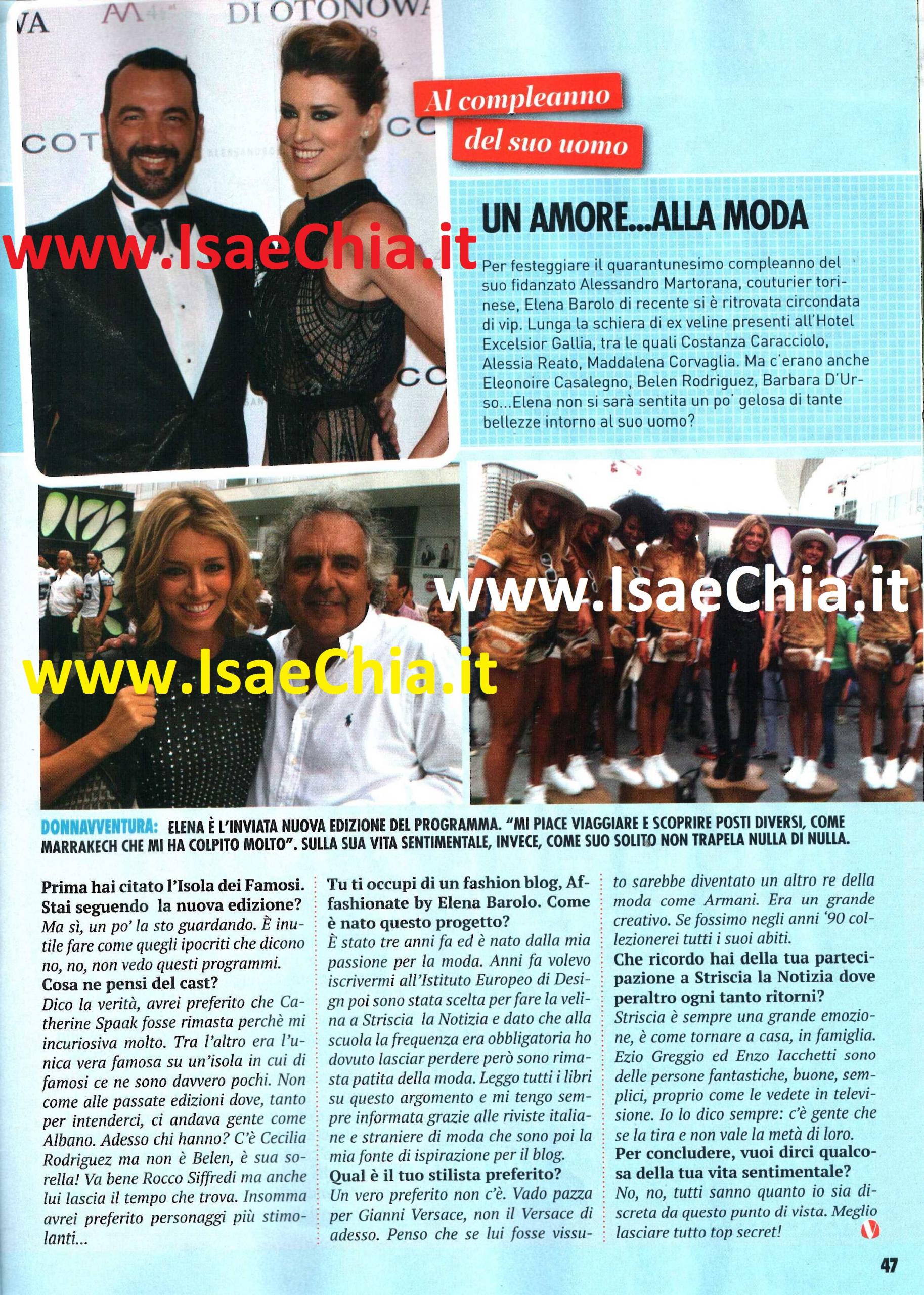 Elena Barolo è stata Velina di Striscia la notizia insieme a Giorgia Palmas tra il 2002 e il 2004; da allora è diventata fashion blogger e ora ha un nuovo ruolo, quella di inviata per Donnavventura: “Seguivo la trasmissione ogni tanto, così quando mi hanno proposto di collaborare, ho accettato: calcolate che io non sto in giro come le ragazze del programma, ma le raggiungo in posti comodi e “civilizzati” che raggiungo tranquillamente in aereo. Comunque, se mi avessero proposto il loro ruolo, penso che avrei accettato comunque: qui si viaggia in auto e a me guidare piace molto. Il programma però non prevede che le ragazze siano già “famose”, non è l’Isola dei famosi dove i concorrenti si trovano in spiaggia abbandonati. Finora la città che mi ha colpito di più è Marrakech: ha una bella storia, si sente che è una città che vibra, un po’ come Napoli. E’ una città araba, ma lì la gente è abituata agli occidentali“. Riprendendo l’Isola dei famosi, che ha citato prima e che ha visto come vincitrice proprio la sua collega Giorgia Palmas qualche anno fa, quando le si chiede se sta seguendo la decima edizione, Elena risponde: “Ma sì, un po’ la sto guardando. Avrei preferito che Catherine Spaak restasse perché mi incuriosiva molto ed era l’unica vera famosa! Nelle altre edizioni c’erano persone come Al Bano, adesso chi c’è? C’è Cecilia Rodriguez, ma non è Belén, è sua sorella! Va bene Rocco Siffredi, ma anche lui lascia il tempo che trova. Mi sarebbero piaciuti personaggi più stimolanti“. Infine, conclude parlando della sua grande passione, la moda: “Il mio blog Affashionate è nato tre anni fa dalla mia passione. Anni fa volevo iscrivermi all’Istituto Europeo di Design, poi sono stata scelta come Velina e dato che la presenza era obbligatoria, ho dovuto lasciar perdere. Ma leggo tutti i libri sull’argomento e mi tengo sempre informata grazie alle riviste, fonte di ispirazione per il mio blog. Non ho un vero stilista preferito; vado pazza per Gianni Versace, ma non quello di adesso. Penso che se lui fosse vissuto, sarebbe diventato un altro re della moda come Armani. Era un grande creativo e se fossimo negli anni ’90 comprerei tutti i suoi abiti“.