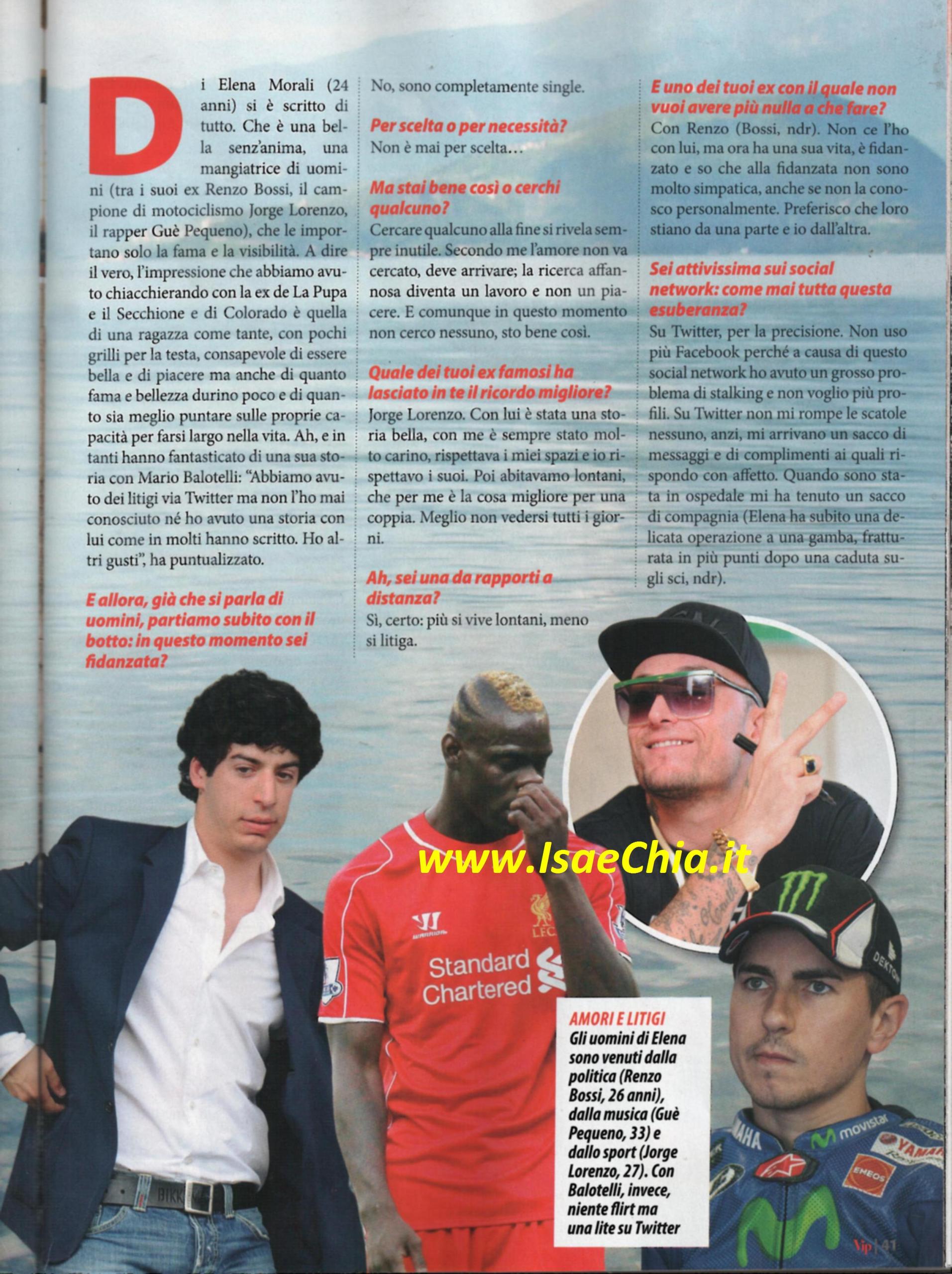 L’ex Pupa Elena Morali viene spesso descritta come mangiauomini, ma da questa sua intervista si capisce che non è proprio così: “Sono completamente single, e non è per scelta, non lo è mai. Cercare qualcuno si rivela sempre inutile: l’amore non va cercato, deve arrivare. E comunque in questo momento non cerco nessuno, sto bene così. Jorge Lorenzo è l’ex che mi ha lasciato il ricordo migliore: è stata una storia molto bella, rispettava i miei spazi, e abitavamo lontani, che è la cosa migliore per una coppia: meglio non vedersi tutti i giorni. Con Renzo Bossi, invece, non vorrei avere più niente a che fare. Non ce l’ho con lui, ma ora ha una sua vita, è fidanzato e so che alla sua fidanzata non sono molto simpatica, anche se non ci conosciamo personalmente”. Parlando di social network, spiega: “Non uso più Facebook perché a causa sua ho avuto un problema di stalking. Su Twitter invece non mi rompe le scatole nessuno, ricevo molti complimenti e rispondo con affetto. Mi piace provocare con degli scatti audaci, ma è solo un gioco. Nella vita normale non posso farlo, altrimenti mia madre mi ammazza! Twitter mi ha tenuto compagnia durante la convalescenza, in seguito al mio incidente alla gamba: ora, dopo dieci mesi, riesco a camminare meglio”. Poi, rivela i progetti per il futuro: “Sto conducendo dei laboratori comici che servono per prepararmi per la prossima stagione di Colorado, per il quale sto preparando un personaggio nuovo con un comico. Tra i reality, mi piacerebbe partecipare a Pechino Express: sembro delicata, ma sono tosta. E mi piacerebbe vivere in posti come quelli, dove basta avere poco per stare bene. Il cinema? No, non credo di avere la preparazione giusta e io non faccio le cose giusto così, per farle”. Infine, quando le si chiede della sua amicizia con Francesca Pascale, la compagna dell’ex Premier Silvio Berlusconi, risponde: “Ci conosciamo da tre anni, ci siamo trovate subito parlano di animali. Ci vedevamo anche tre, quattro volte la settimana, poi ha ufficializzato la sua relazione con Berlusconi, quindi non può uscire più come prima, ma ci sentiamo spesso. Ci siamo state vicine nei momenti brutti” e conclude con due parole su altri due (presunti) flirt: Mario Balotelli e Gué Pequeno: “Troppo montato il primo. L’altro, fa il duro ma dentro è buono. E poi è un figo”.