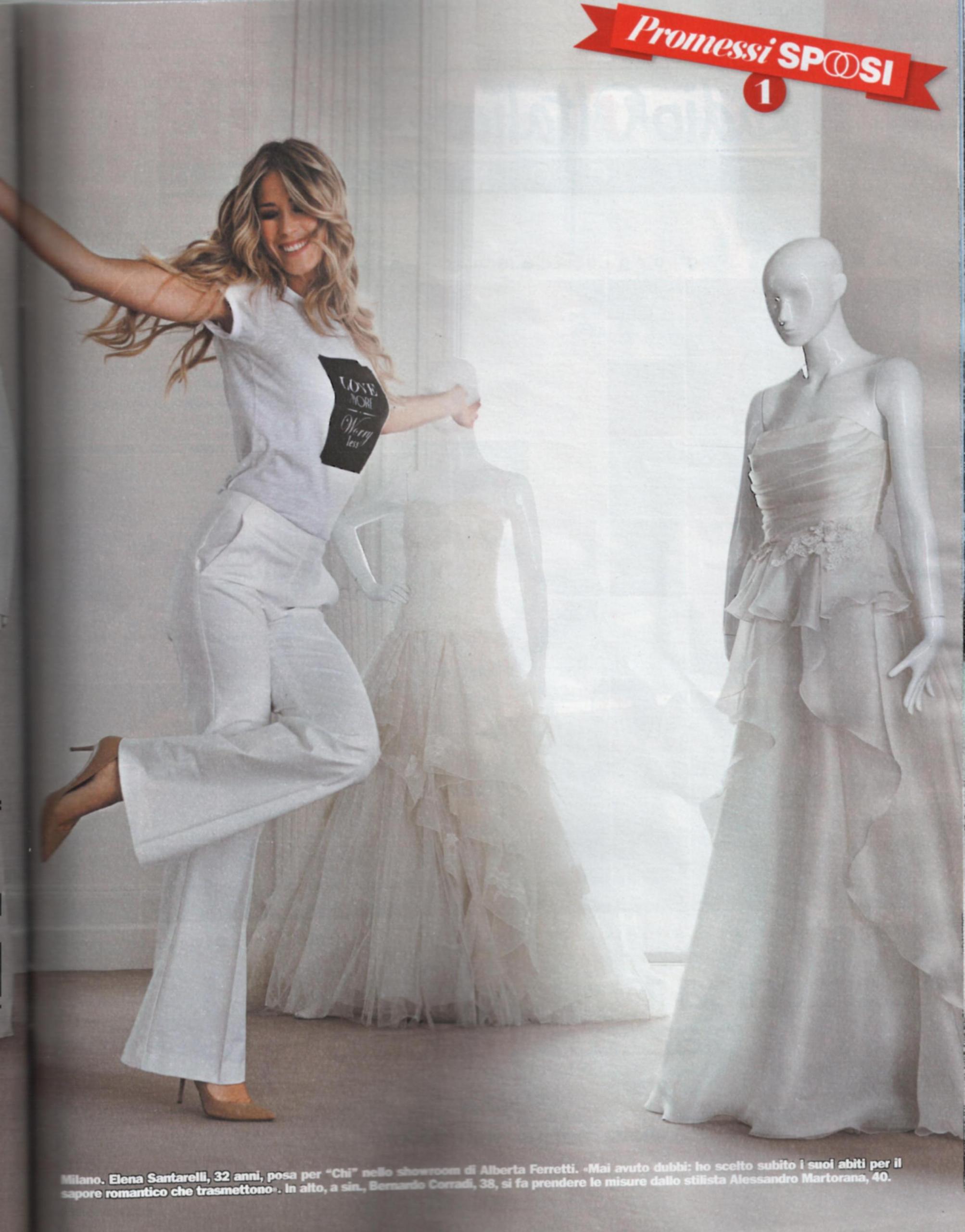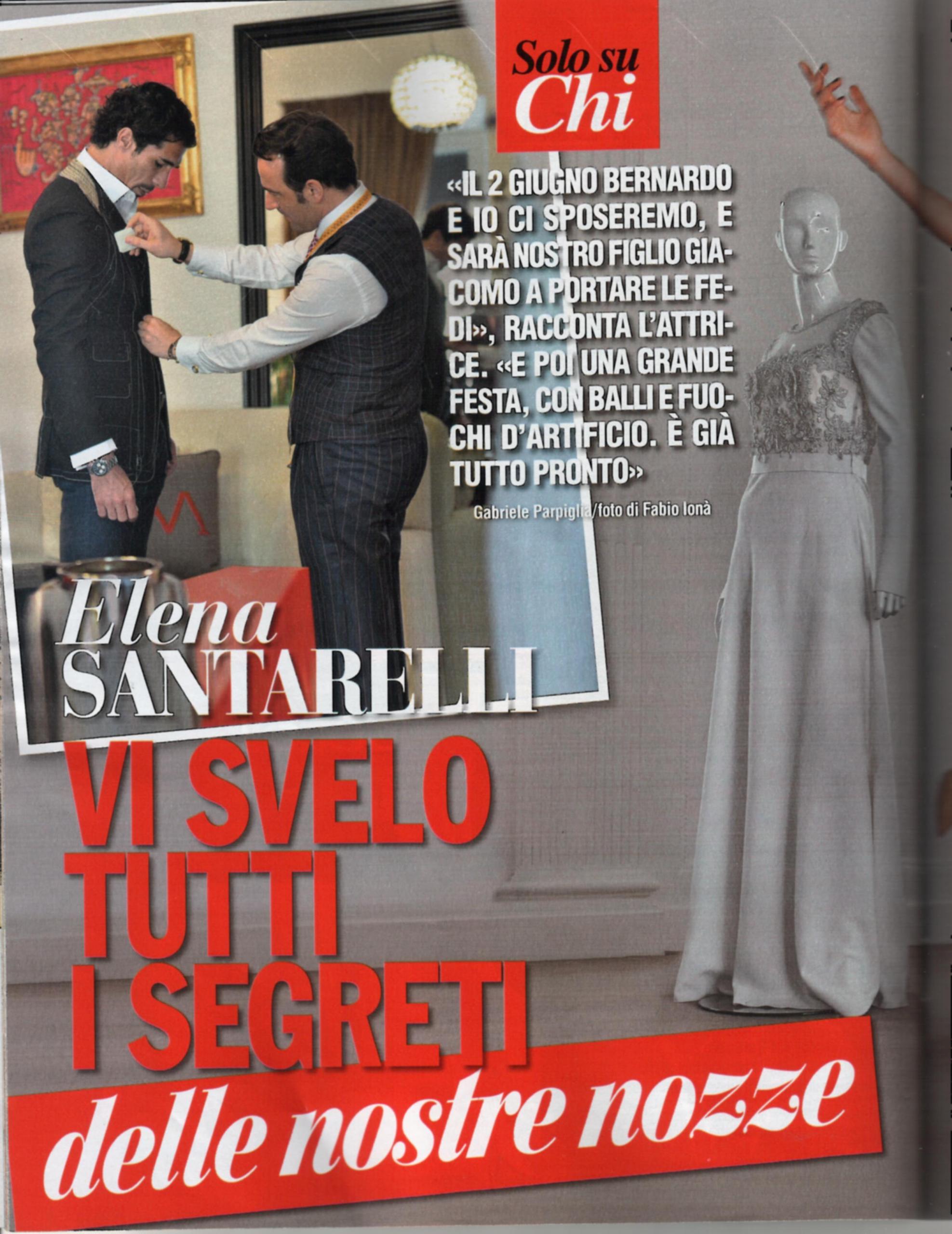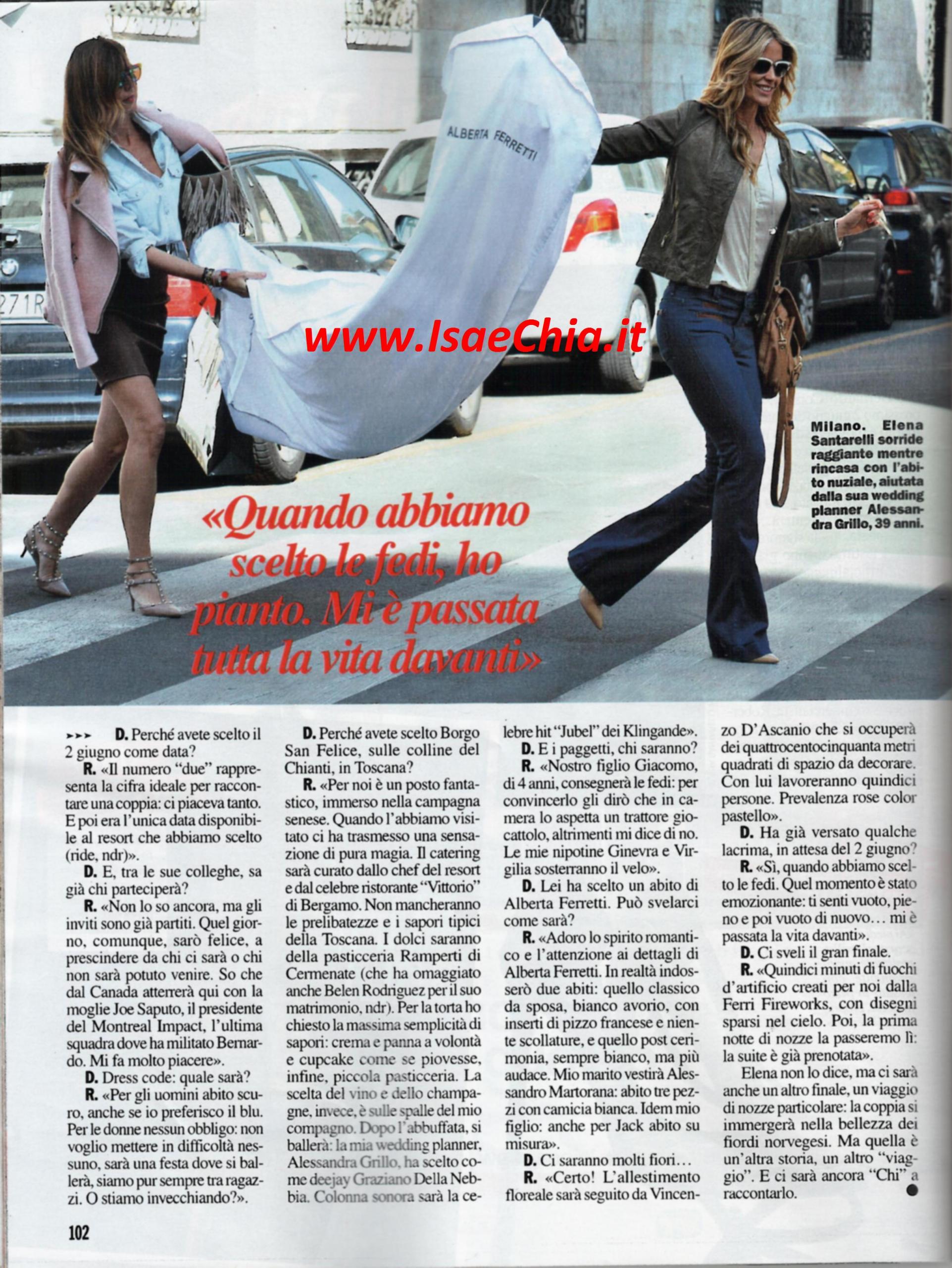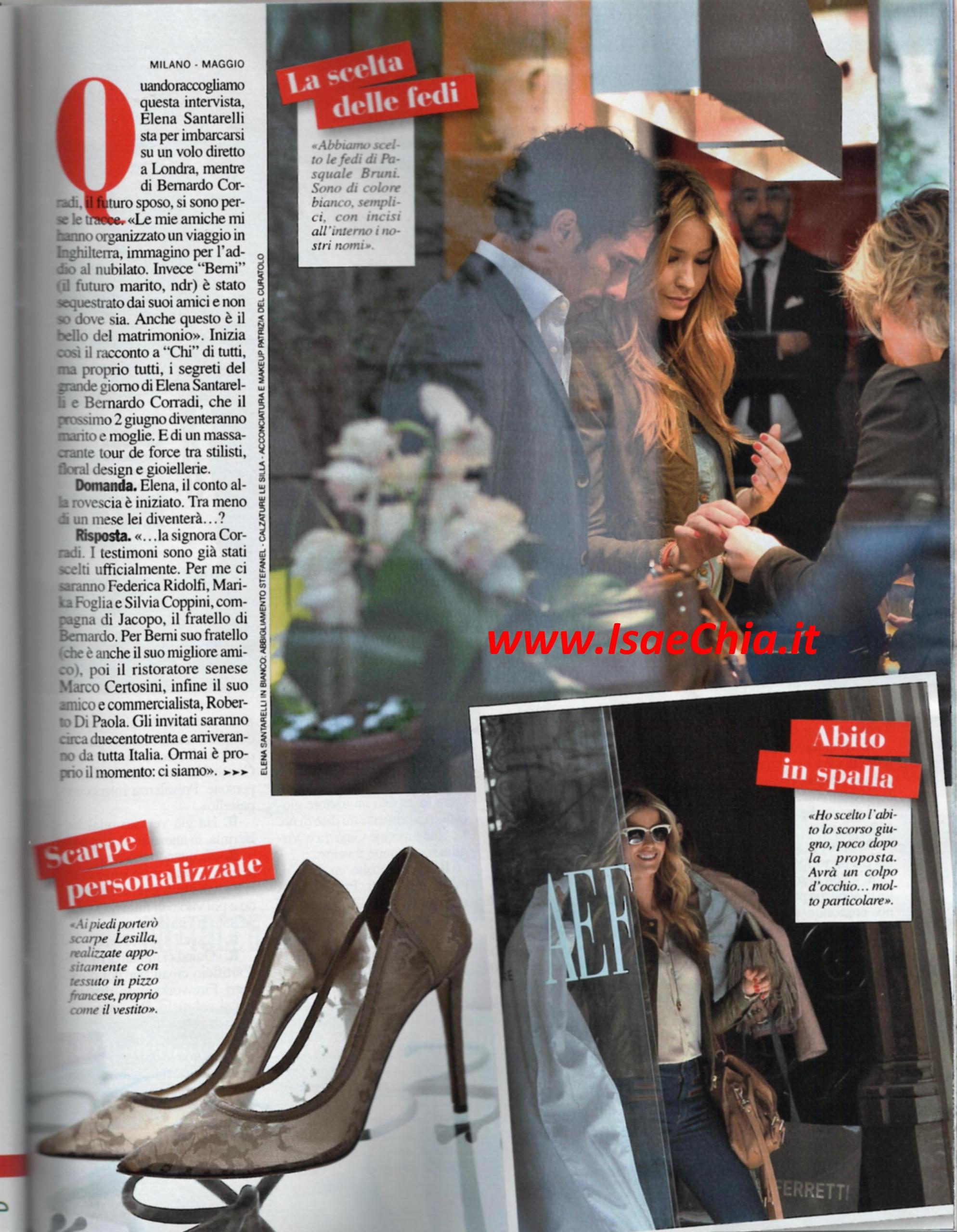 Il prossimo 2 giugno, la showgirl Elena Santarelli convolerà a nozze con il calciatore Bernardo Corradi. Mentre rilascia quest’intervista, sta per salire su un volo diretto a Londra: “Le mie amiche mi hanno organizzato un viaggio, mentre Berni è stato sequestrato dagli amici e non so dove sia” rivela l’ex naufraga, in procinto di vivere l’addio al nubilato. “I testimoni sono stati scelti: per me saranno Federica Ridolfi, Marika Foglia e Silvia Coppini, compagna di Jacopo, il fratello di Bernardo. Per lui suo fratello, poi il ristoratore Marco Certosini e il suo commercialista Roberto Di Paola. Gli invitati saranno circa 230 e arriveranno da tutta Italia. Abbiamo scelto il 2 giugno perché il 2 rappresenta la coppia…E poi perché era l’unica data disponibile al resort che abbiamo scelto! Per gli uomini sarà gradito l’abito scuro, per le donne nessun obbligo, non voglio mettere in difficoltà nessuno e sarà una festa in cui si ballerà. Abbiamo scelto Borgo San Felice, in Toscana, perché è un posto fantastico, immerso nelle campagne. Il catering sarà curato dallo chef del resort e dal ristorante Vittorio di Bergamo, mentre i dolci saranno della pasticceria Ramperti di Cermenate (gli stessi di Belén Rodriguez). Dopo l’abbuffata si ballerà e la mia wedding planner, Alessandra Grillo, ha scelto come dj Graziano Della Nebbia. Mio figlio Giacomo, di 4 anni, farà il paggetto e consegnerà le fedi, mentre le mie nipotine reggeranno il velo. Indosserò due abiti, firmati Alberta Ferretti: quello da cerimonia, bianco avorio, con inserti in pizzo francese e niente scollature, e quello post cerimonia, sempre bianco, ma più audace. Mio marito e mio figlio vestiranno Alessandro Martorana. Il momento più emozionante è stato quando abbiamo scelto le fedi: ti senti vuoto, pieno e poi di nuovo vuoto, mi è passata la vita davanti. Il finale? Fuochi d’artificio e poi la prima notte è già prenotata nella suite”. Il viaggio di nozze, invece, sarà tra i fiordi norvegesi.