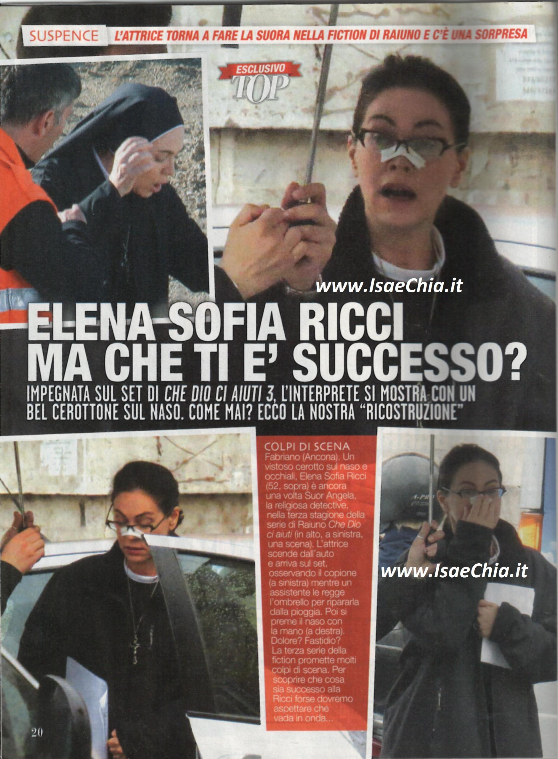 La rivista Top ha fotografato Elena Sofia Ricci in pose in cui è irriconoscibile: con tanto di cerotto sul naso e occhiali da vista. Ma il mistero è presto svelato, niente incidenti né naso rifatto. L’attrice è a Fabriano (AN) ed è ancora una volta sul set della serie di RaiUno Che Dio ci aiuti, infatti c’è chi regge l’ombrello per lei mentre ha il copione tra le mani. Elena Sofia si preme poi il naso con la mano: prova dolore o fastidio? Non si sa e per aspettarlo dovremmo per forza aspettare che le puntate vadano in onda!