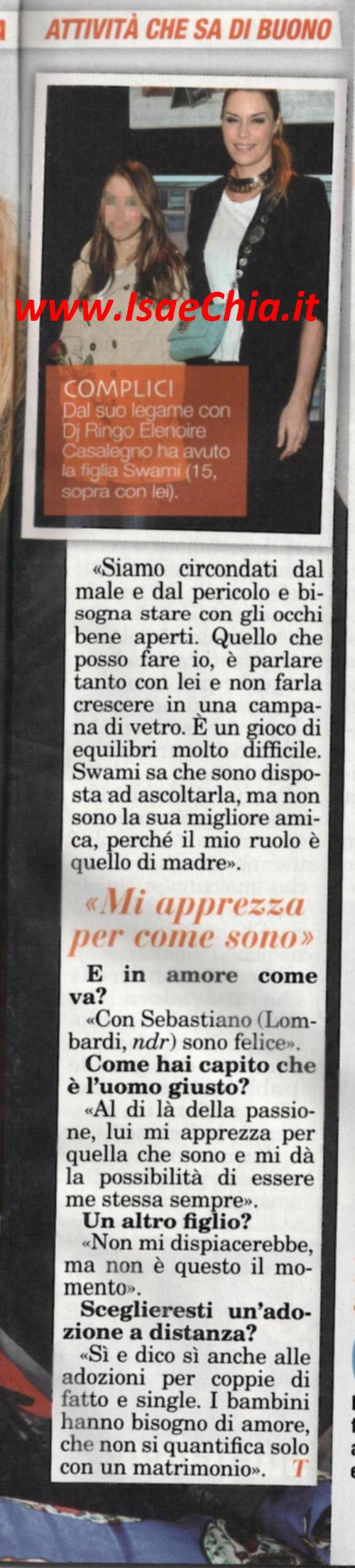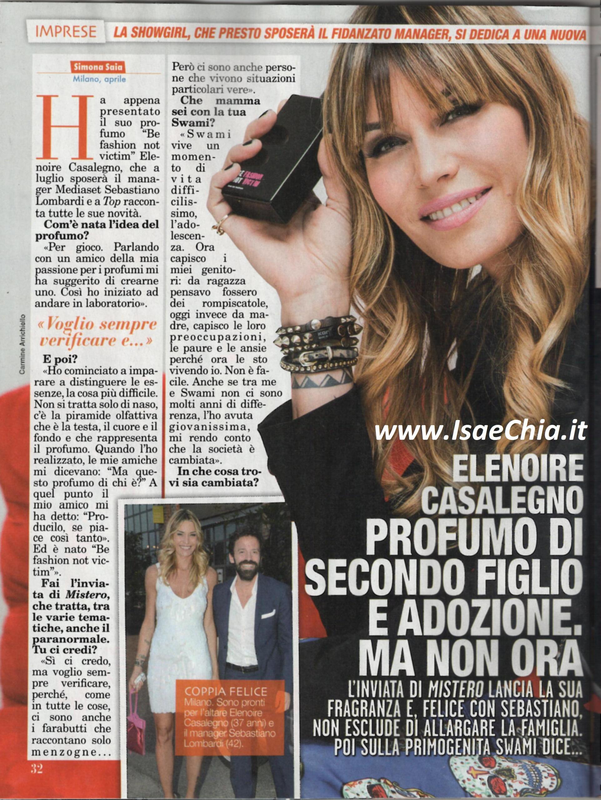 La conduttrice Elenoire Casalegno ha annunciato il matrimonio col fidanzato, il manager Sebastiano Lombardi, ma nel frattempo ha lanciato un profumo, Be fashion, not victim: “E’ nato per gioco: parlando con un amico della mia passione per i profumi, mi ha suggerito di crearne uno, così ho iniziato ad andare in laboratorio. Ho cominciato ad imparare e distinguere le essenze: è la cosa più difficile. Quando l’ho realizzato, le mie amiche mi chiedevano: “Ma questo profumo di chi è?” e a quel punto ho detto al mio amico: “Producilo, visto che piace tanto”. Parlando del suo ruolo di mamma, invece, racconta: “Swami vive un periodo difficilissimo, l’adolescenza, e ora capisco le paure e le ansie che vivevano i miei genitori. Anche se tra me e lei ci sono pochi anni di differenza perché l’ho avuta giovanissima, la società è cambiata, siamo circondati dal male. Quello che posso fare io è non farla crescere in una campana di vetro. Con Sebastiano sono felice. Al di là della passione, ho capito che era quello giusto perché mi apprezza per quella che sono e mi dà la possibilità di essere me stessa sempre. Un altro figlio non mi dispiacerebbe, ma non è questo il momento. Io sceglierei un’adozione a distanza e dico sì anche alle adozioni per coppie di fatto e single. I bambini hanno bisogno di amore, che non si quantifica solo col matrimonio”.