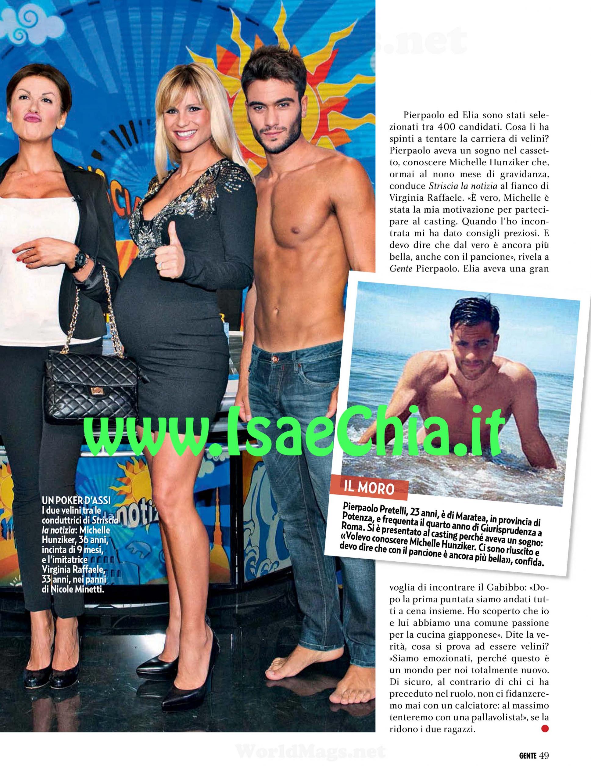 Per l’edizione n° 26 di Striscia, Antonio Ricci aveva deciso di apportare una grande novità: dei Velini al posto delle Veline, secondo alcuni per mantenere la promessa di escludere le veline se Miss Italia non fosse stato trasmesso dalla Rai. Così il bruno Pierpaolo Pretelli, 23 anni, di Maratea (PZ) e il biondo Elia Fongaro, 22, di Arzignano (VI) hanno ballato sul bancone per qualche settimana. Ora, però, sono tornate le classiche veline (la bruna Ludovica Frasca e la bionda Irene Cioni) e i due tornano alla vita di prima: “Dopo 25 anni di donne, abbiamo stabilito un punto di partenza e ristabilito il man power. Io faccio il modello e forse tornerò in tv, magari per fare il giornalista” dice Elia, il più impulsivo dei due. “La scuola di Striscia e le regole che ci hanno imposto hanno fatto crescere in me la voglia di studiare e di applicarmi, di capire se in questo mondo potrò avere un’opportunità” confessa Pierpaolo. “Quando sono tornato al mio paese, quasi mi eleggevano sindaco e mia mamma è diventata una star” scherza poi. I due raccontano i loro rapporti con Michelle Hunziker e Virginia Raffaele, definite “umane e professionali” ed Elia svela che “Ricci ci ha detto che fuori da Striscia, non avremmo mai dovuto sgarrare”. Infine, dopo aver rivelato che accolgono molti complimenti anche dagli uomini, confessano: “Noi siamo stati i Velini della “spending review“: sia col trucco che con il look: tutto al risparmio rispetto alle Veline, lo scriva!”