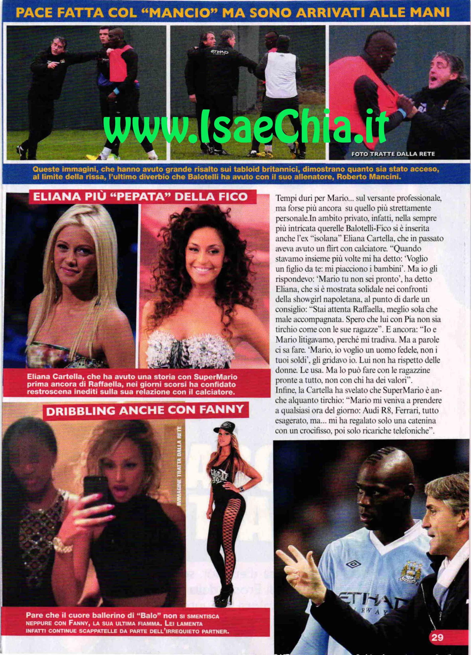 Ancora una volta, il calciatore Mario Balotelli si è messo nei guai, in seguito ad un’accesa discussione con l’allenatore del Manchester, Roberto Mancini, che si aggiunge al fatto che nell’intera stagione abbia realizzato solo tre goal. Sul lato sentimentale, la querelle con Raffaella Fico, che ha dato alla luce la piccola Pia, sembra ancora aperta e ora si aggiunge anche Eliana Cartella. La naufraga dell’Isola dei famosi ha infatti dichiarato: “Quando stavamo insieme Mario mi ha detto più volte: “Voglio un bambino da te, mi piacciono i bambini” ma io gli ho risposto: “Mario, tu non sei pronto”. E ancora: “Litigavamo perché mi tradiva. Non ha rispetto delle donne, le usa. Inoltre, è tirchio: mi veniva a prendere a tutte le ore, ma mi ha regalato solo una catenina e ricariche telefoniche. Raffaella, meglio sola che male accompagnata: spera che non sia così anche con Pia!”
