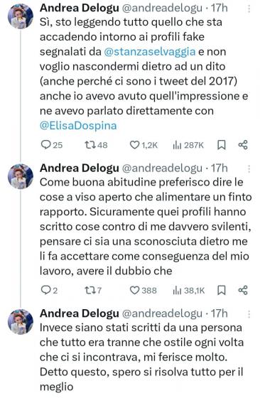 Anche Andrea Delogu, una delle vip attaccate dagli account fake, è intervenuta sulla questione, confermando di aver sospettato da tempo che Elisa D’Ospina potesse essere collegata ai profili fake. La Delogu ha espresso il suo disappunto per gli attacchi subiti e la delusione nel pensare che potessero provenire da una persona con cui aveva un buon rapporto.