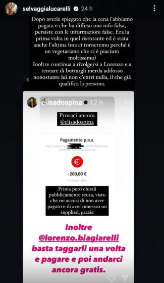 Sentendosi sotto attacco, la D’Ospina ha risposto indirettamente, prendendo di mira il compagno di Selvaggia, Lorenzo Biagiarelli. Lo ha accusato di aver fatto un post #SuppliedBy a un ristorante senza utilizzare gli hashtag appropriati. la Lucarelli ha replicato con una serie di stories su Instagram, spiegando che la cena in questione era seguita alla presentazione del suo libro e che era stata pagata da Biagiarelli stesso, fornendo anche uno screenshot come prova.