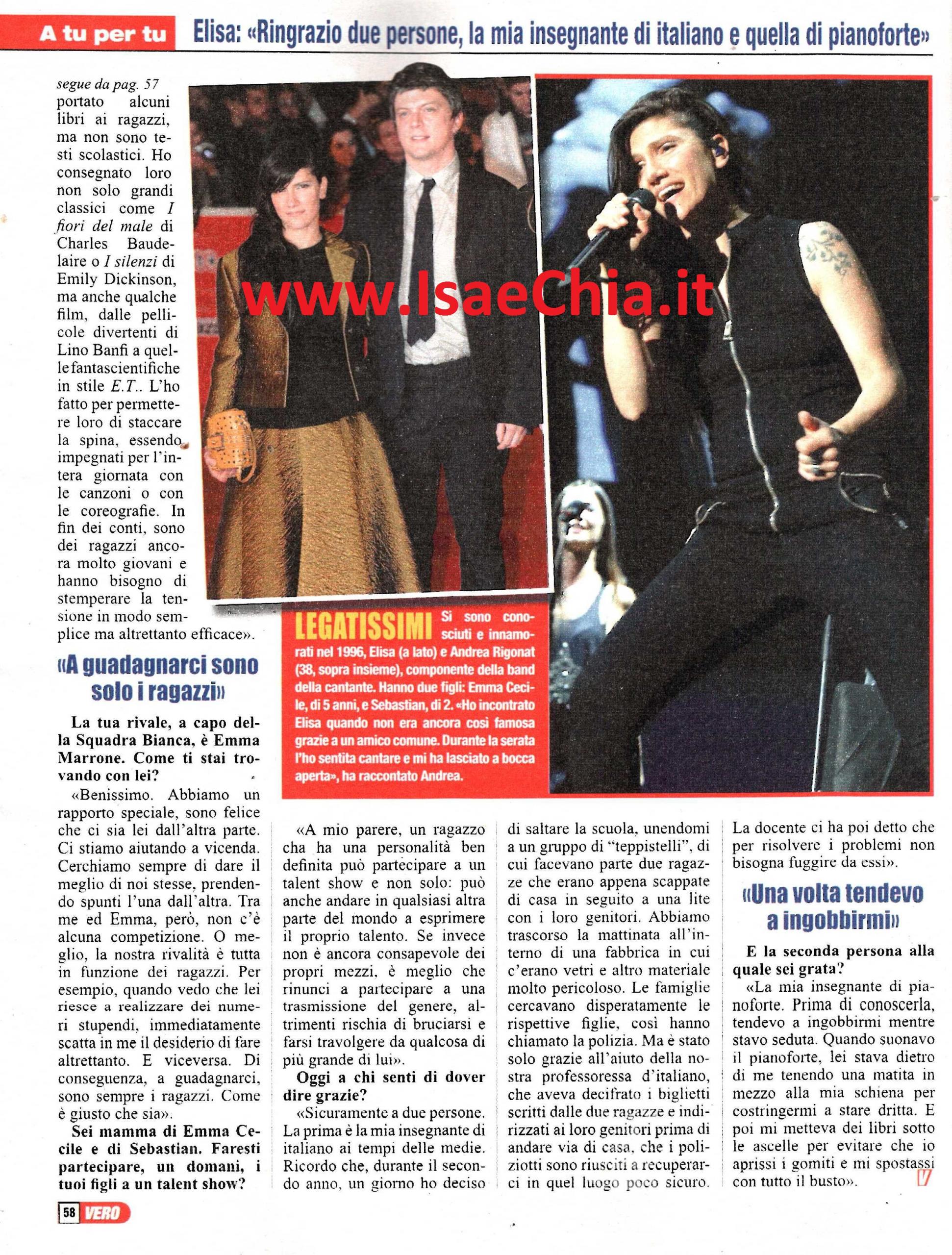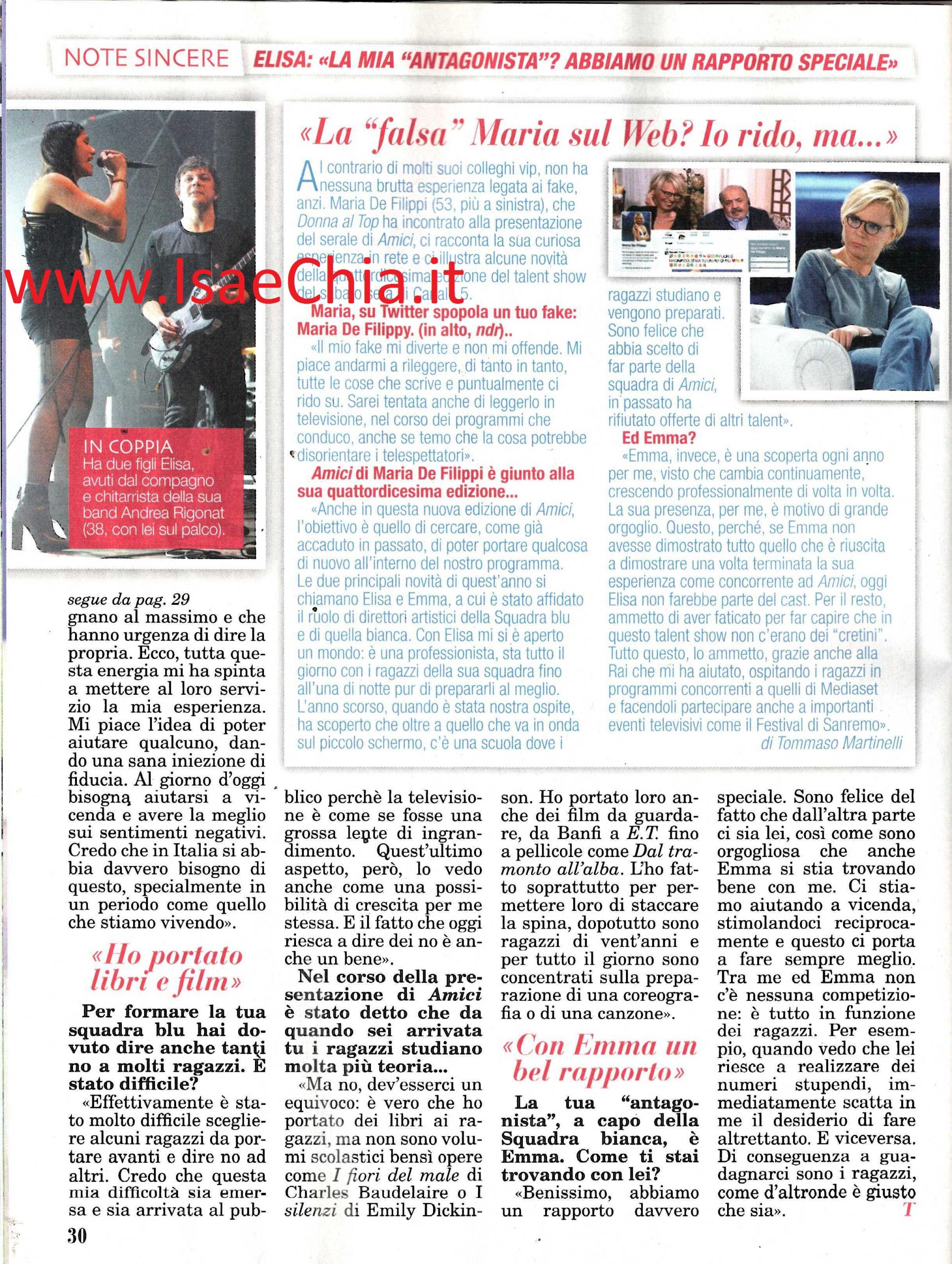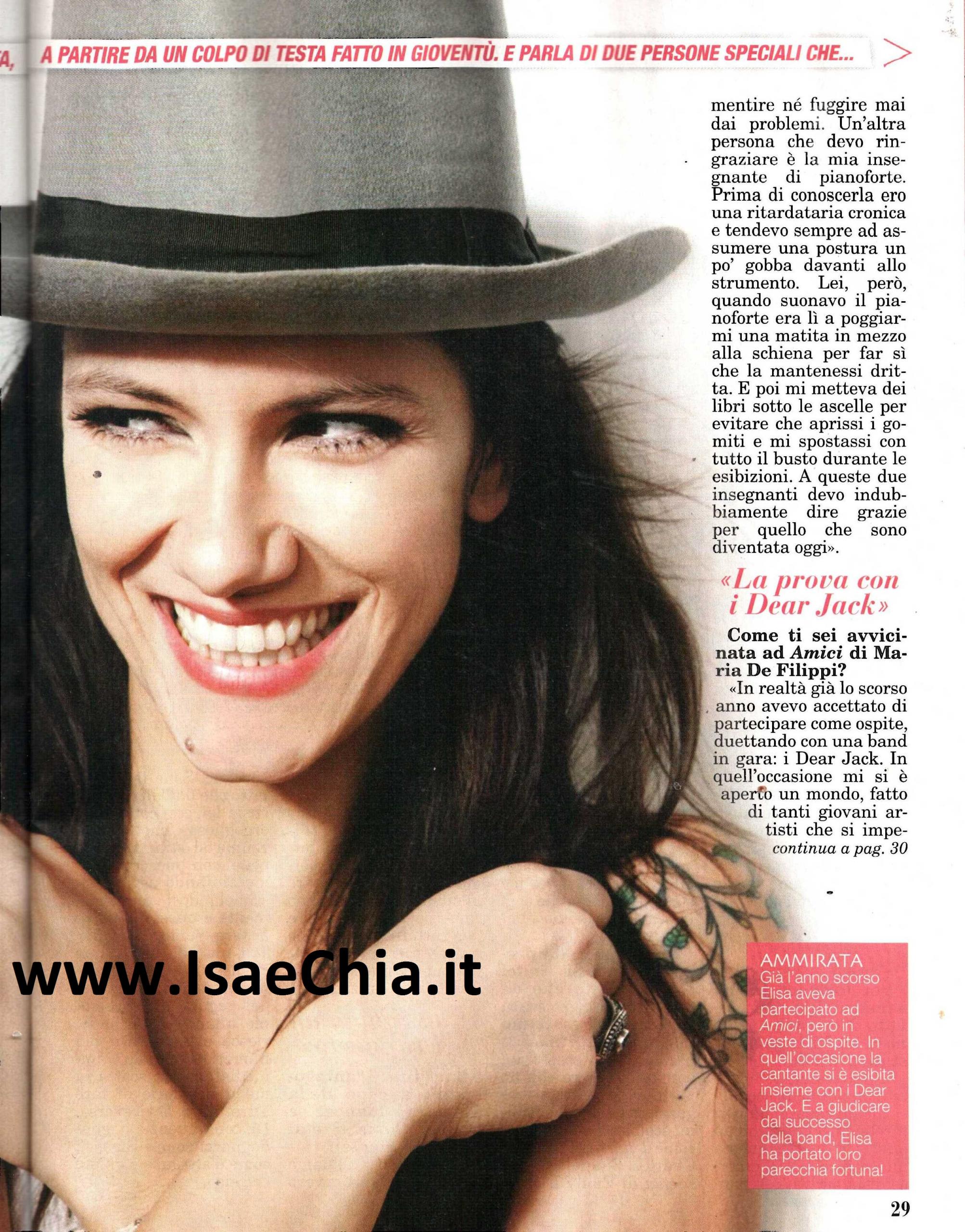 Per tanti giovani rappresenta un esempio di determinazione e talento e adesso ha svelato anche il suo lato umano e a volte più leggero partecipando ad Amici come coach. Quando le si chiede a chi sente di dover dire grazie, la cantante Elisa risponde: “Sicuramente a due persone: la mia insegnante di italiano alle scuole medie è la prima. Ricordo che durante il secondo anno avevo deciso di saltare la scuola, unendomi a un gruppo di teppistelli di cui facevano parte anche due ragazze che erano scappate di casa. Abbiamo trascorso la mattina in una fabbrica in cui c’erano vetri rotti e materiali pericolosi. Alla fine siamo stati rintracciati dalle forze dell’ordine perché una delle due ragazze aveva lasciato un bigliettino a casa. Non dimenticherò che in quell’occasione la mia prof. mi ha fatto capire che non bisogna né mentire, né fuggire dai problemi. Un’altra persona che devo ringraziare è la mia insegnante di pianoforte: prima di conoscerla ero una ritardataria cronica e tendevo sempre ad avere una postura gobba davanti ad uno strumento. Lei però mi poggiava una matita dietro la schiena per far sì che la tenessi dritta e i libri sotto le ascelle“. Quando le si chiede quando si è avvicinata ad Amici, Elisa ricorda: “Già lo scorso anno avevo accettato di partecipare come ospite, duettando con i Dear Jack. Mi si è aperto un mondo, fatto di giovani che si impegnano al massimo e hanno urgenza di dire la propria. Tutta quest’energia mi ha spinta a mettere al loro servizio la mia esperienza. Mi piace l’idea di poter aiutare qualcuno, dando una sana iniezione di fiducia. Credo che l’Italia abbia bisogno di questo, di aiutarsi a vicenda. E’ stato molto difficile scegliere dei ragazzi da portare avanti e altri a cui dire di no, e credo che questa mia difficoltà sia emersa. Però vedo quest’aspetto come una possibilità di crescita per me stessa e il fatto che oggi io riesca a dire di no è anche un bene“. Infine, quando le si chiede come si trova con la sua “rivale” Emma, coach della squadra bianca, la cantante friulana risponde: “Benissimo, abbiamo davvero un rapporto speciale. Sono felice che dall’altro lato ci sia lei, così come orgogliosa che lei si stia trovando bene con me: ci stiamo aiutando a vicenda, stimolandoci reciprocamente e questo ci porta a fare sempre meglio. Tra me ed Emma non c’è nessuna competizione, è tutto in funzione dei ragazzi. Per esempio, quando vedo che lei riesce a realizzare dei numeri stupendi, immediatamente scatta in me il desiderio di fare altrettanto. Di conseguenza, a guadagnarci sono i ragazzi, come è giusto che sia“.