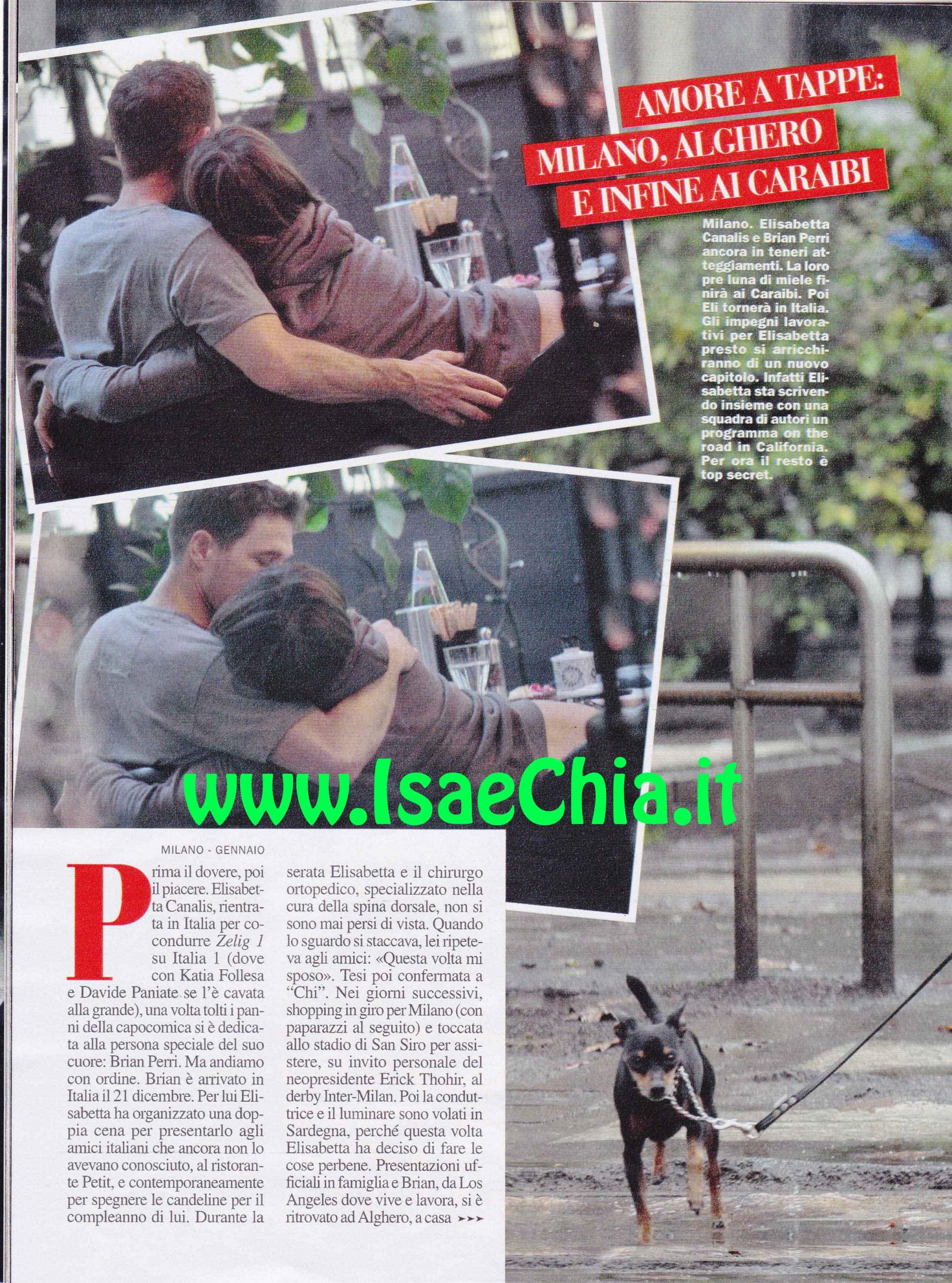 Elisabetta Canalis, rientrata in Italia per condurre Zelig 1, una volta tolti i panni della capocomica si è dedicata alla persona speciale del suo cuore: Brian Perri. Brian è arrivato in Italia il 21 dicembre e per lui Elisabetta ha organizzato una doppia cena per presentarlo agli amici italiani e contemporaneamente per spegnere le candeline per il compleanno di lui. Nei giorni successivi, shopping in giro per Milano e toccata allo stadio San Siro per assistere al derby Inter – Milan. Poi la conduttrice e il chirurgo sono volati in Sardegna, perché Elisabetta ha pensato di presentarlo alla famiglia: prima a zia Graziella e poi a mamma Bruna. L’ex velina ha portato Brian in spiaggia, a piedi scalzi, accompagnati dal fratello Luigi, la compagna e la coppia di pincher che non si separano mai dalla “mamma” e che si sono già affezionati a Brian. Infine, in attesa che Elisabetta torni a lavorare in Italia, la coppia avrà il tempo di farsi scaldare dal sole caraibico…