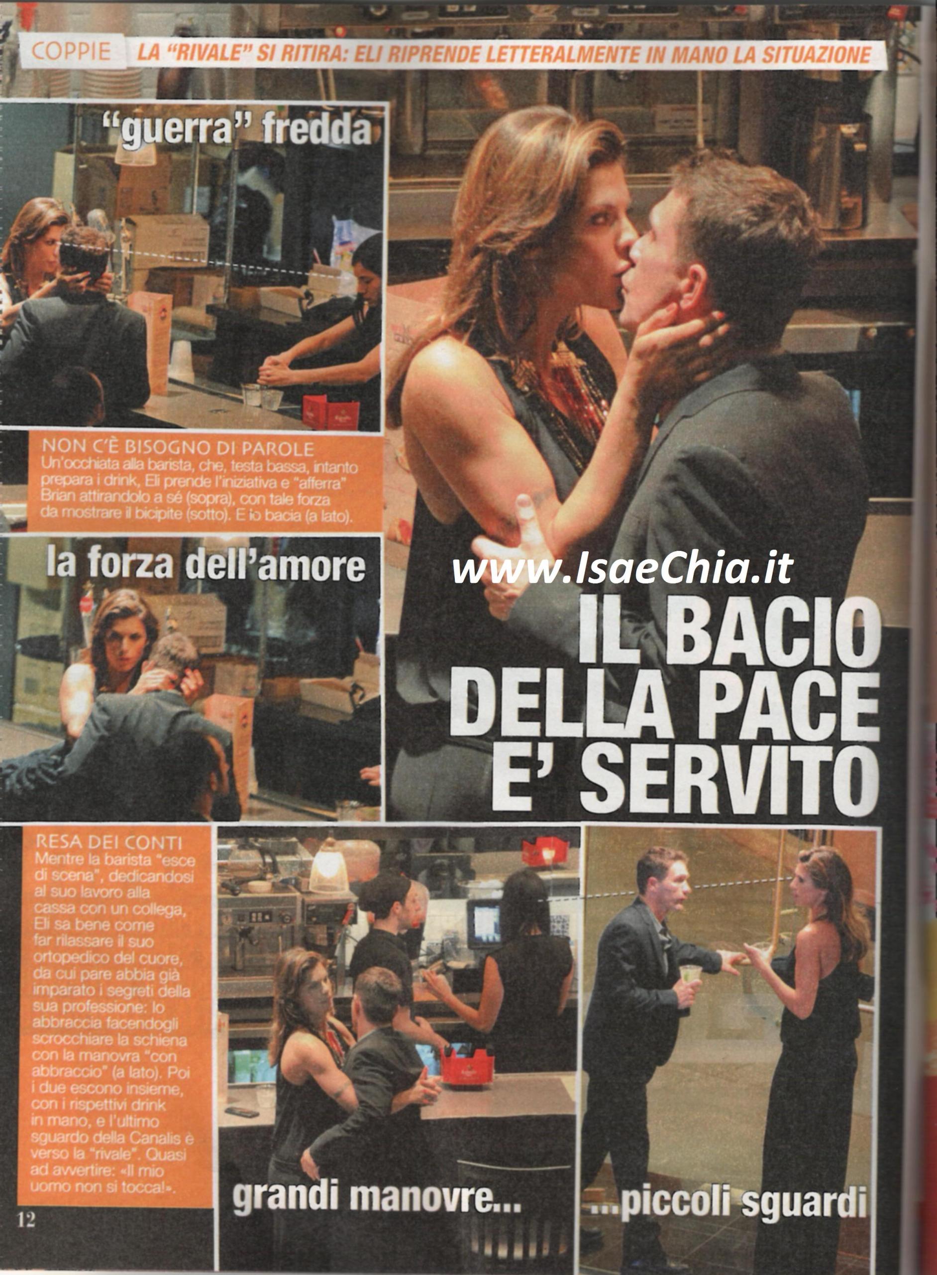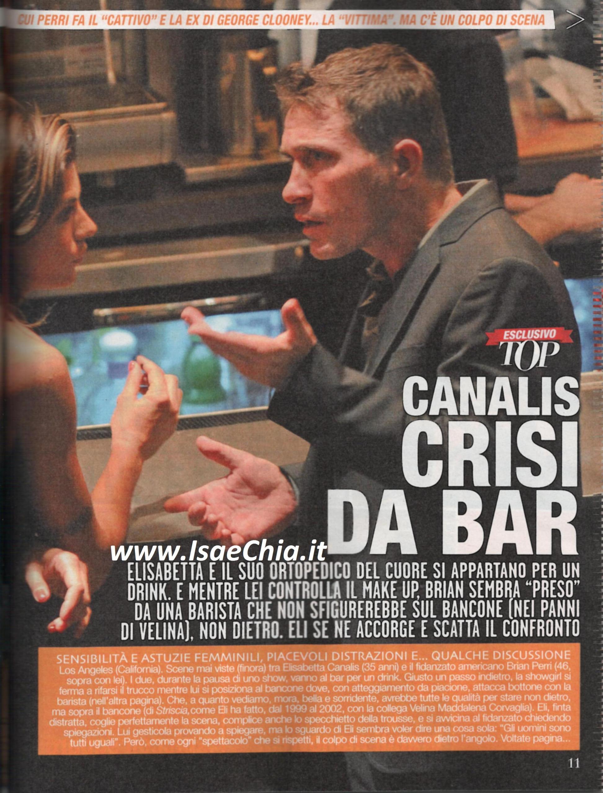 Scene mai viste tra la showgirl Elisabetta Canalis e il suo fidanzato Brian Perri: i due, durante la pausa di uno show, vanno al bar per un drink. Giusto un passo indietro, lei si ferma a ritoccare il trucco, mentre lui si posiziona sul bancone e attacca bottone con la barista. L’ex Velina coglie immediatamente la scena complice anche lo specchietto della trousse e si avvicina chiedendo spiegazioni, mentre il bel chirurgo cerca di giustificarsi. Eli lancia un’occhiataccia alla barista e poi afferra Brian portandolo verso di sé. Mentre la barista abbassa lo sguardo e si dedica ai cocktail, la bella sarda lo bacia e lo riconquista subito. Infine, lo abbraccia facendogli scrocchiare la schiena con una manovra. I due, infine, escono insieme, ma la Canalis non si risparmia l’ultimo sguardo alla rivale, come ad avvertire: “Il mio uomo non si tocca”.