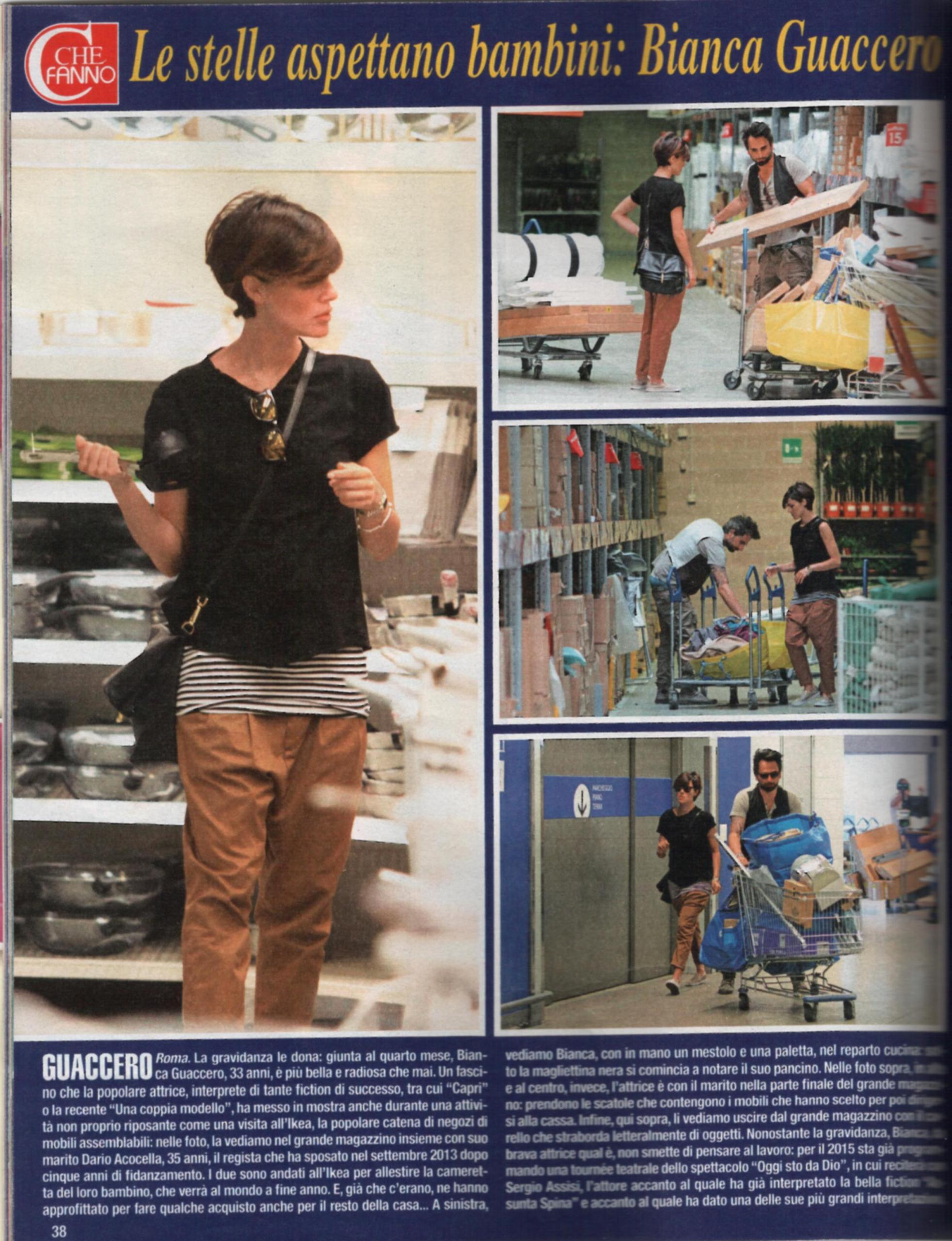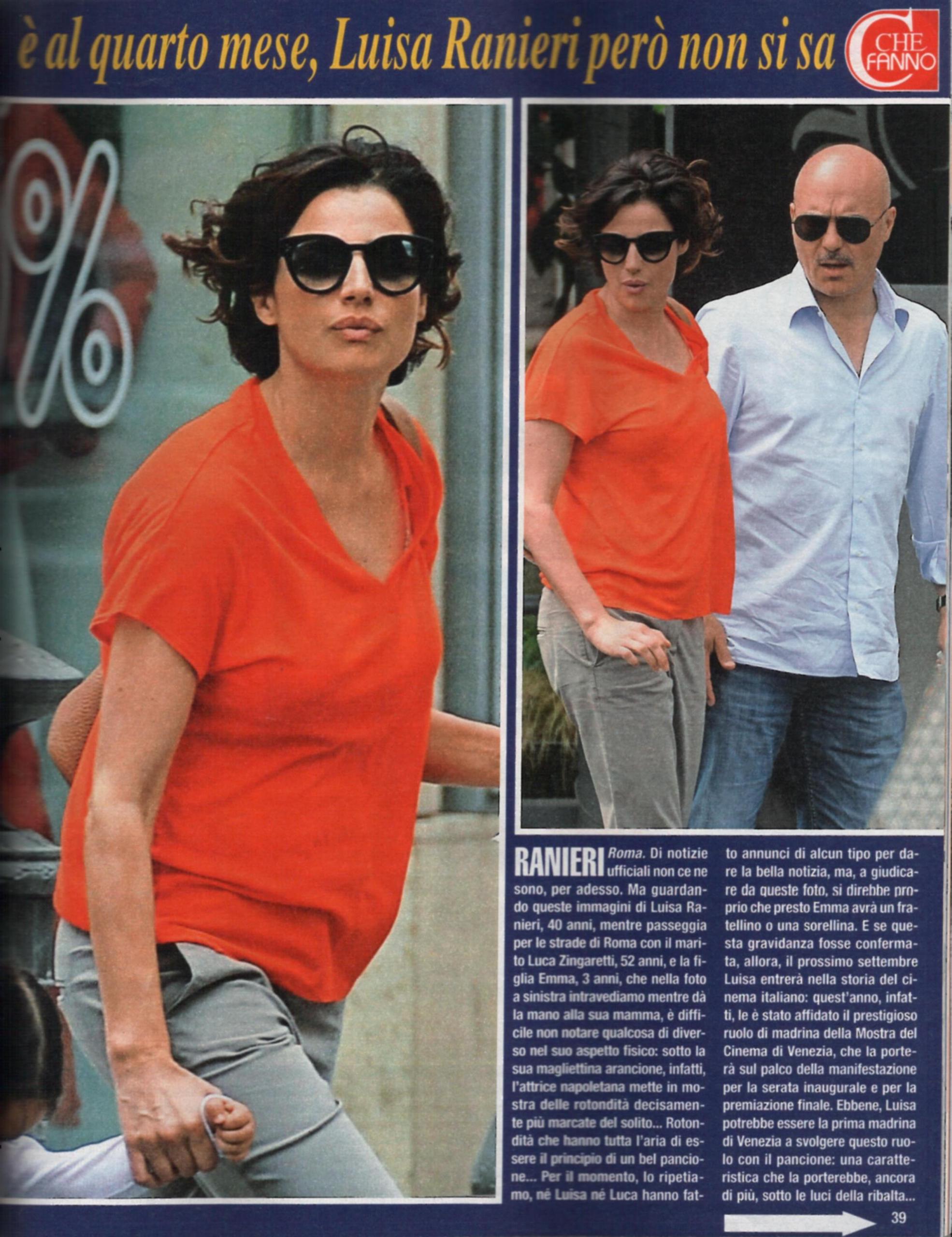 Nel frattempo, altre bellezze nostrane sono in attesa: l’attrice Bianca Guaccero è più radiosa che mai in queste foto all’Ikea con il marito Dario Acocella. Eccoli mentre riempiono il carrello fino all’orlo, dato che probabilmente staranno preparando la cameretta per il nascituro. Lei è sempre magrissima e il pancino al quarto mese è solo lievemente accennato. Inoltre, è già pronta per tornare al lavoro: nel 2015 sarà in tour con lo spettacolo teatrale Oggi sto da Dio, con Sergio Assisi. Di Luisa Ranieri, invece, non ci sono notizie ufficiali. Ma non è difficile ipotizzare qualcosa viste queste foto con una maglietta arancione che mostra rotondità più marcate del solito. Se fosse davvero in attesa di un fratellino o una sorellina per la piccola Emma, Luisa sarebbe la prima madrina della Mostra del Cinema di Venezia a svolgere questo ruolo col pancione.