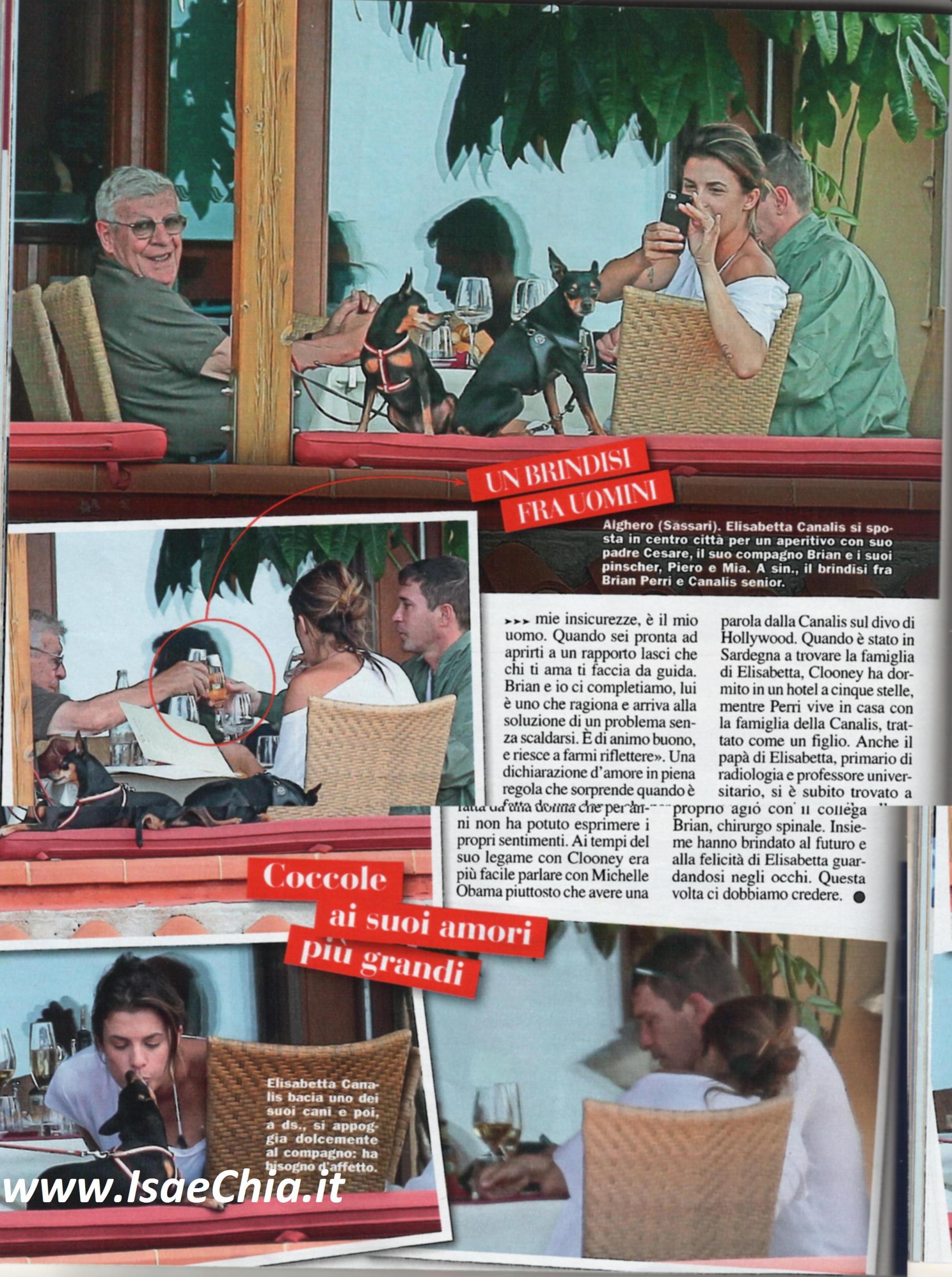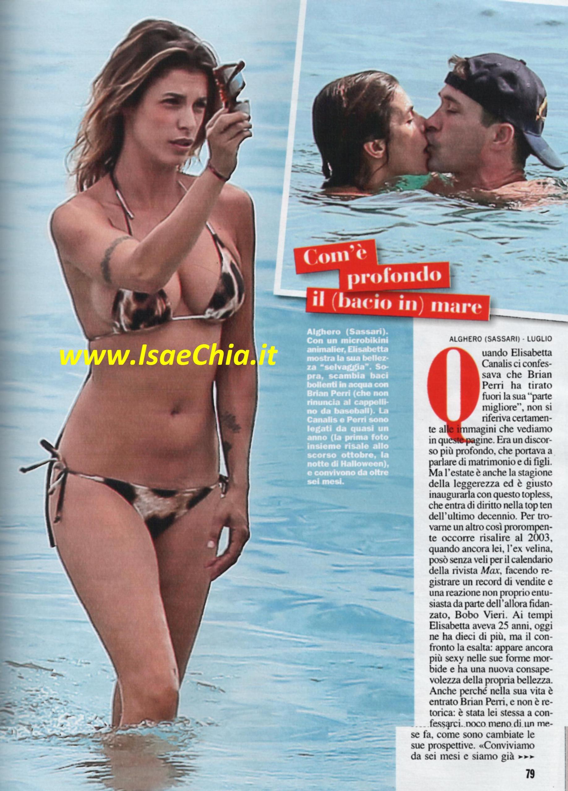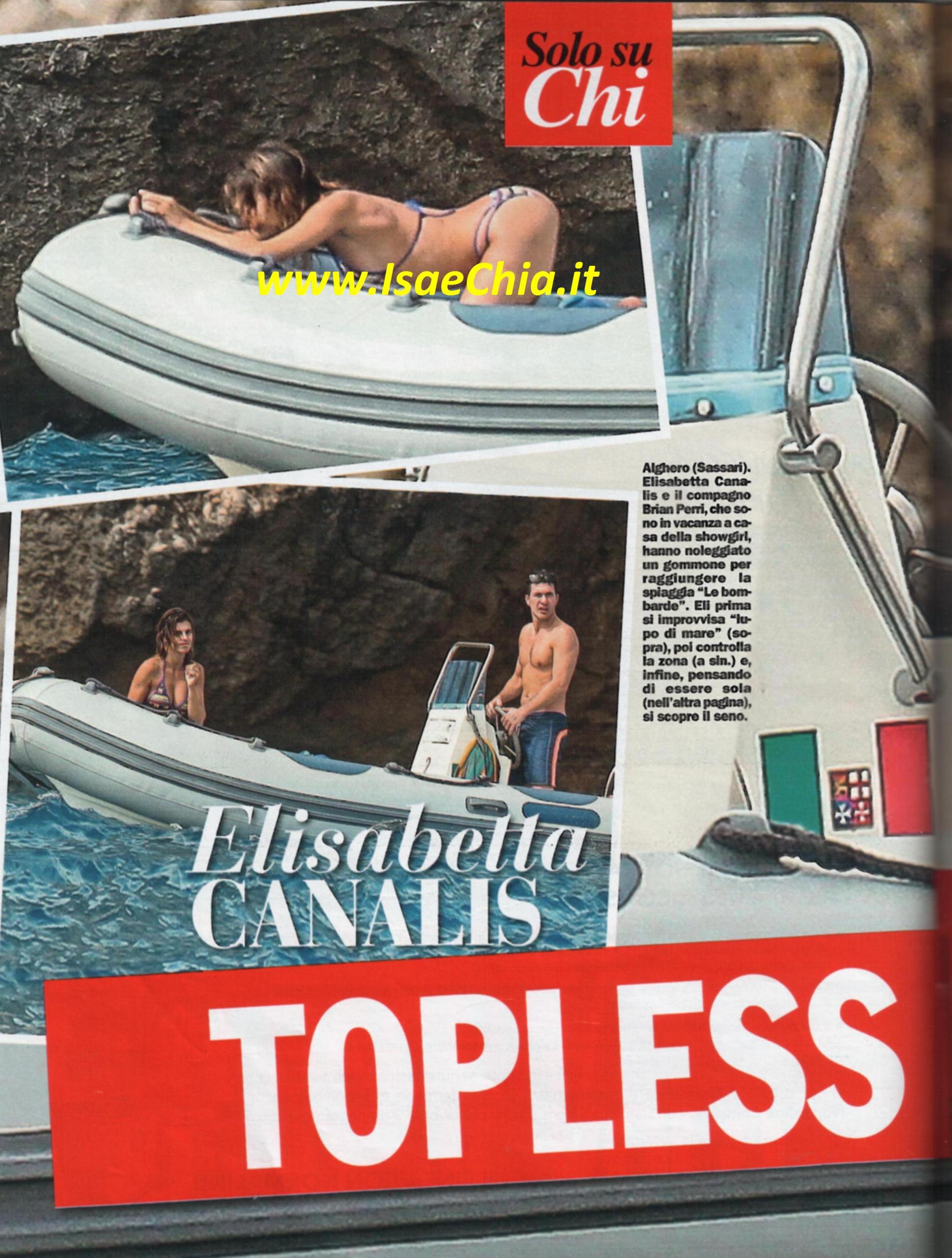 La showgirl Elisabetta Canalis ha recentemente dichiarare di aver perso il bambino di cui era incinta ancor prima di poter rivelare di essere in attesa. Adesso, però, l’ex Velina si è ripresa dal dolore e si gode l’estate. Eccola, infatti, insieme al compagno, il chirurgo statunitense Brian Perri, nella sua Sardegna. Eli si improvvisa lupo di mare e, con pose sexy come sempre, dirige il gommone che hanno noleggiato verso la spiaggia Le bombarde. Quando diceva che il suo nuovo fidanzato tirava fuori la parte migliore di sé, probabilmente si riferiva alla sua voglia di diventare moglie e mamma e non a quello che mostrano queste immagini. Eccola, infatti, mentre, illusasi di non esser spiata, si mette in topless, mostrando le stesse forme perfette di quando, dieci anni fa, posò per il calendario di Max. Poi si butta in acqua con Brian e si scambiano baci passionali. Infine, lui la prende in braccio e, uscendo dall’acqua, il bikini si sposta e lascia spazio alla visuale anche sul lato B! “Conviviamo da sei mesi, ci alziamo insieme all’alba, ci prepariamo per uscire e quando serve lo accompagno a lavoro. Ho sempre avuto bisogno di un uomo che si occupasse di me, mi sono scoperta un po’ mamma. Pensavo di non avere istinto materno, ma le cose sono cambiate. Con Brian è come se avessi già un figlio, ma lui può dire lo stesso di me” aveva dichiarato lei. “Ho trovato l’uomo che mi aiutasse a farmi superare le mie insicurezze. Ci completiamo: lui è uno che trova la soluzione ai problemi senza scaldarsi, è di animo buono, riesce a farmi riflettere”. Le cose, insomma, sembrano serie. Tant’è che Eli ha fatto conoscere Brian anche a suo padre, Cesare, che è suo collega, in quanto primario di radiologia e professore universitario. Ecco le foto dei tre insieme, accompagnati dagli immancabili cagnolini pincher.