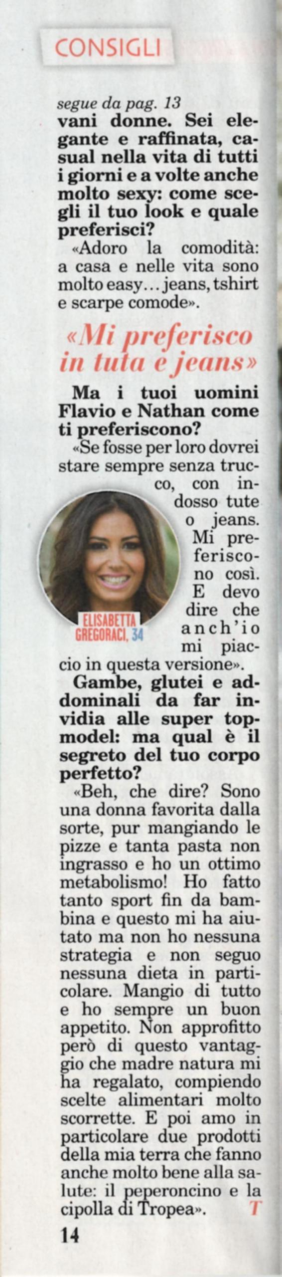 Da quando conduce Made in Sud, Elisabetta Gregoraci ha trovato la sua dimensione: “Sono estremamente felice, lo sbarco in prima serata ci ha portato molta fortuna. Ho cercato di mettere in evidenza lati della mia personalità che erano sconosciuti al pubblico e mi diverto ad interpretare i personaggi che sono stati costruiti per me. Ora sono una mamma di un bambino di 4 anni, ma anche una moglie presente e un’ex campionessa di karate che lavora in tv con molto impegno. Ma sono contenta soprattutto perché ho fondato la mia famiglia sui valori che mi sono stati trasmessi. Il personaggio di Wonder Woman mi rispecchia: faccio tante cose durante la giornata, non mi fermo un attimo e le mie amiche mi definiscono proprio così! Mi piace rivedermi in tv, credo sia utile per lavorare sulle mie performance”. Poi, dopo aver parlato di episodi di cronaca, come il caso dello scambio di embrioni all’ospedale Pertini di Roma, svela i segreti del suo fisico invidiabile: “Sono favorita dalla sorte: pur mangiando tanta pizza e pasta, non ingrasso e ho un ottimo metabolismo. Ho fatto tanto sport sin da piccola. Non seguo una dieta in particolare, ma non approfitto del dono della natura per fare scelte alimentari scorrette! Amo due prodotti della mia terra che fanno molto bene: il peperoncino e la cipolla di Tropea! In casa sono molto easy: jeans e scarpette. Mio figlio Nathan Falco e mio marito Flavio Briatore mi vorrebbero sempre così e anch’io devo dire che mi piaccio in questa versione”.