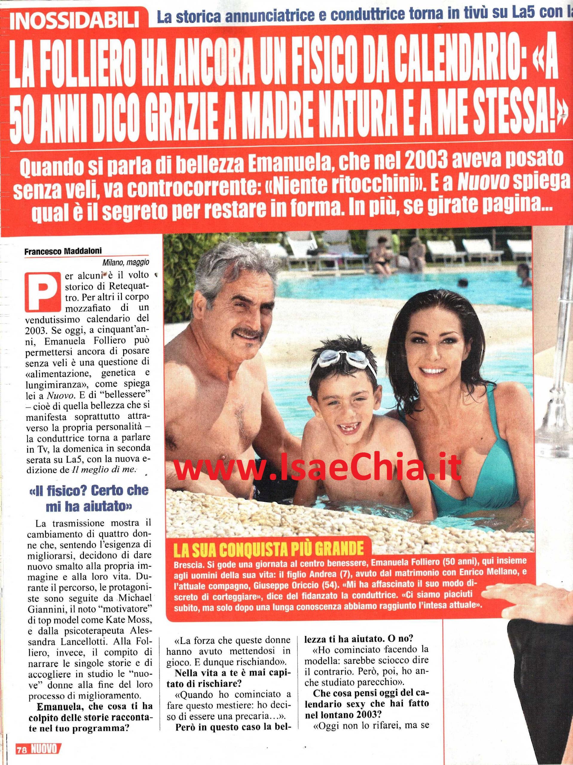 Per tutti noi, Emanuela Folliero è uno dei volti storici di Retequattro. Per molti, è il corpo mozzafiato del calendario di cui è stata protagonista nel 2003. “Alimentazione, genetica e lungimiranza” sono i segreti della sua splendida forma a 50 anni, secondo quanto lei dichiarato. Ed è proprio di bellezza e benessere che si occupa ora, nel programma Il meglio di me su La5, dove mostra il cambiamento di quattro donne che vogliono una nuova vita. “Di questo programma mi ha colpito la forza che queste donne hanno avuto mettendosi in gioco e rischiare. Nella mia vita ho rischiato quando ho deciso di fare questo mestiere: ho iniziato facendo la modella, sarebbe sciocco dire che non fossi precaria. Ma ho anche studiato parecchio. Il calendario sexy oggi non lo rifarei, ma se potessi tornare indietro, certo che sì. A vent’anni mi erano state offerte foto simili ma rifiutai, e feci bene: non sarei stata in grado di gestire il fatto di non avere una carriera alle spalle. Mi avrebbero etichettata e i miei mi avrebbero tolto la parola. A 37 anni, invece, non avevo bisogno di foto osé, ma mi convinse il progetto. Non ho mai seguito le mode: non ho tatuaggi e non ho fatto ricorso alla chirurgia estetica. Le cose definitive mi hanno sempre spaventata: non ho neanche i buchi alle orecchie! Il mio segreto è la genetica: non faccio sport, ma curo l’alimentazione“. Quando le si chiede com’è cambiata la televisione negli anni, la conduttrice risponde: “Spesso sfoglio una rivista e mi chiedo: ‘E questi chi sono?’. Uomini e Donne e programmi simili hanno generato una moltitudine di volti pseudo-noti, che ai miei tempi non c’era. Non amo la tv urlata e maleducata, mentre mi piace la fiction. Collaborerei con Alessia Marcuzzi, che è una persona carina, normale e di pancia; mi piacciono anche Antonella Clerici e Paola Perego, tutte un po’ ‘zie’, come me! Avevo fatto il provino per Mattino Cinque. Poi mi ha chiamato un giornalista per dirmi che era stata presa Federica Panicucci. In quel momento ero al supermercato e ho risposto: ‘Può richiamarmi tra un minuto, così pago?’. Non l’ha più fatto e ha scritto che avevo messo giù il telefono indispettita!“. Quando le si chiede, invece, come è cambiata lei, risponde: “Mi ha cambiato soprattutto la maternità. Mio figlio Andrea mi definisce ‘la mamma che non molla mai’. Ho sempre desiderato una favola domestica e ora sono la regina felice di una famiglia allargata. Il mio compagno Giuseppe non è una celebrità: gli uomini dello spettacolo non mi sono mai piaciuti e due fenomeni messi insieme non vanno bene!“.