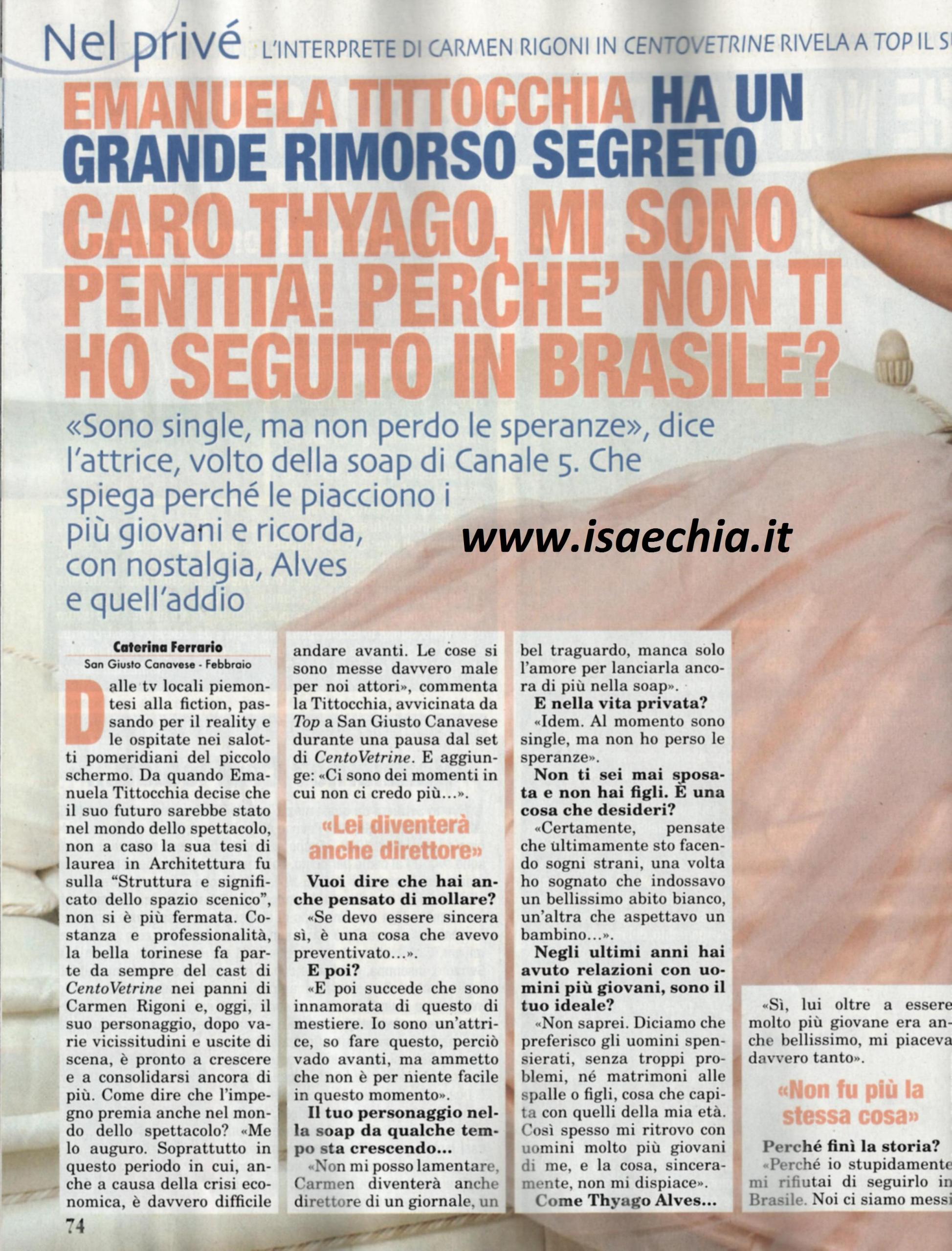 L’attrice di Centovetrine Emanuela Tittocchia confessa di essere pronta ad una svolta: “Mi auguro che l’impegno premi nel mondo dello spettacolo. A causa della crisi economica, le cose si sono messe davvero male per noi attori. Avevo preventivato anche la possibilità di mollare tutto, ma poi succede che sono innamorata di questo mestiere e perciò vado avanti. Il mio personaggio, Carmen, sta crescendo: diventerà direttrice di giornale. Nella vita privata, invece, sono single e sto perdendo le speranze. Ultimamente faccio sogni strani: una volta che aspettavo un bambino, un’altra in abito bianco…”. Quando le si fa notare, però, che ha avuto relazioni con uomini più giovani, dice: “Li preferisco spensierati, senza problemi, senza matrimoni alle spalle o figli, cosa che succede con gli uomini della mia età. E sinceramente non mi dispiace. Thyago Alves, oltre ad essere più giovane, era anche bellissimo. E’ finita perché non ho accettato di seguirlo in Brasile: avevo paura di perdere il lavoro. Ovviamente la distanza ci allontanò, e quando tornò, dopo mesi, non era più come prima. Ancora oggi mi pento: se potessi tornare indietro, partirei con lui. Poi ho avuto un’altra storia con un ragazzo giovane, finita per motivi futili”. Infine, rivela: “Ho rifiutato tante proposte indecenti. Succede così: vai al provino e il produttore di turno fa la solita battuta, ‘Prima, però, dovremmo conoscerci meglio’. Non ho mai ceduto, però ho avuto una relazione con un uomo potente, non per interesse, ma perché mi piaceva tantissimo. Qualche occasione me l’ha creata, ma altre le ho perse proprio perché, stando con lui, non mi facevo avanti per evitare equivoci. Non ho mai avuto un vero pigmalione: sono arrivata qui contando solo su me stessa”.