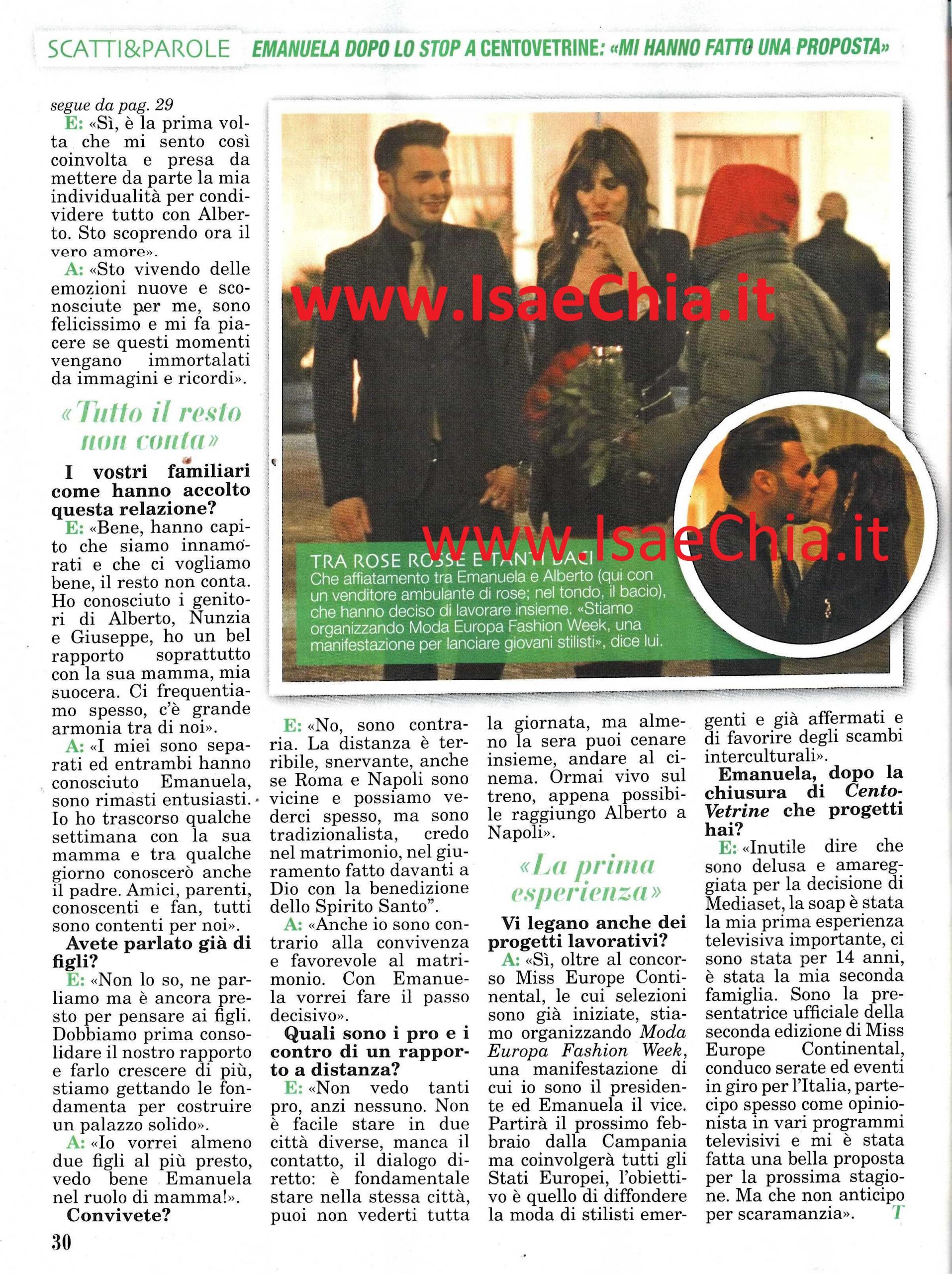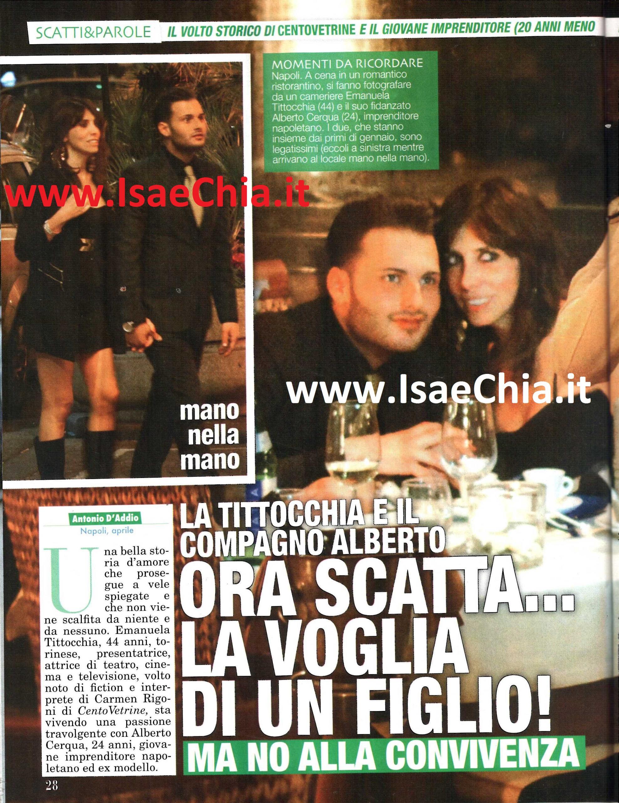 L’attrice Emanuela Tittocchia è amata dal pubblico soprattutto per il ruolo interpretato a lungo nella soap CentoVetrine, che da poco ha chiuso i battenti. Dal punto di vista sentimentale, però, sta vivendo un momento molto sereno, dato che il rapporto con Alberto Cerqua, l’imprenditore napoletano di vent’anni più giovane, procede nel migliore dei modi. “Non c’è stato il classico colpo di fulmine. Ci siamo conosciuti quando ho condotto la serata finale di Miss Europe Continental, concorso ideato da lui. Ero concentrata sul lavoro, ma mi avevano colpito la sua serietà e la sua precisione. Qualche mese dopo, fui invitata al suo compleanno e ci andai con piacere. Lì mi accorsi che mi piaceva, provavo una strana attrazione nei suoi confronti. Tornai a Napoli qualche giorno dopo per presentare delle serate e ci incontrammo e mi propose di accompagnarmi a Roma. Era la vigilia di Natale, si fermò lì e trascorremmo anche il Natale insieme. Da allora non ci siamo più lasciati. A Capodanno mi ha detto parole dolcissime: che per la prima volta stava trascurando il lavoro per una donna” racconta lei, mentre lui dichiara: “Io, invece, sono rimasto subito colpito da lei. Ho visto delle qualità che non avevo mai riscontrato in nessuna ragazza che avevo frequentato finora: avevo incontrato la donna della mia vita!“. Quando si chiede loro se pesa la differenza d’età, la risposta di lei è: “Assolutamente no. All’inizio c’è stato qualche dubbio, ma adesso non la avverto. Alberto, pur avendo 24 anni, è una persona che dà sicurezza, è protettivo, risolutivo, l’età non conta. Mi ha conquistata con la sua sicurezza, so che di lui mi posso fidare. Io con le mie paure, le mie incertezze, le mie ansie, sono più istintiva. Io non ho avuto tante storie, la mia inclinazione è essere single e non ho mai pensato al plurale, ma ora sono totalmente presa da Alberto” mentre lui dice: “Quando l’ho incontrata, non le ho chiesto l’età. Poi, quando l’ho saputa, ho pensato a uno scherzo. Emanuela porta i suoi anni splendidamente e ha lo spirito di una ragazzina!“. E i familiari? Come hanno accolto questa relazione? “Bene, hanno capito che siamo innamorati e che ci vogliamo bene, il resto non conta. Ho conosciuto i genitori di Alberto e ho un bel rapporto soprattutto con la mamma: ci frequentiamo spesso, c’è grande armonia tra noi” dice lei, mentre lui aggiunge: “I miei sono separati ed entrambi hanno conosciuto Emanuela e sono rimasti entusiasti. Io ho trascorso qualche settimana con la sua mamma e tra qualche giorno conoscerò anche il padre. Amici, parenti, conoscenti e fan, sono tutti contenti per noi!“. Quando si chiede se nei loro progetti ci sono anche dei figli, i due rispondono: “Non ne parliamo ancora, è ancora presto. Dobbiamo prima consolidare il nostro rapporto e farlo crescere, stiamo gettando le fondamenta per costruire un palazzo solido” dice lei, mentre lui aggiunge: “Io vorrei almeno due figli al più presto, la vedo bene nel ruolo di mamma!“. Intanto, però, i due hanno deciso di non convivere ancora, ma vivono il loro rapporto a distanza: “Sono contraria alla convivenza. La distanza è terribile e snervante, anche se Napoli e Roma sono vicine e possiamo vederci spesso, ma sono tradizionalista. Credo nel matrimonio e nel giuramento fatto davanti a Dio. Nel rapporto a distanza non c’è nessun pro, manca il contatto, il dialogo diretto. E’ fondamentale stare nella stessa città, almeno cenare insieme la sera. Ormai vivo sul treno e appena posso lo raggiungo a Napoli” e lui conferma: “Anche io sono contrario alla convivenza e favorevole al matrimonio. E con Emanuela vorrei fare il passo decisivo“. Inoltre, i due hanno anche dei progetti lavorativi insieme: “Inutile dire che sono delusa e amareggiata dalla scelta di Mediaset: la soap è stata la mia prima esperienza televisiva importante. Oltre al concorso Miss Europe Continental, di cui sono iniziate le selezioni e di cui ora sono vice-presidente, conduco serate ed eventi in tutta Italia. Partecipo spesso in vari programmi come opinionista ed è arrivata una bella proposta per la prossima stagione, ma non la anticipo per scaramanzia“.