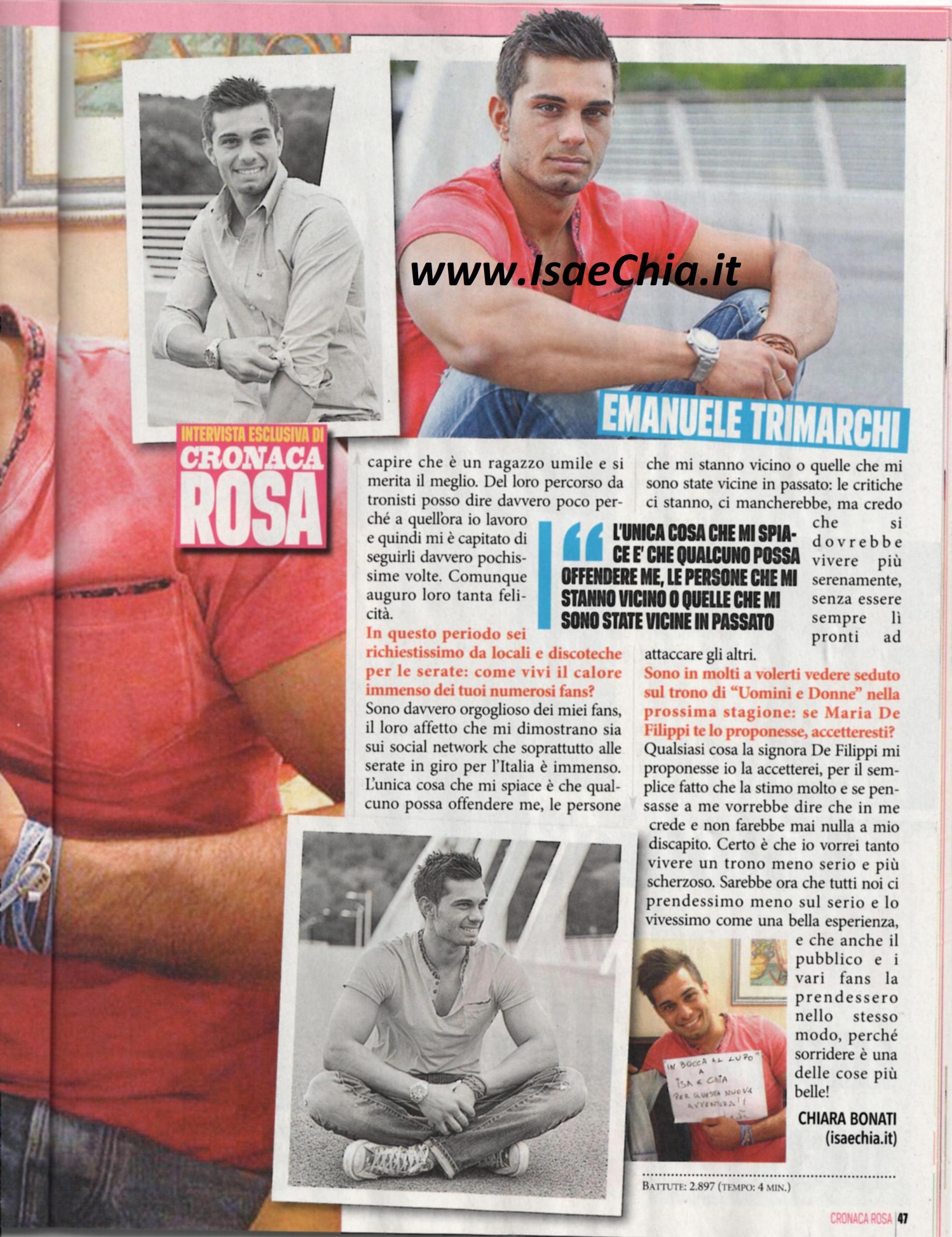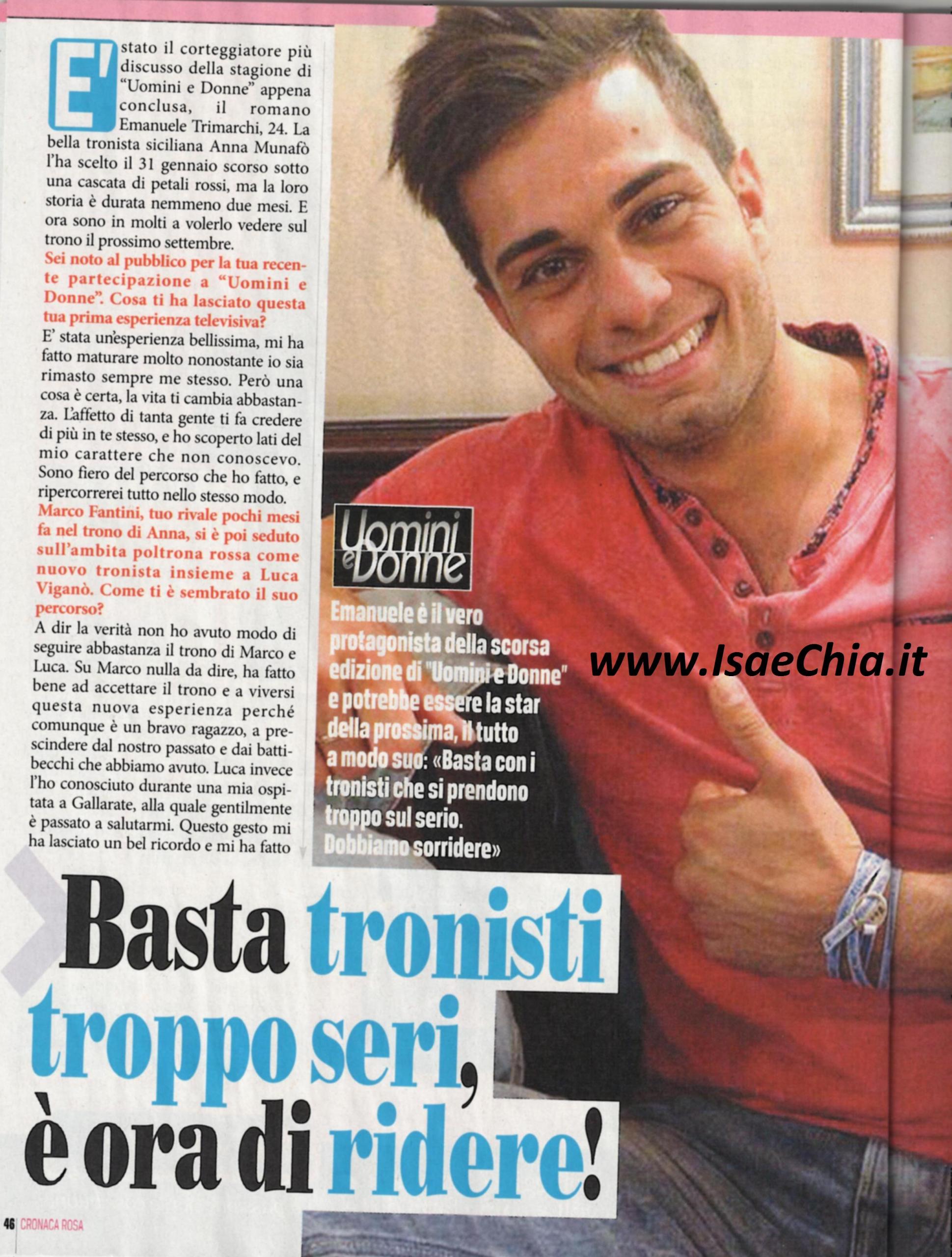 Nonostante la sua storia con Anna Munafò sia durata meno di due mesi, il corteggiatore Emanuele Trimarchi commenta così la sua esperienza a Uomini e donne: “E’ stata un’esperienza bellissima, mi ha fatto maturare molto nonostante io sia rimasto sempre me stesso. Però l’affetto della gente ti fa credere di più in te stesso e ho scoperto lati del mio carattere che nemmeno conoscevo. Sono fiero del percorso che ho fatto e rifarei tutto allo stesso modo”. Quando la nostra Chiara Bonati, che lo ha intervistato, gli chiede se ha seguito il trono del suo “rivale” Marco Fantini, risponde: “In verità non ho avuto modo di seguire molto. Marco ha fatto bene ad accettare il trono, è un bravo ragazzo a prescindere dai battibecchi che abbiamo avuto. Luca Viganò, invece, l’ho conosciuto durante una mia ospitata a Gallarate, durante la quale è passato a salutarmi. Questo gesto mi ha lasciato un bel ricordo e mi ha fatto capire che è un ragazzo umile, che merita il meglio”. Quanto al post-Uomini e donne, racconta: “Sono orgoglioso dei miei fan e dell’affetto che dimostrano. L’unica cosa che mi dispiace è che qualcuno possa offendermi: ci stanno le critiche, ma credo che si dovrebbe vivere più serenamente, senza attaccare gli altri. Il trono? Qualsiasi cosa mi proponesse Maria De Filippi, accetterei perché vorrebbe dire che in me crede e nulla sarebbe fatto a mio discapito. Certo è che vorrei vivere un trono meno serio e più scherzoso. Sarebbe ora che ci prendessimo meno sul serio e lo vivessimo come una bella esperienza, e che il pubblico e i fan lo vivessero nello stesso modo: sorridere è una delle cose più belle!”