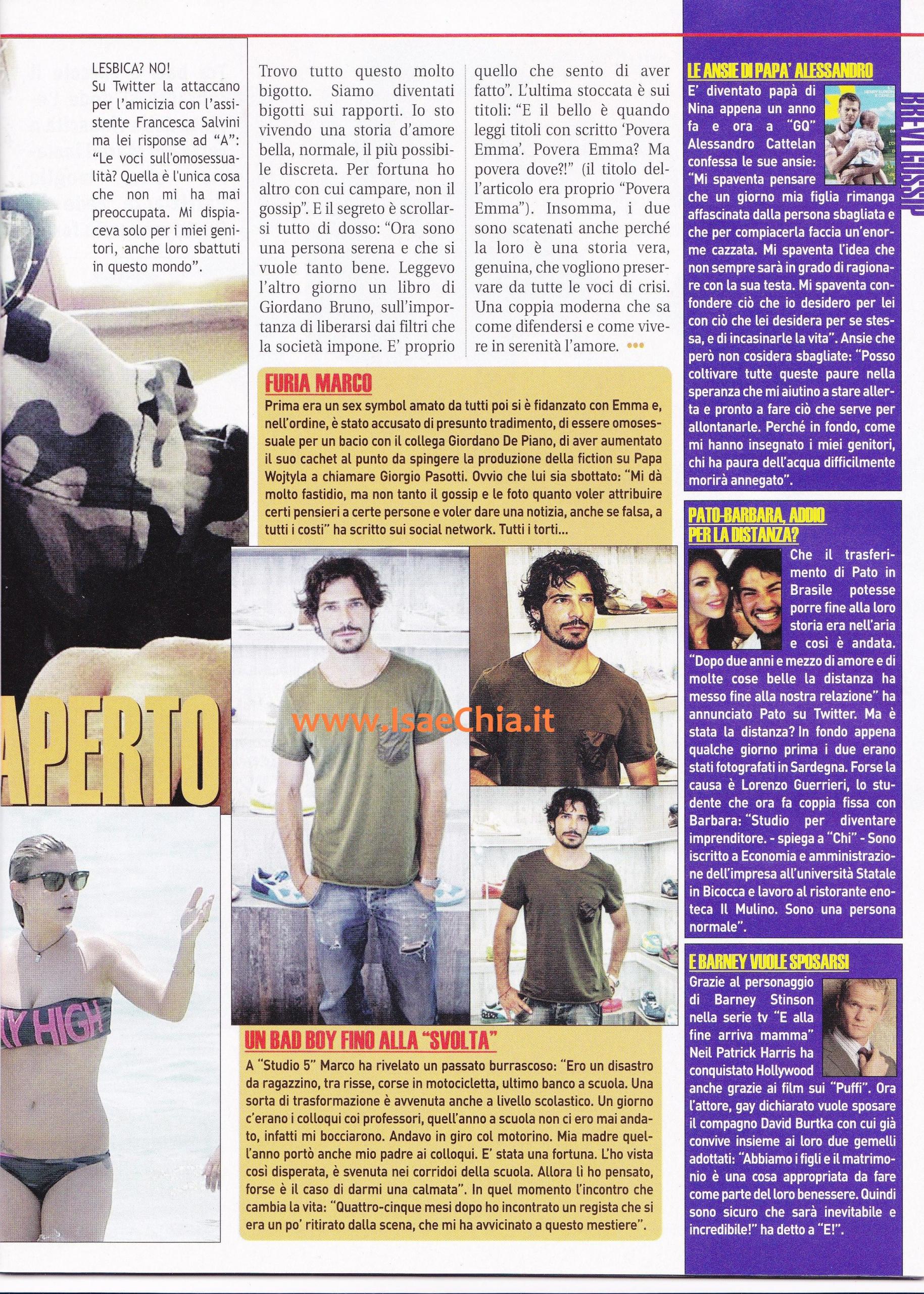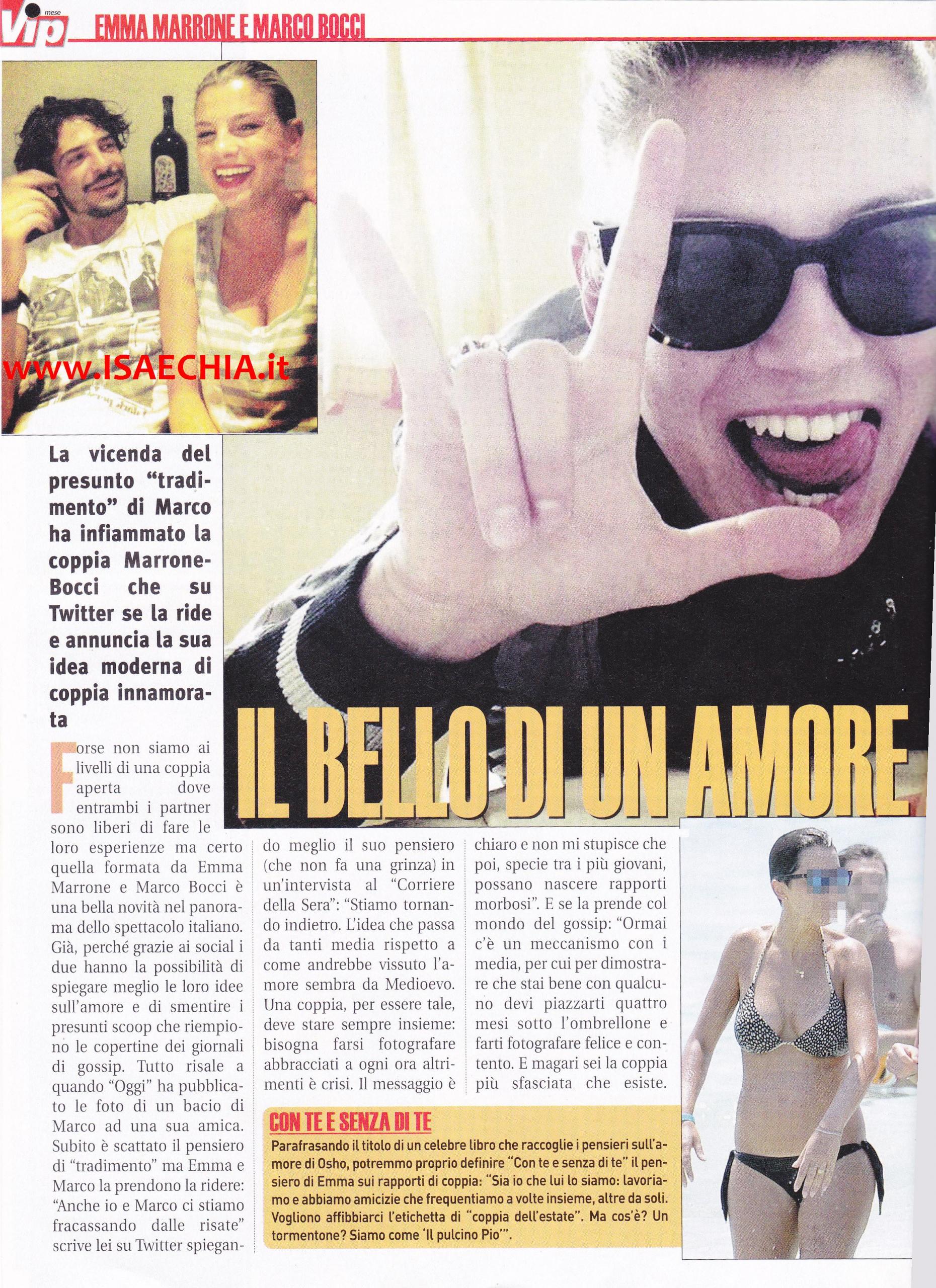 Forse non siamo ai livelli di una “coppia aperta” dove entrambi i partner sono liberi di fare le esperienze che vogliono, ma si può certo dire che Emma Marrone e Marco Bocci siano una novità per il panorama italiano. In un primo momento, lui viene fotografato vicino ad un’altra ed Emma scrive su Twitter: “Io e Marco ci stiamo fracassando dalle risate”, smentendo che si tratti di un tradimento. Poi, lei va in vacanza con le amiche e si insinua che la stella di Amici possa avere una relazione omosessuale con l’amica Francesca Salvini: “Le voci che io sia lesbica sono l’unica cosa che non mi hanno mai preoccupata. Mi dispiace solo per i miei genitori, anche loro sbattuti in questo mondo” ha commentato lei. Infine, ha spiegato: “Siamo tornati indietro al Medioevo? Una coppia per essere tale deve farsi fotografare sempre insieme, altrimenti è in crisi! Non mi stupisce che poi, specialmente tra i giovani, possano nascere rapporti morbosi. C’è un meccanismo per cui i media, per farti stare bene con qualcuno, devono piazzarti per 4 mesi con quella persona sotto l’ombrellone. Trovo questo molto bigotto: io sto vivendo una storia normale, bella, il più possibile discreta e ho altro con cui campare”.