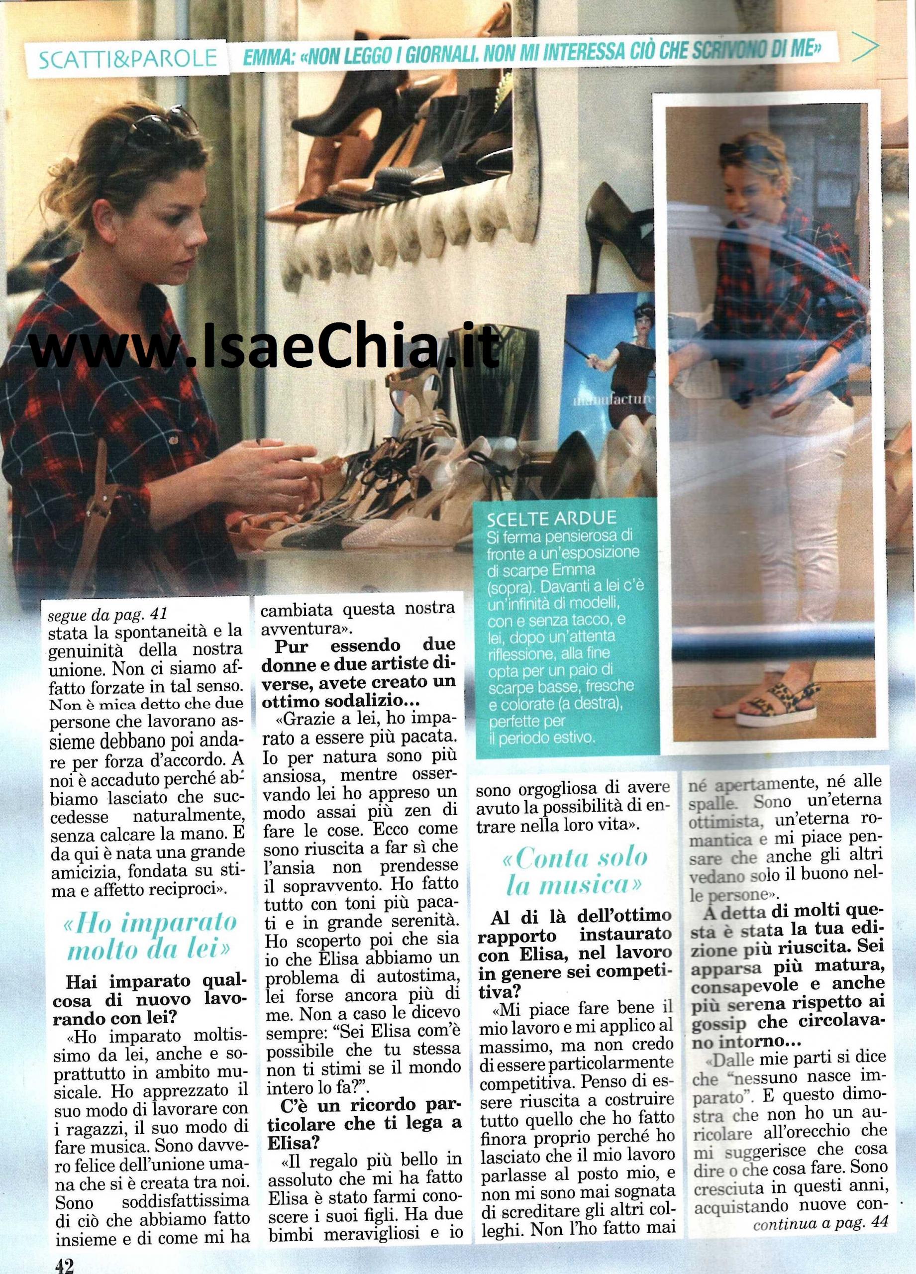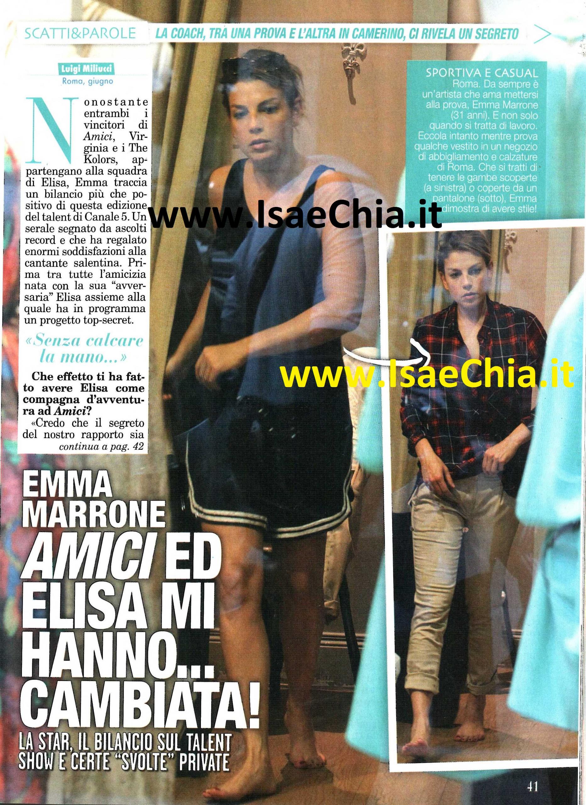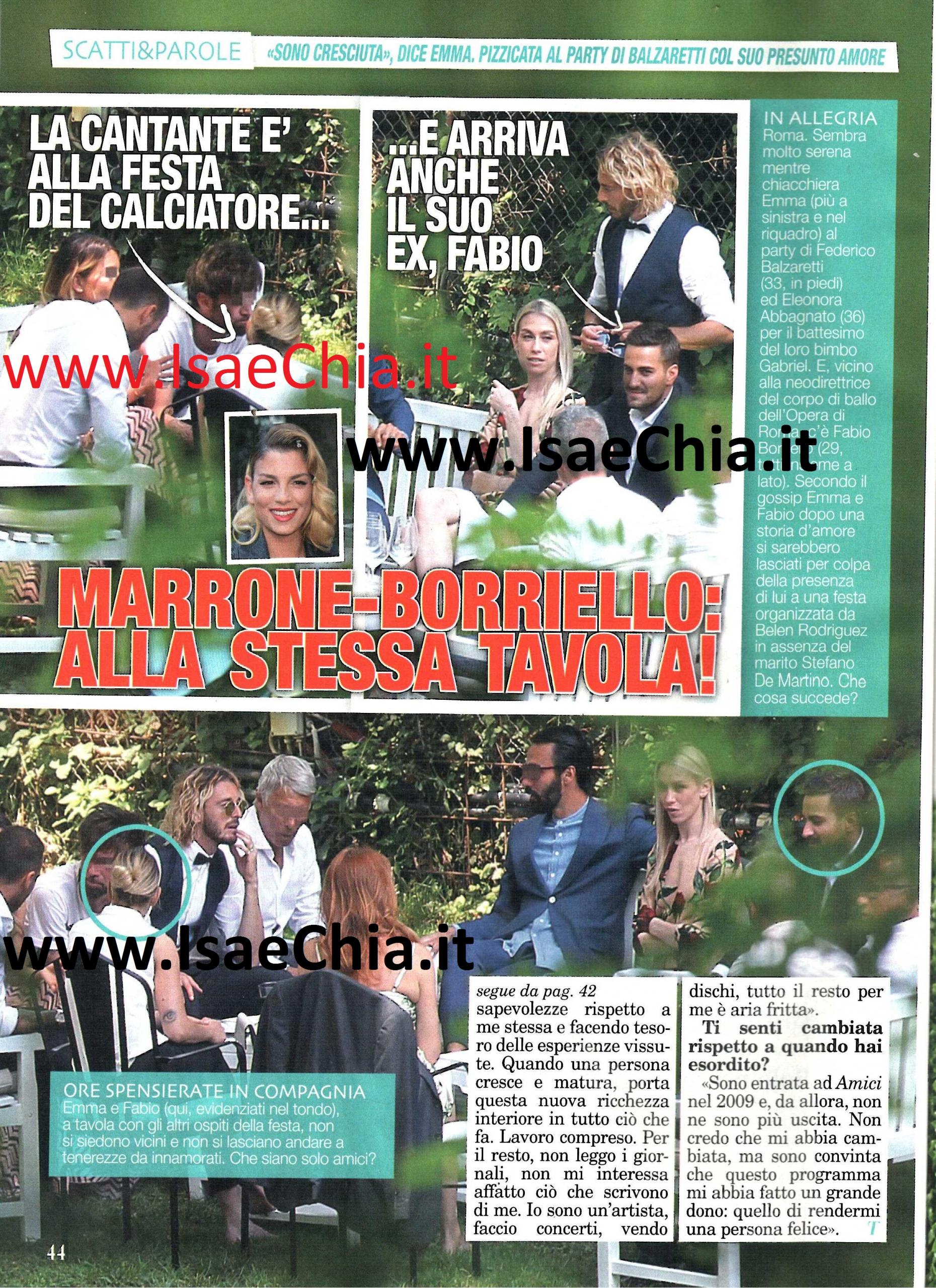 Negli scorsi giorni vi abbiamo finalmente mostrato le prime foto inequivocabili e decisamente hot di Emma Marrone insieme al suo attuale fidanzato, Fabio Borriello (QUI per rivedere il post). Adesso, il settimanale Top l’ha beccata di nuovo in compagnia del bel napoletano, e non solo! Eccoli, infatti, a Roma, al party organizzato dal calciatore Federico Balzaretti e dalla ballerina ed ex coach di Amici Eleonora Abbagnato per il battesimo del loro bimbo Gabriel. I due hanno cercato di non dare nell’occhio e di non far rubare i soliti scatti indiscreti ai paparazzi: Fabio stava seduto vicino alla Abbagnato, neo-direttrice del corpo di ballo dell’Opera di Roma, mentre Emma sta rigorosamente di spalle ai punti critici. Intervistata, la coach della Squadra bianca, è stata come al solito sibillina sulla sua vita privata, mentre ha parlato volentieri di un altro rapporto speciale, quello con la sua ‘rivale’ ad Amici, la cantante Elisa: “Credo che il segreto del nostro rapporto sia stata la spontaneità della nostra unione: non ci siamo forzate in tal senso. Non è detto che due persone che lavorano insieme debbano per forza andare d’accordo. A noi è successo perché abbiamo lasciato che accadesse naturalmente. Da qui è nata una grande amicizia. Ho imparato moltissimo da lei, soprattutto in campo musicale. Ho apprezzato il suo modo di lavorare con i ragazzi, il suo modo di fare musica. Sono soddisfattissima di ciò che abbiamo fatto insieme e di come mi ha cambiata questa avventura. Grazie a lei ho imparato ad essere più pacata: lei è un po’ zen in tutto e come lei ho imparato a non farmi prendere dall’ansia. Ho scoperto che anche lei ha un problema di autostima, forse più di me. Ma il regalo più bello che mi abbia fatto è stato farmi conoscere i suoi figli“. E infatti, a detta di molti, questa è stata l’edizione più matura di Emma, apparsa sicuramente più serena rispetto al gossip che, come sempre, le girava attorno: “Dalle mie parti si dice che ‘nessuno nasce imparato’. E questo dimostra che non ho un auricolare nell’orecchio che mi dice cosa fare: sono cresciuta in questi anni, acquistando nuove consapevolezze rispetto a me stessa e facendo tesoro delle esperienze vissute. Quando una persona cresce e matura, porta questa nuova ricchezza interiore in tutto ciò che fa, lavoro compreso. Per il resto, io non leggo i giornali, non mi interessa cosa dicono di me. Sono un’artista, faccio concerti, vendo dischi e il resto è aria fritta. Sono entrata ad Amici nel 2009 e da allora non ne sono più uscita. Questo programma mi ha fatto un grande dono: quello di rendermi una persona felice” ha dichiarato lei.