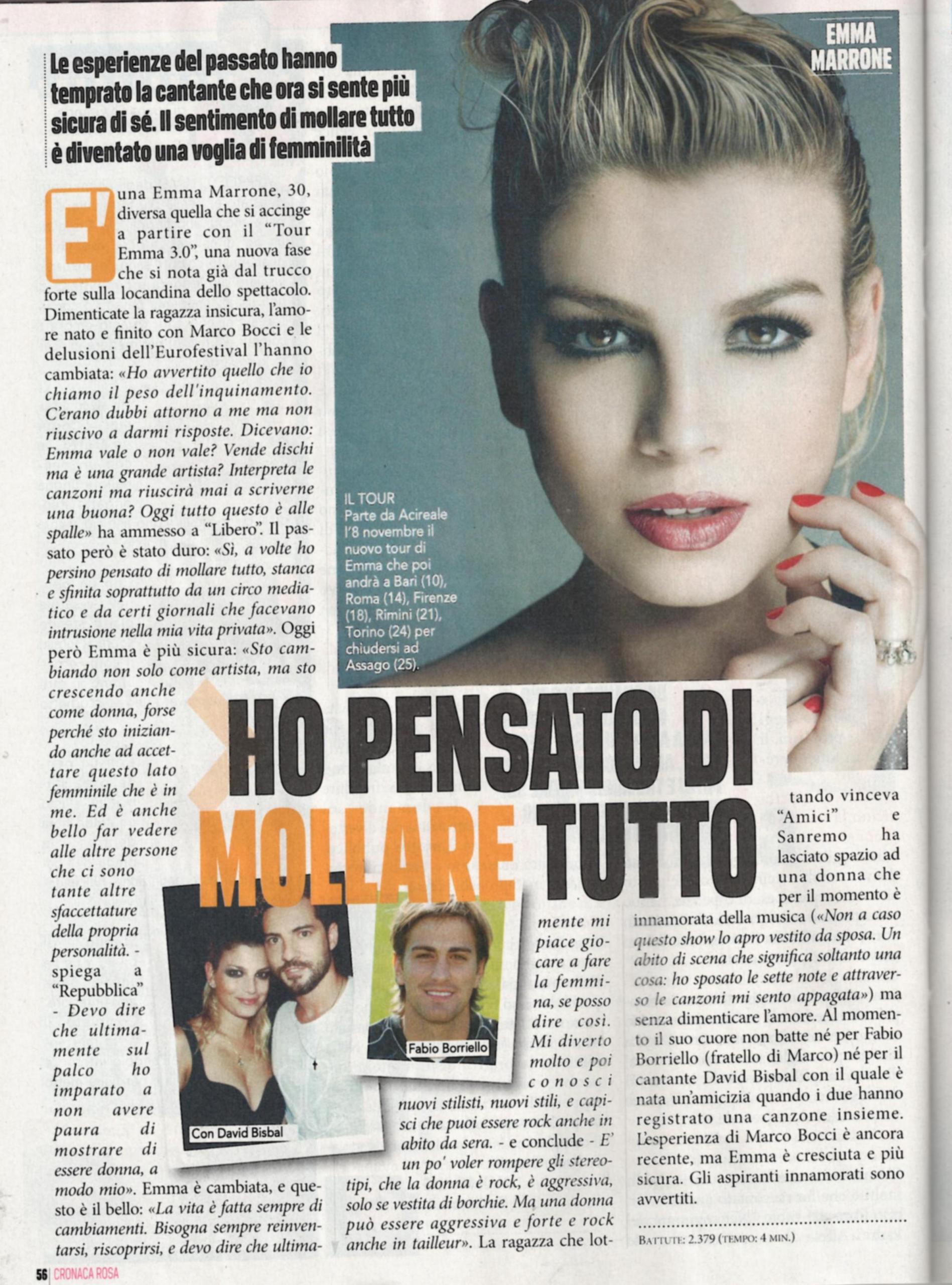 Emma Marrone si accinge a ripartire in concerto per l’Italia con il suo Emma Tour 3.0: ha messo da parte le delusioni d’amore e l’insuccesso all’Eurofestival per dedicarsi completamente alla sua passione: “Ho avvertito quello che chiamo il peso dell’inquinamento: c’erano dubbi intorno a me e non riuscivo a darmi risposte. Dicevano “Emma vale o non vale? Vende dischi, ma è una grande artista? Riuscirà mai a scrivere una canzone buona?” A volte ho anche pensato di mollare tutto, stanca e sfinita del circo mediatico e dei giornali che facevano sempre intrusione nella mia vita privata” confessa la stella di Amici. “Sto cambiando non solo come artista, ma anche come donna, forse perché sto iniziando ad accettare questo lato femminile che è in me e far vedere che ci sono tante sfaccettature della propria personalità. Ho imparato a non avere paura di mostrare di essere donna sul palco. La vita è fatta di cambiamenti, bisogna reinventarsi, riscoprirsi e devo dire che ultimamente mi piace giocare a fare la femmina. Mi diverto molto, e poi conosci nuovi stili, capisci che puoi essere rock anche in abito da sera o in tailleur”. Così, smentendo i flirt con il calciatore Fabio Borriello (fratello di Marco) e con il cantante David Bisbal, rivela che il suo unico amore è la musica: “Non a caso apro il concerto vestita da sposa. Un abito da scena che ha significato solo una cosa: ho sposato le sette note e attraverso la musica mi sento appagata”.