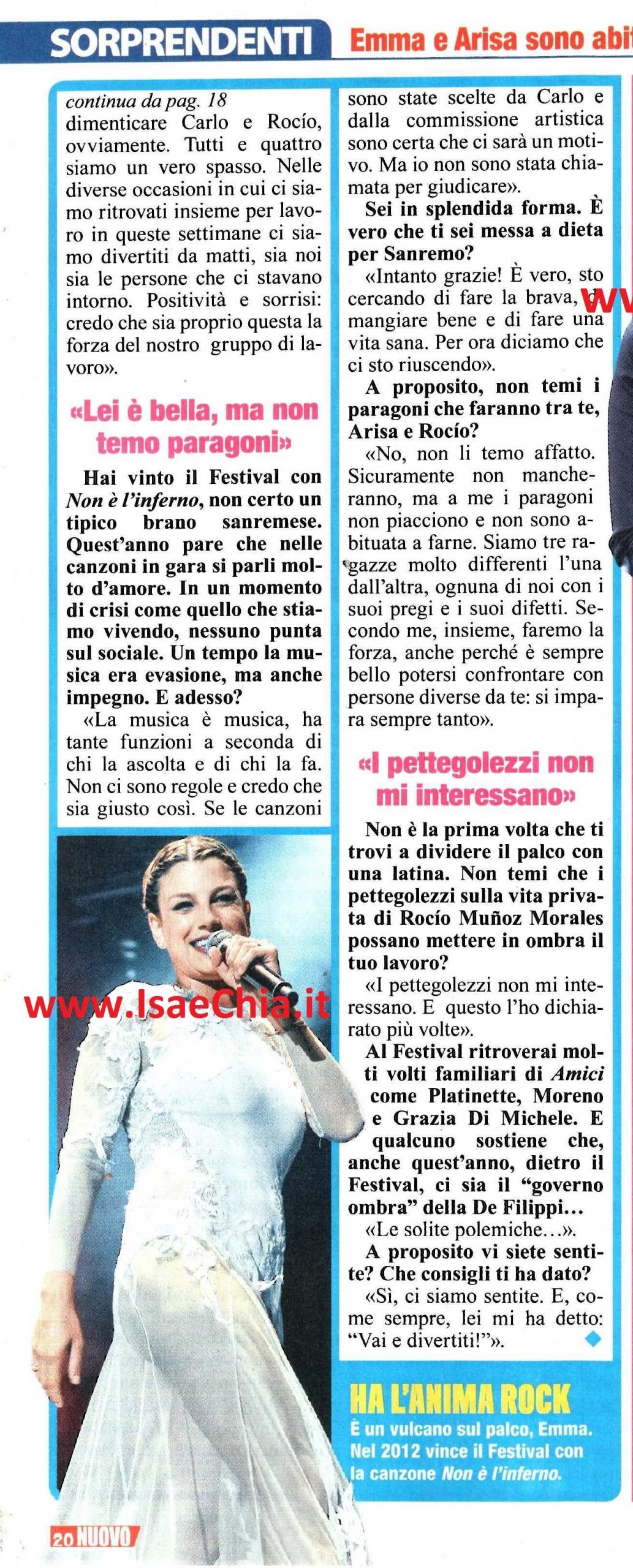 Ieri sera Emma Marrone ha debuttato nel suo inedito ruolo di valletta al fianco di Carlo Conti per la 65esima edizione del Festival di Sanremo. Qualche giorno fa, alla vigilia del Festival, la vincitrice di Amici 2010 ha raccontato: “Sono in fibrillazione e non vedo l’ora. Sono molto emozionata e al contempo piena di entusiasmo. In questi giorni abbiamo tantissime cose a cui pensare, dettagli da curare…Sarà una settimana impegnativa ma ci divertiremo da matti e spero che trasmetteremo questo spirito positivo anche al pubblico a casa. Il duetto con Arisa? Non sarò certo io a svelare la sorpresa. Guardate e scoprirete“. Il mistero è stato svelato: già durante la prima serata le due cantanti hanno duettato sulle note di Il carrozzone di Renato Zero. Quando le si chiede cosa deve aspettarsi il pubblico da due cantanti del Sud come lei e Arisa, Emma risponde: “Siamo due ragazze toste, con dei bei caratterini e credo che insieme saremo forti. Senza dimenticare Carlo e Rocio Munoz Morales, chiaramente: tutti e quattro insieme siamo un vero spasso: quando ci siamo incontrati, ci siamo divertiti tanto da matti, così come le persone che ci stavano intorno. Positività e sorrisi: credo sia proprio questa la forza del nostro gruppo di lavoro“. Quest’anno le canzoni di Sanremo parlano quasi tutte d’amore, poco di temi sociali come il brano che la portò alla vittoria, Non è l’inferno. Quando glielo si fa notare, Emma risponde: “La musica è musica, ha tante funzioni, a seconda di chi la ascolta e di chi la fa. Trovo sia giusto così. Se le canzoni sono state scelte da Carlo e la commissione, sono certa che ci sarà un motivo; io non sono stata chiamata a giudicare“. Quando si nota che è in splendida forma e le si chiede se è perché si sente in competizione con Arisa e soprattutto con la bellezza di Rocio, Emma risponde: “Grazie! Sto cercando di fare la brava, mangiare bene e fare una vita sana. Diciamo che per ora ci sto riuscendo. I paragoni non mancheranno, ma non mi piacciono e non li temo. Siamo tre ragazze molto differenti l’una dall’altra, ognuna con i propri pregi e difetti. Insieme faremo la forza perché è bello confrontarsi con persone diverse da te e si impara tanto. Non m’interessa del gossip sulla vita privata di Rocio; i pettegolezzi non m’interessano e l’ho dichiarato più volte“. Infine, quando le si chiede cosa pensa della forte presenza di persone legate al talent show di Maria De Filippi, Amici, che ha lanciato anche lei, come Moreno, Grazia Di Michele, Annalisa e i Dear Jack, la bella salentina risponde: “Le solite polemiche! Ho sentito Maria e, come sempre, mi ha detto ‘Vai e divertiti’!“.