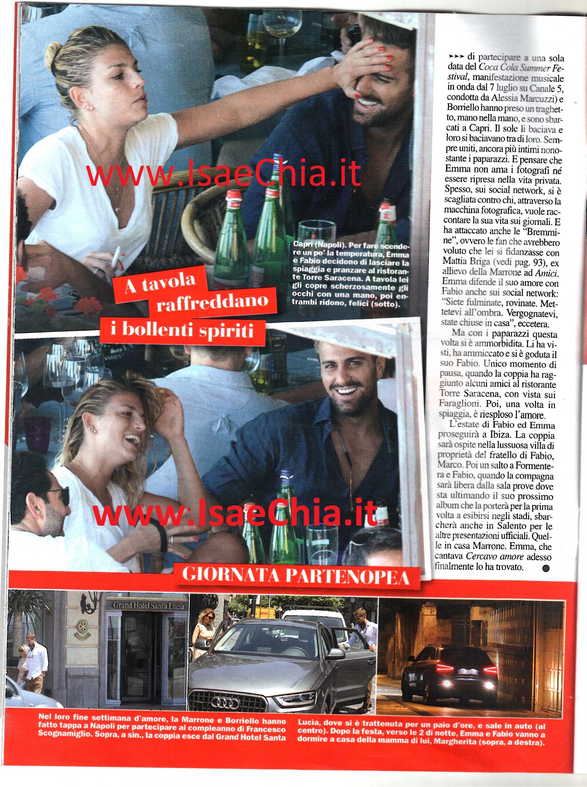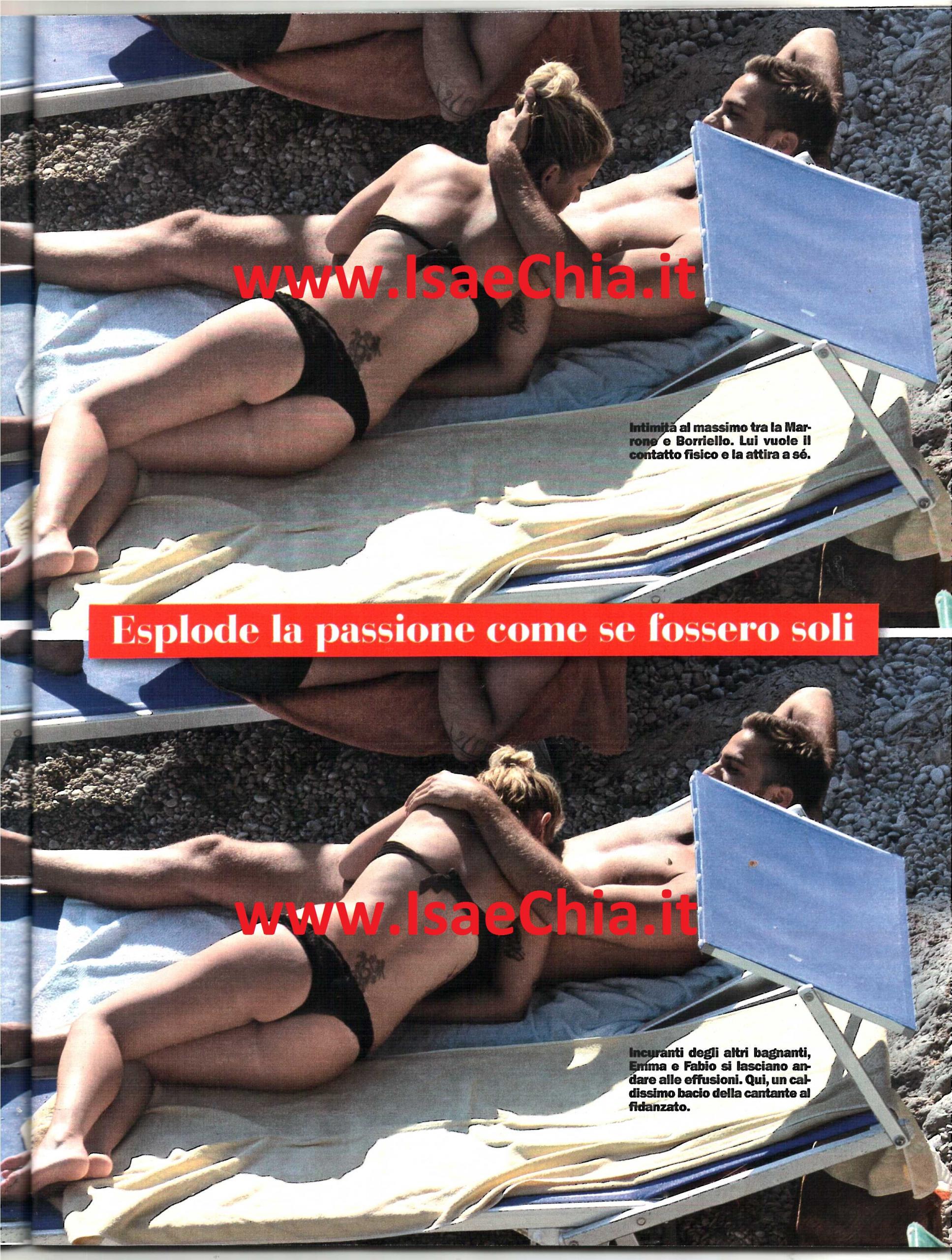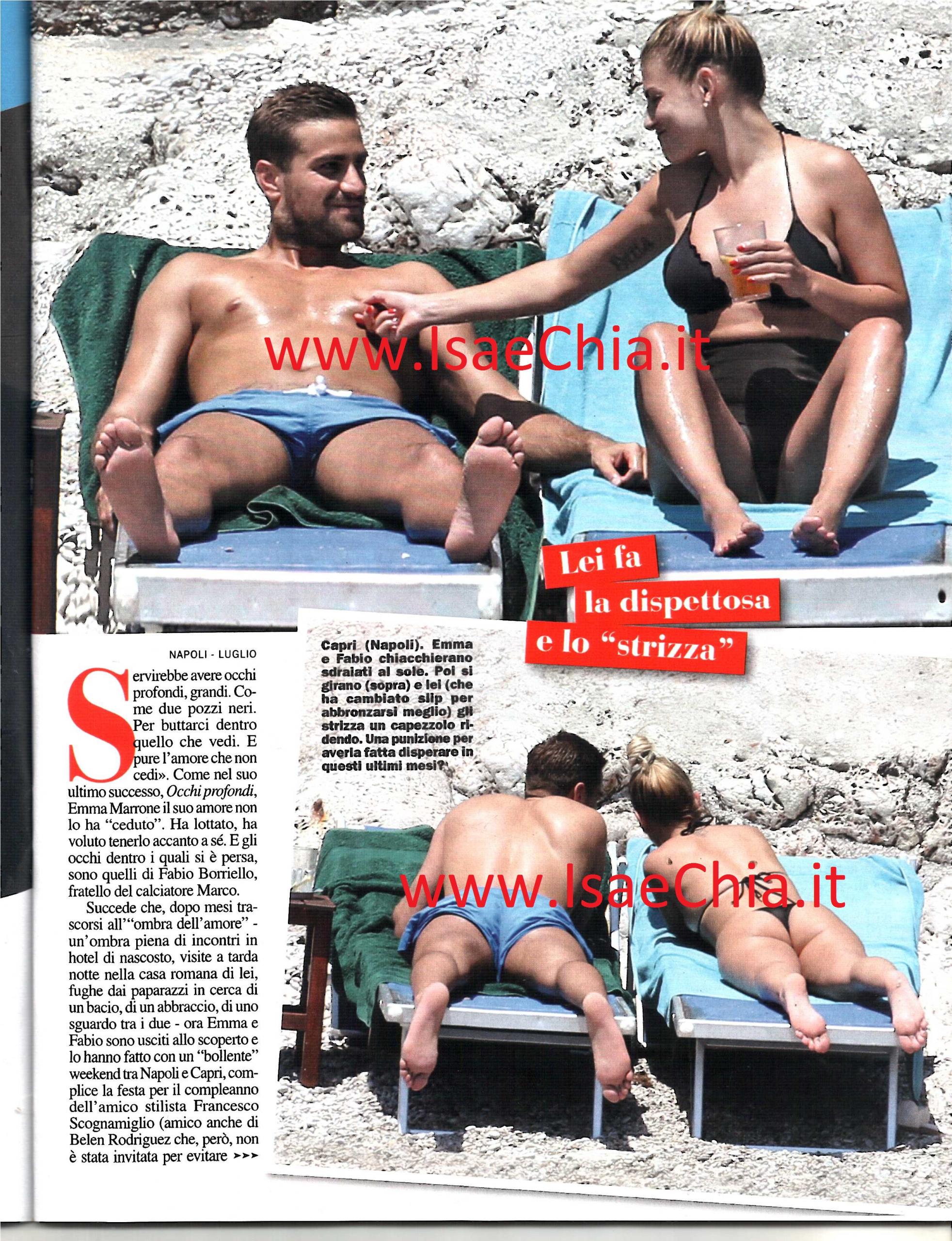 Scene inedite e incredibilmente hot per Emma Marrone. Siamo abituati a vederla sempre un po’ trasgressiva e molto passionale in amore, ma sempre molto discreta sulla sua vita privata. E infatti, fino ad ora aveva mantenuto il massimo riserbo sulla sua storia con Fabio Borriello, fratello del più noto calciatore Marco. Così, dopo mesi trascorsi nell’ombra, i due escono alla luce del sole…In ogni senso! Il settimanale Chi ha pubblicato delle foto dei due durante un weekend bollente trascorso tra Napoli e Capri. I due si sono goduti le bellezze del capoluogo campano prima in auto, poi in sella alla Vespa di lui e poi sono andati in gioielleria a comprare un regalo per il compleanno del ‘cognato’ Marco. Le presentazioni in famiglia erano state già fatte: Emma ha conosciuto la signora Margherita già la scorsa estate ad Ibiza. Venerdì sera, i due erano ad un altro compleanno, quello dell’amico stilista Francesco Scognamiglio. Durante la festa, la cantante, in sexy abito nero e smalto rosso, si è scatenata coi balli, mentre Fabio ha tenuto un profilo basso. Dopo, Emma avrebbe dovuto incontrare l’amica e ‘collega coach’ di Amici, Elisa, che però ha avuto un imprevisto. Ma ciò che sorprende di più non è questo, bensì i giorni successivi. Il giorno dopo, la Marrone, che per godersi il suo amore ha scelto di partecipare a una sola data del Coca Cola Summer Festival, ha preso un traghetto per Capri con Fabio. Eccoli, infatti, mentre si scambiano, baci e coccole, come mai li avevamo visti prima. Ad un certo punto, Fabio si fa prendere dalla passione, vuole il contatto fisico e la attira su di sé. Incuranti degli altri bagnanti, Emma gli dà un bacio in una zona un po’ hot, giusto sotto la pancia…E i fotografi onnipresenti non se lo lasciano sfuggire! E pensare che Emma non ama che la sua vita privata venga esposta! In passato si era scagliata anche contro le Bremmine, ossia le fan che speravano si fidanzasse con il concorrente di Amici Mattia Briga, scrivendo: “Siete fulminate, rovinate. Mettetevi all’ombra. Vergognatevi, state chiuse in casa” sarebbero state le sue parole. Questa volta, invece, si è lasciata andare. Dopo aver dato il meglio di sé in spiaggia, i due tornano nel lussuoso albergo, in attesa della vacanza che li vedrà insieme nella proprietà di Marco a Ibiza, poi a Formentera e forse in Salento, dove faranno le presentazioni anche in casa Marrone!