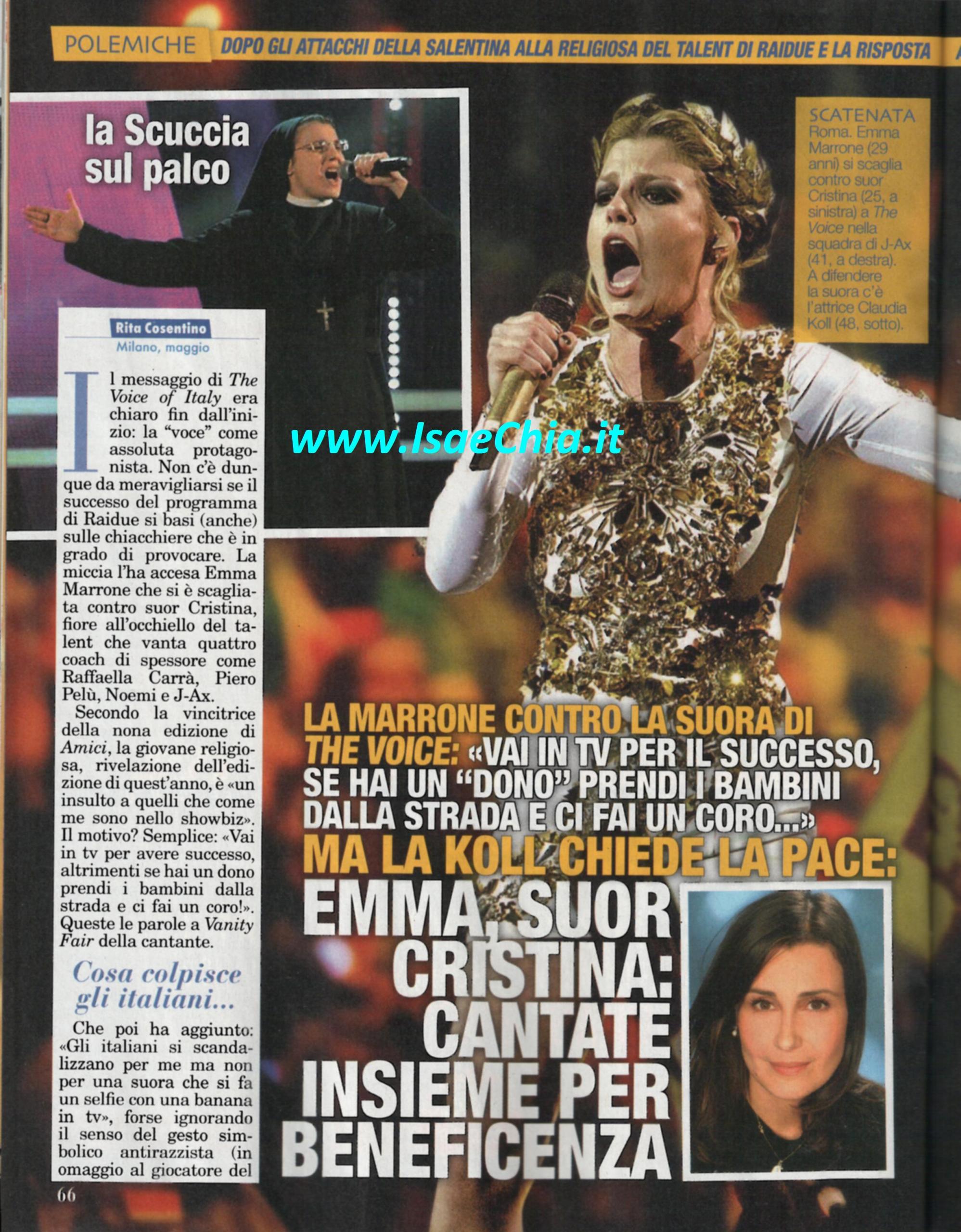 La stella di Amici Emma Marrone ha commentato negativamente la partecipazione di Suor Cristina Scuccia a The Voice: “E’ un insulto a quelli che, come me, sono nello showbiz. Vai in tv per avere successo, altrimenti se hai un dono, prendi i bambini dalla strada e ci fai un coro!” e poi ha aggiunto: “Gli Italiani si scandalizzano per me, ma non per una suora che si fa un selfie con una banana in mano”, ignorando il fatto che il suo fosse un gesto antirazzista. Il coach di Suor Cristina, J-Ax, ha commentato ironicamente dopo una delle sue esibizioni: “Questo è showbiz! I soliti hater pensano che per fare i rocker bisogni avere i pantaloni strettissimi, ma sono le loro menti ad essere strette!”. Emma ha precisato: “L’insulto allo showbiz non è una suora, ma chi pensa che nessuno abbia un messaggio da portare in tv”.